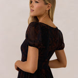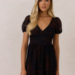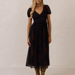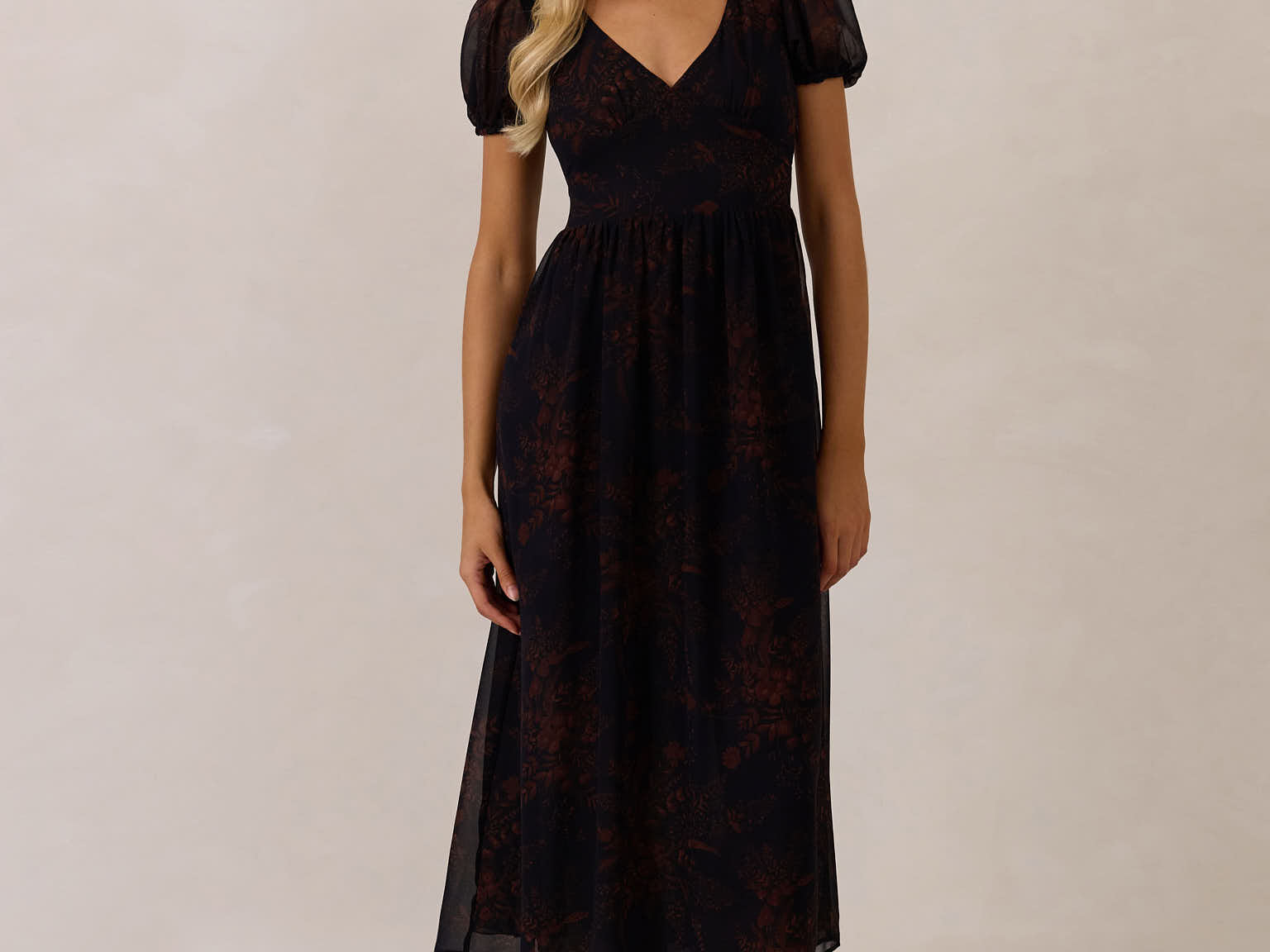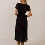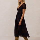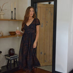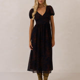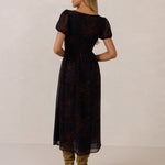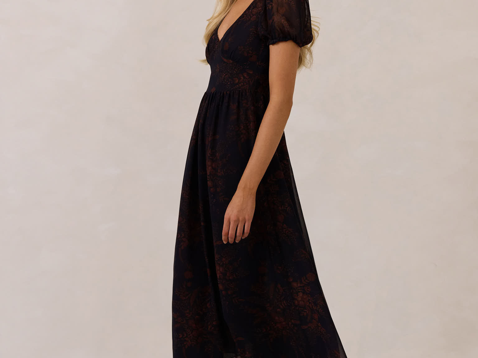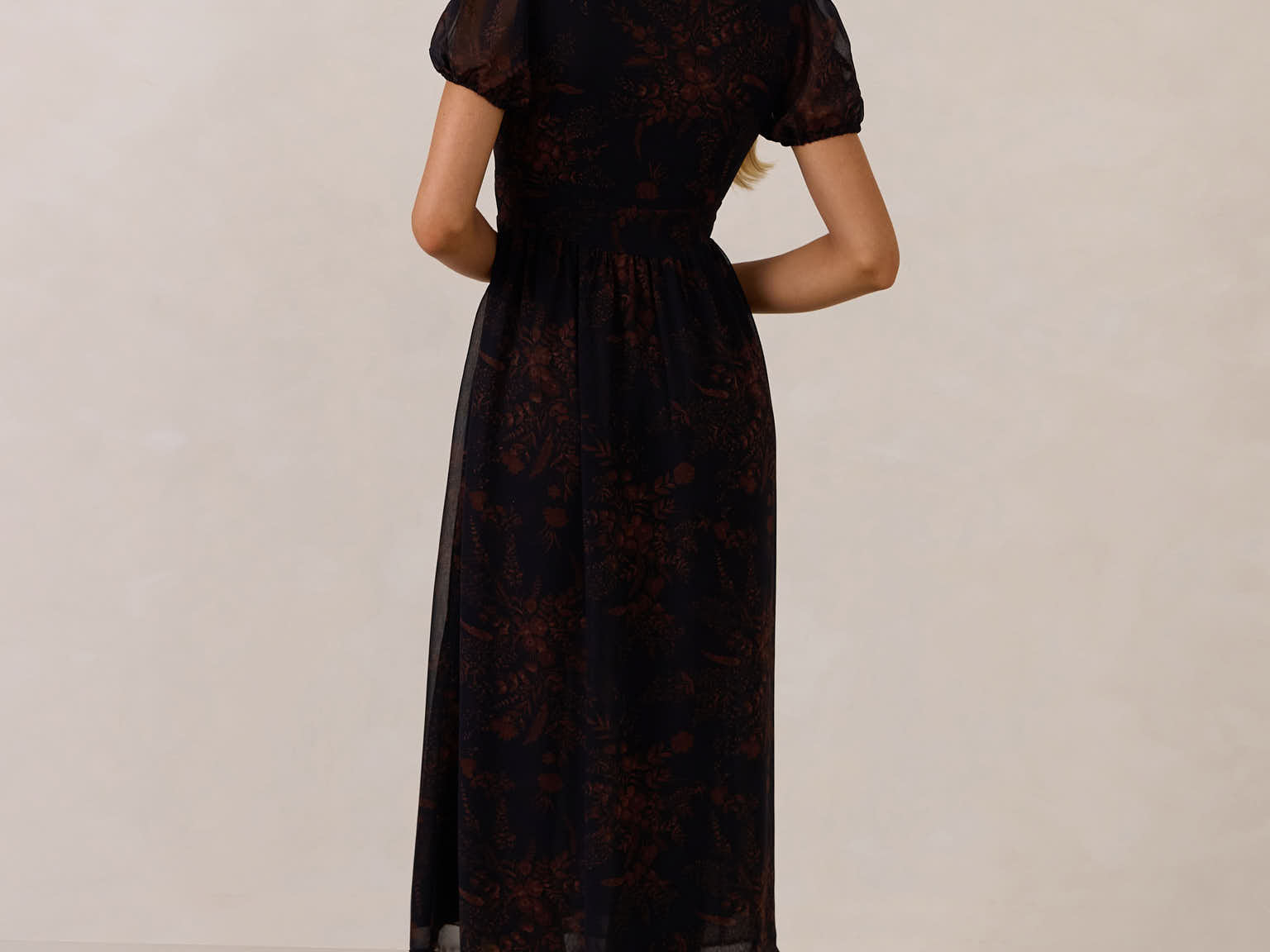 Reece, your go-to for fall events and wine tastings. Made from airy chiffon with an effortless drape, she’s flowy without being too precious. The elasticated short sleeves add a touch of comfort, while the slightly fitted bodice and subtle flare through the skirt keep things flattering without trying too hard.