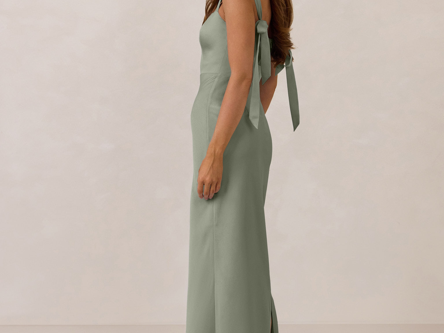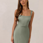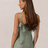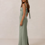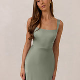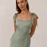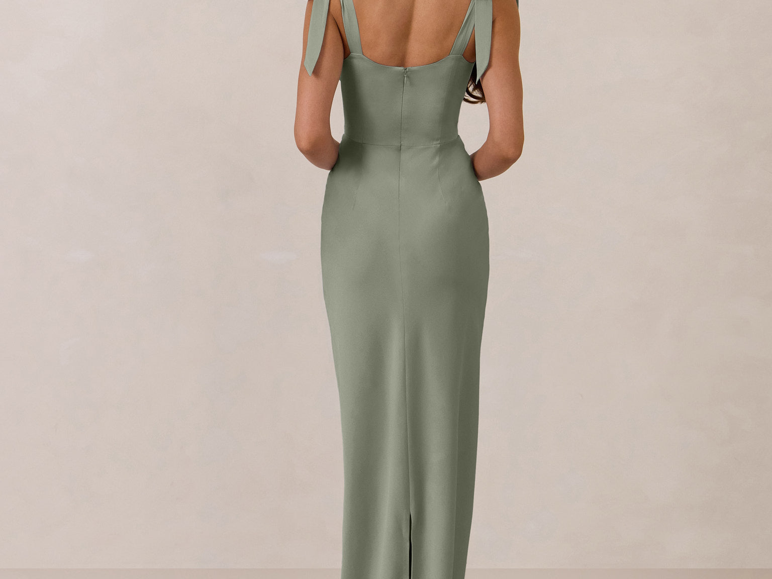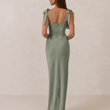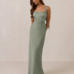 This full-length dress, made from luxurious satin, features a sleek square neckline and thick tie straps, offering a structured yet effortless aesthetic. The slim-fit skirt gently embraces the body, creating a smooth and elongated silhouette. An invisible back zipper ensures a seamless finish, making this dress ideal for sophisticated evening events.
