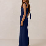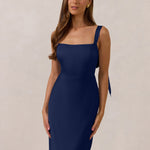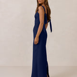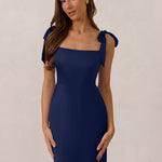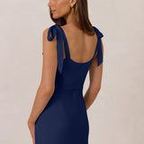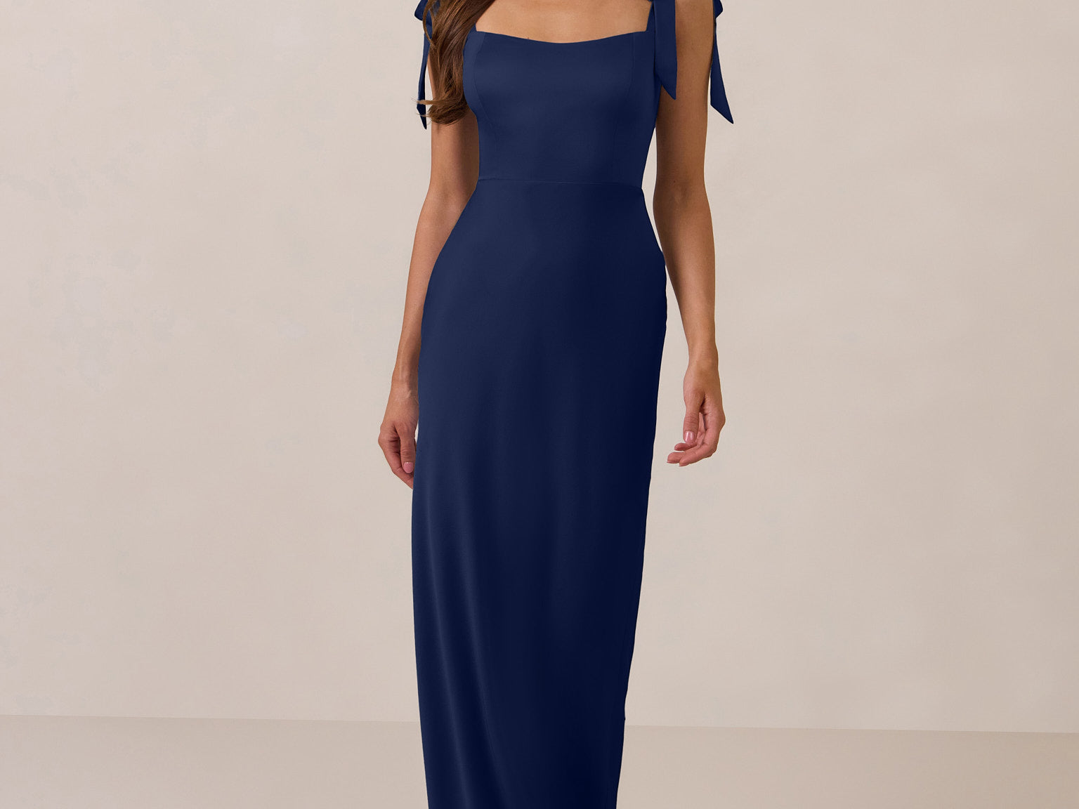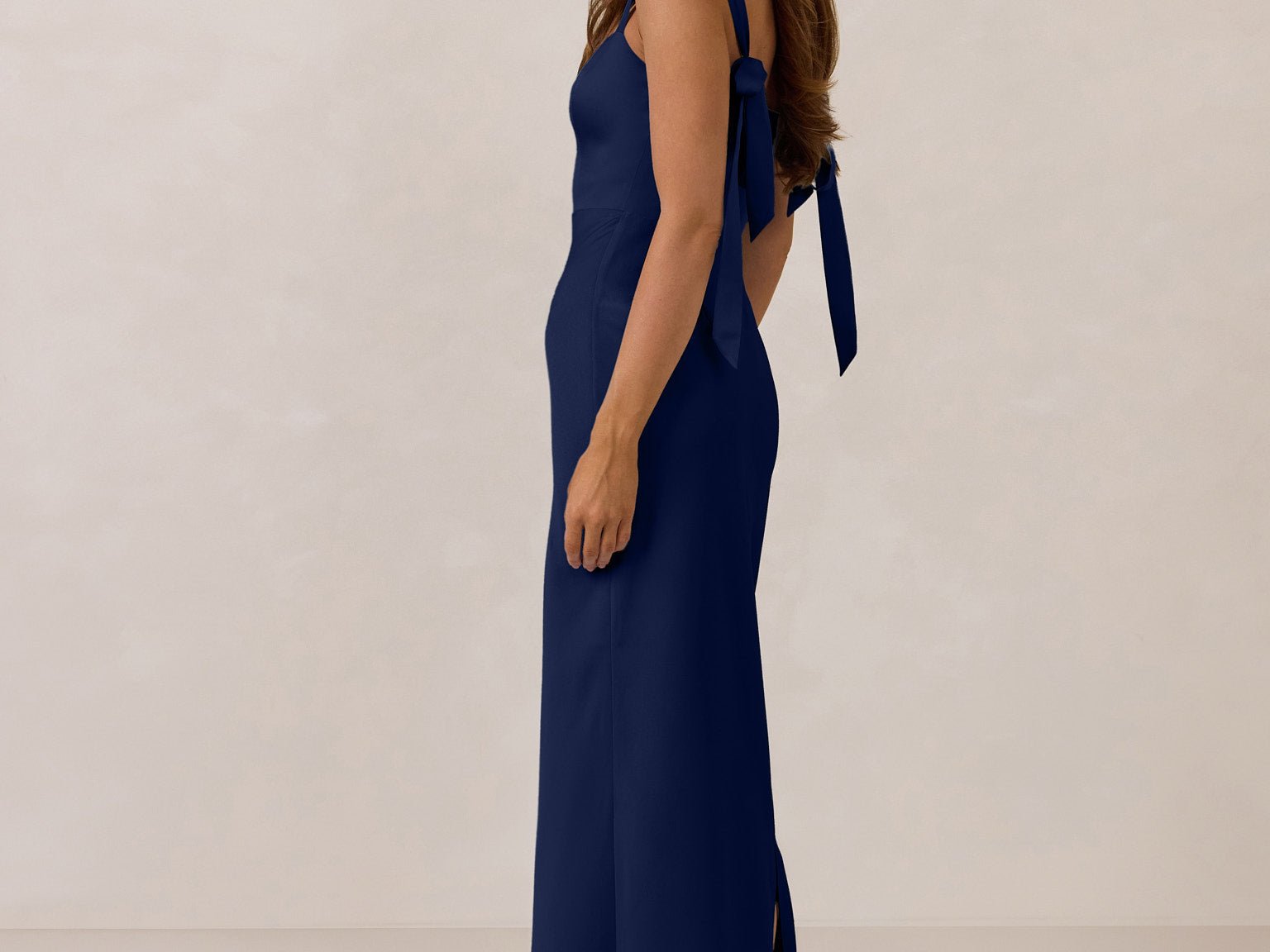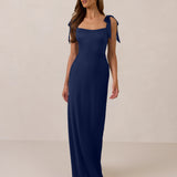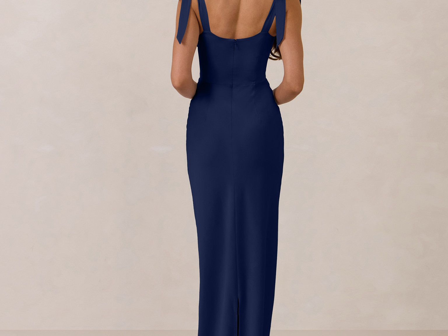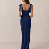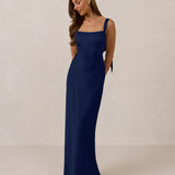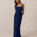 This full-length dress, made from luxurious satin, features a sleek square neckline and thick tie straps, offering a structured yet effortless aesthetic. The slim-fit skirt gently embraces the body, creating a smooth and elongated silhouette. An invisible back zipper ensures a seamless finish, making this dress ideal for sophisticated evening events.