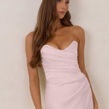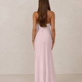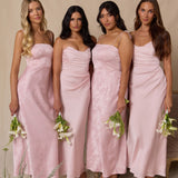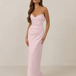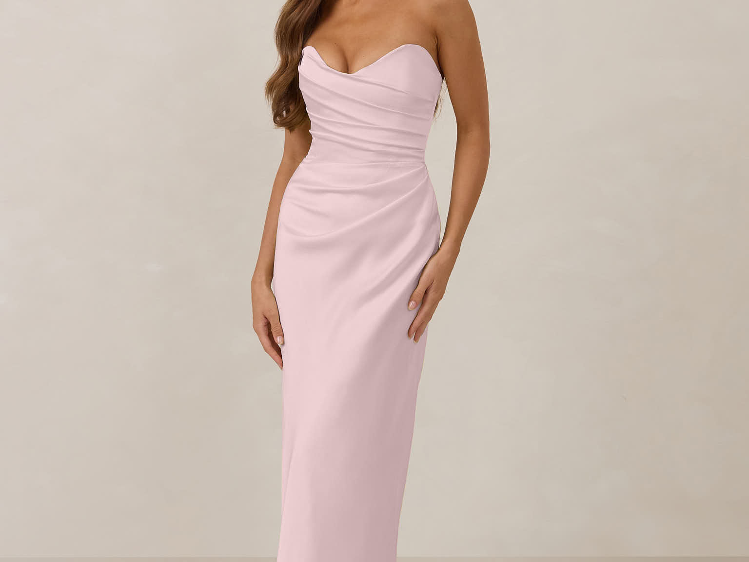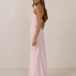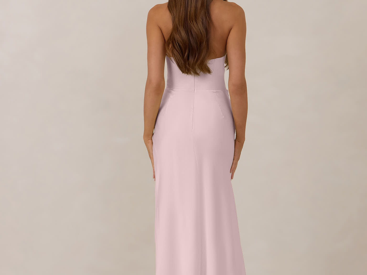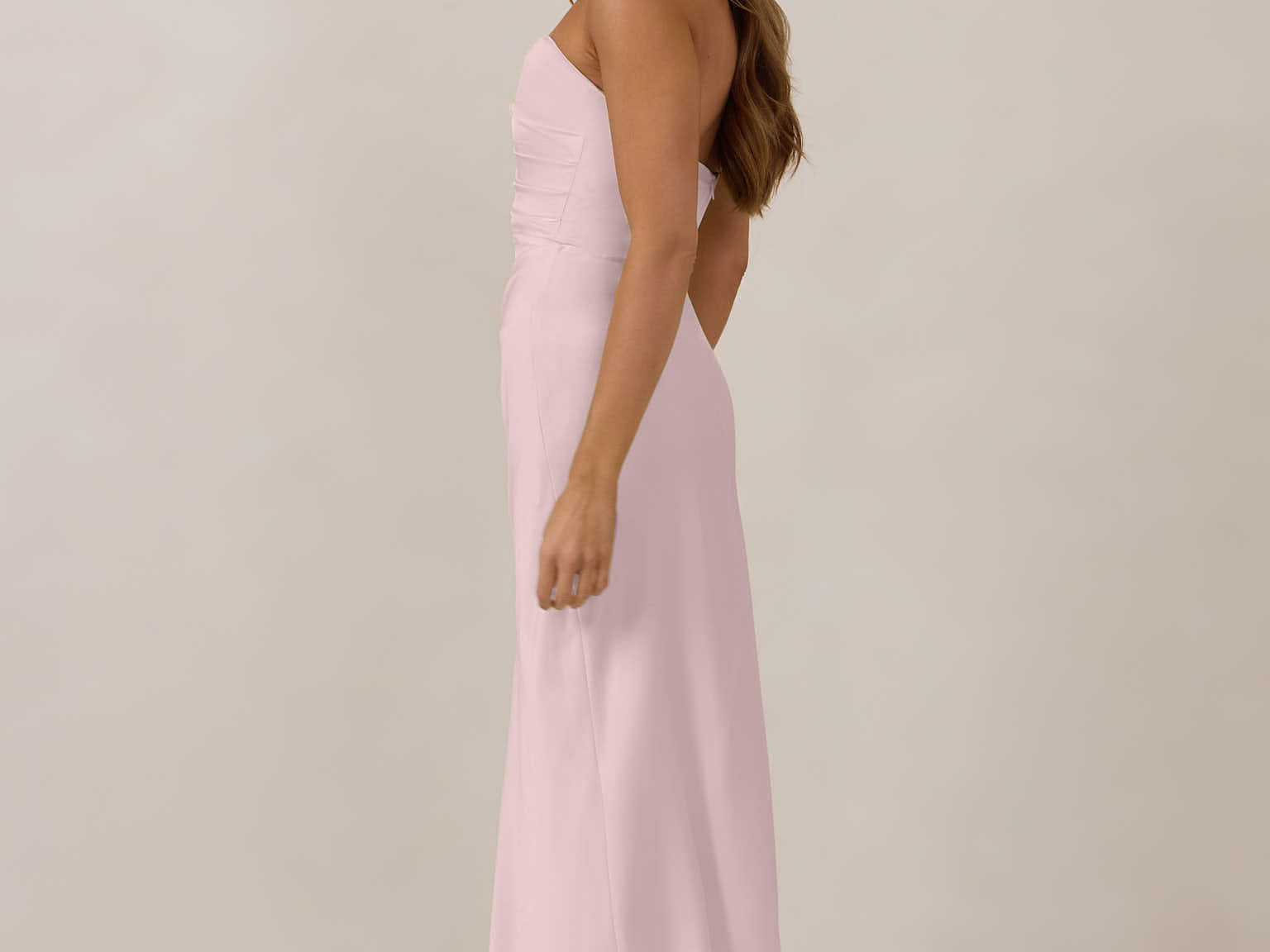 Designed with a scoop sweetheart neckline and soft pleating through the boned bodice and skirt, this dress creates a sleek, feminine silhouette. Elegant and timeless, it’s an ideal choice for weddings, receptions, or any formal occasion.