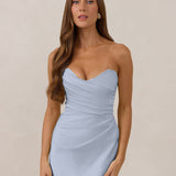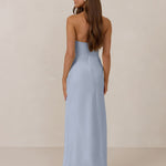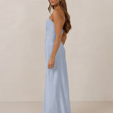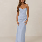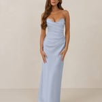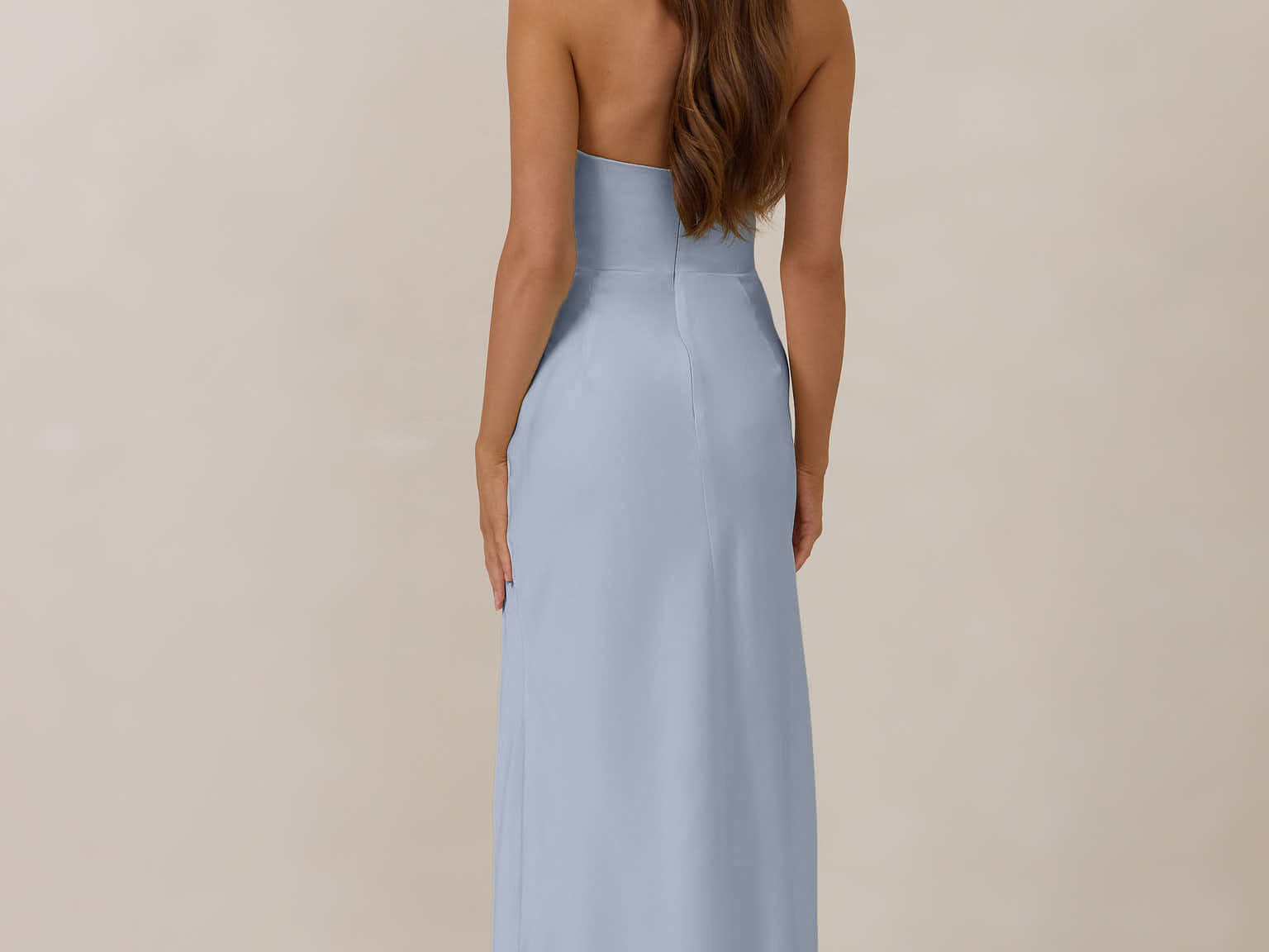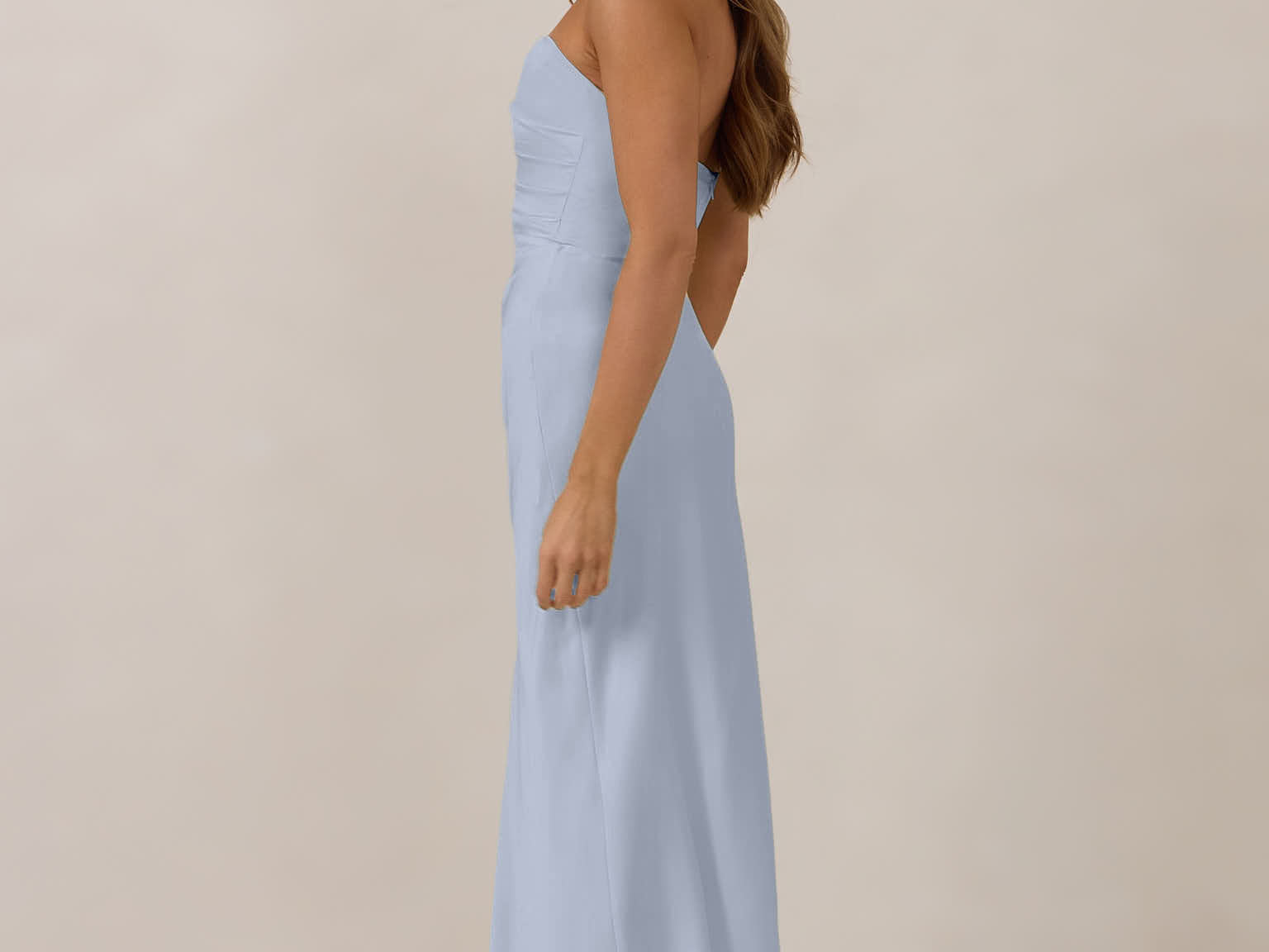 Designed with a scoop sweetheart neckline and soft pleating through the boned bodice and skirt, this dress creates a sleek, feminine silhouette. Elegant and timeless, it’s an ideal choice for weddings, receptions, or any formal occasion.