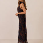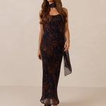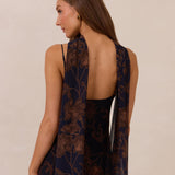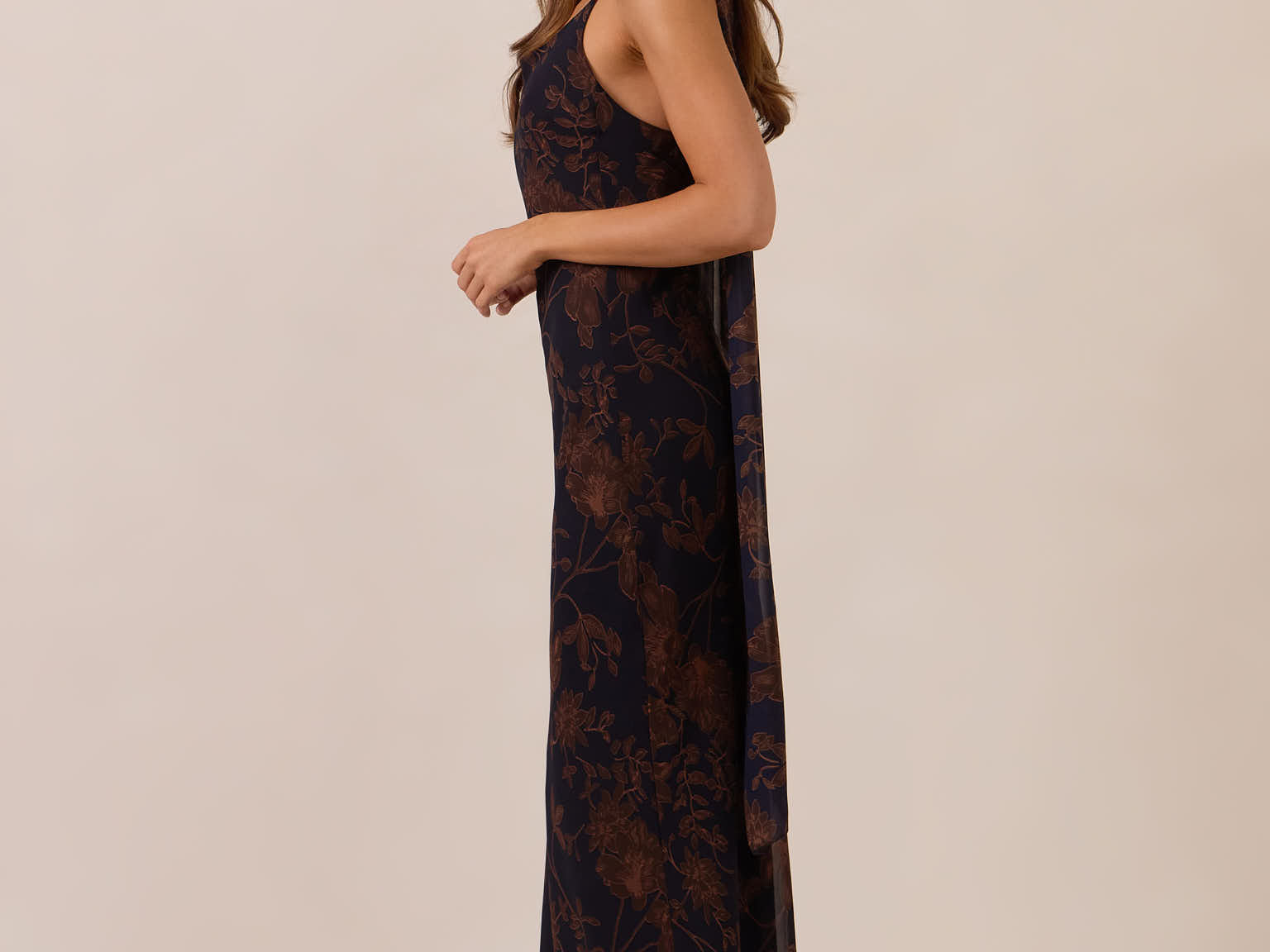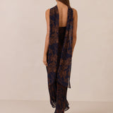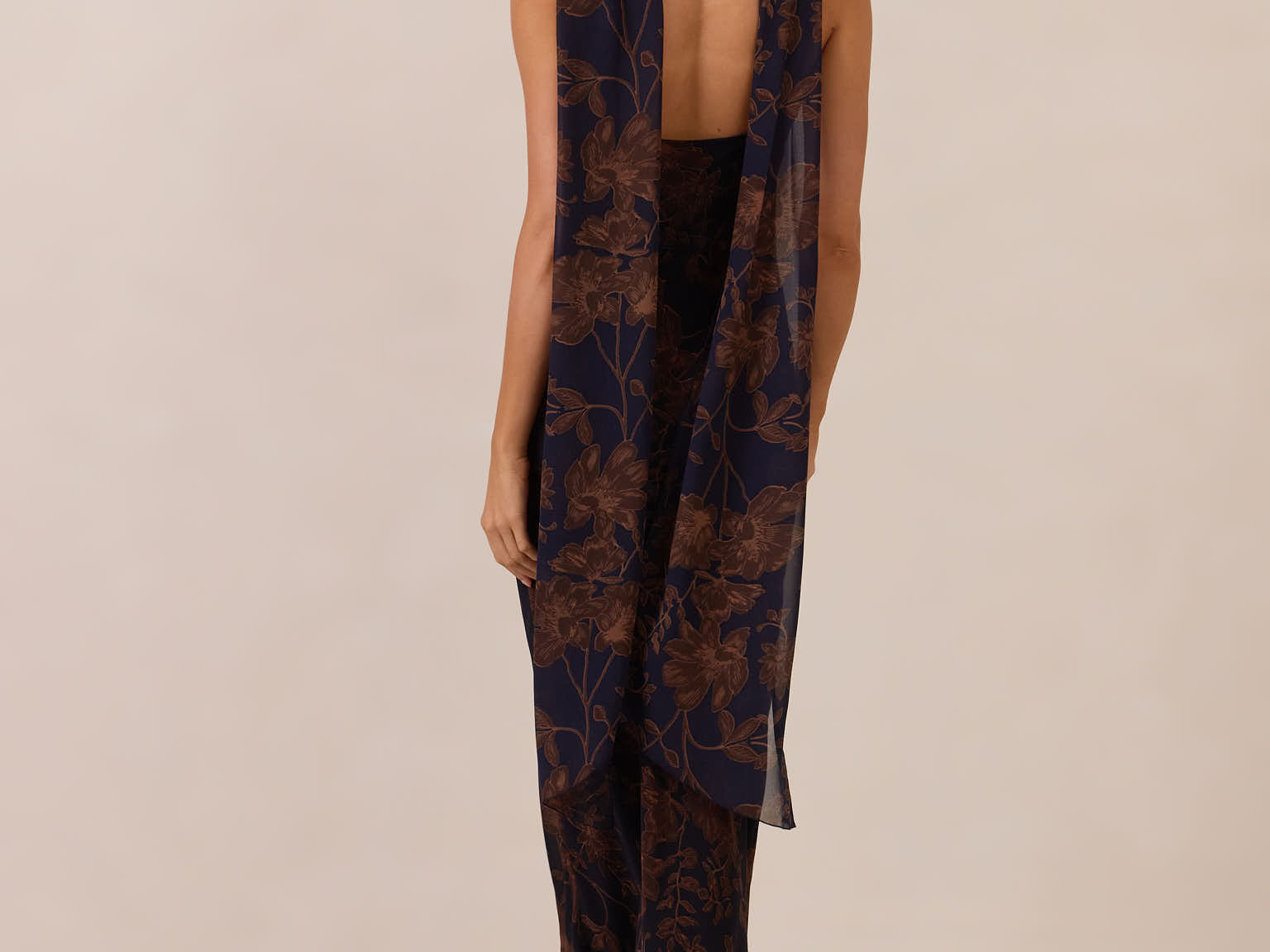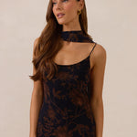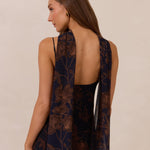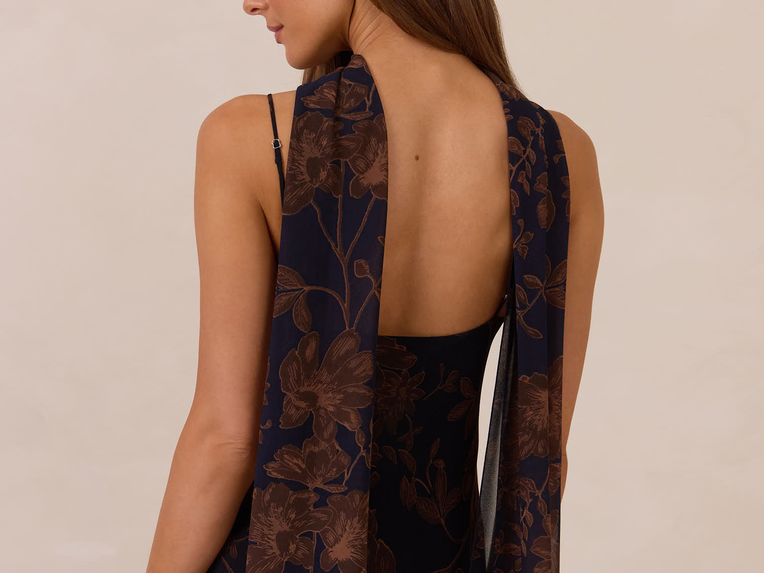 The Carmela dress is an elegant printed chiffon slip dress. It comes with a wide chiffon scarf, making it versatile enough for both everyday wear and special events.