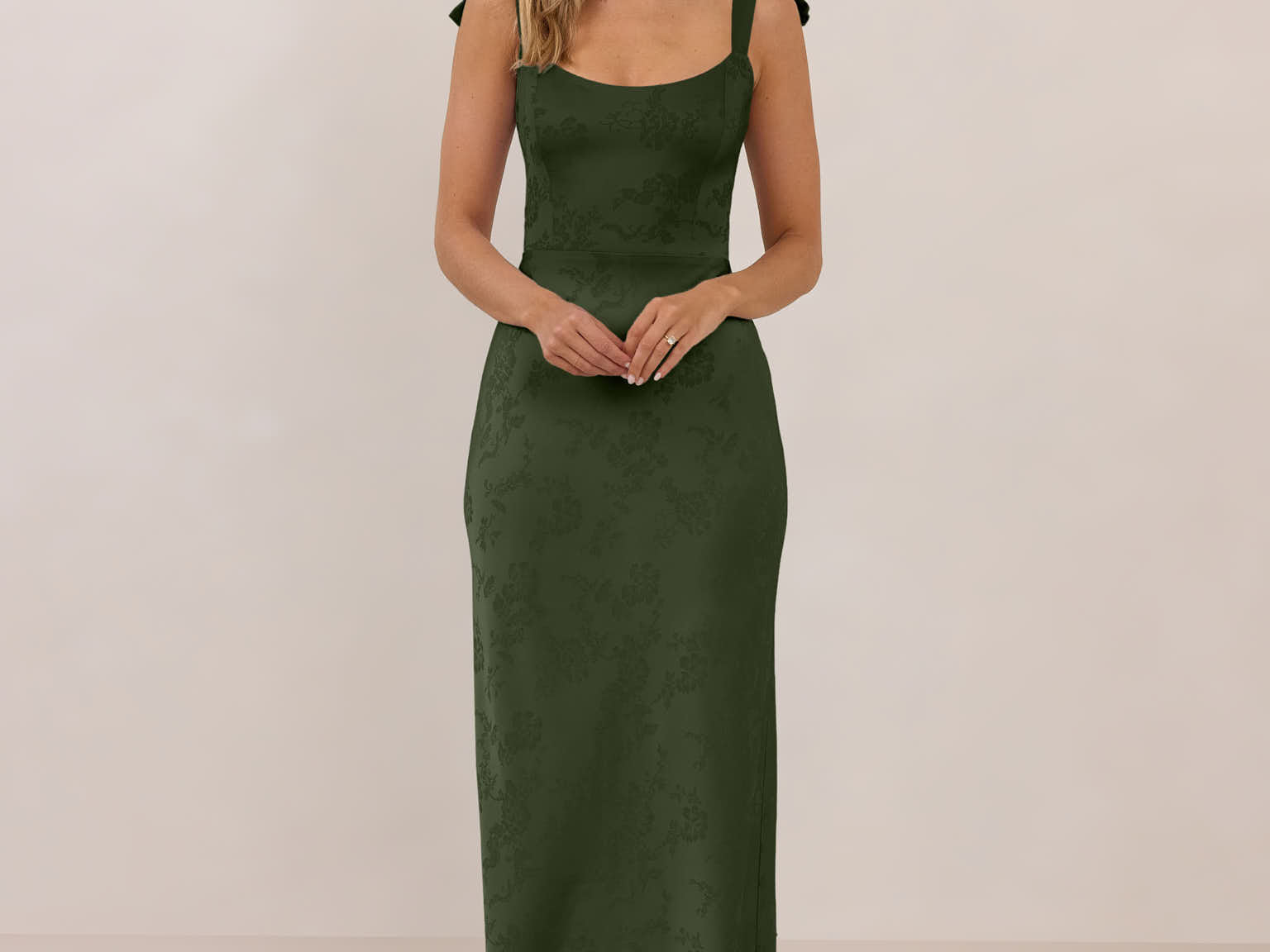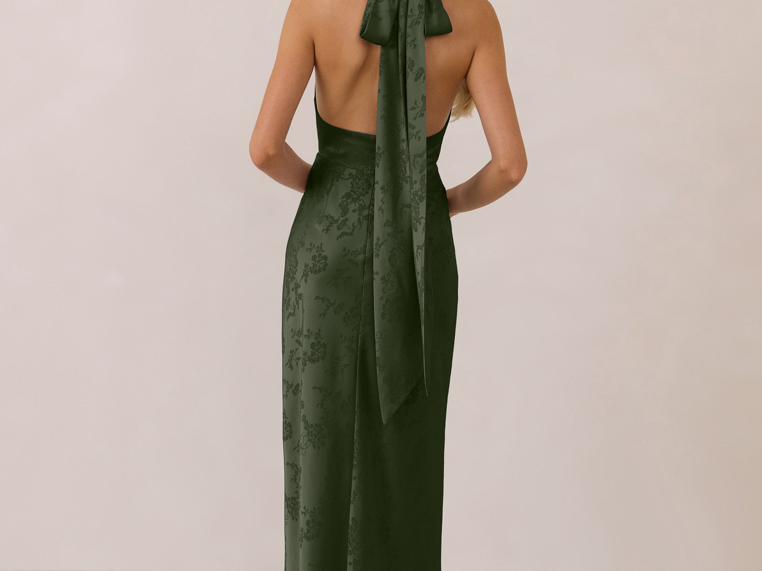 Our Jacquard is a medium-weight fabric that offers a structured feel and elegant floral patterns. It's blended with satin for a subtle sheen and soft, luxurious finish. This fabric holds its shape beautifully and drapes gracefully for a polished, tailored look, with very little stretch.