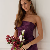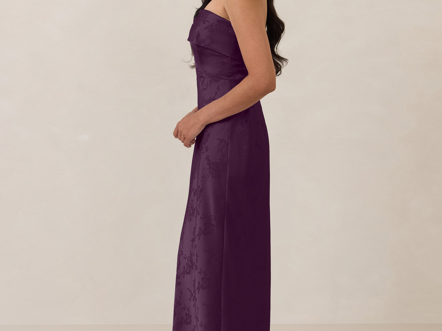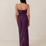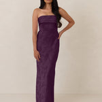 A timeless piece designed to captivate. Designed from luxe bubble satin fabric with a subtle sheen, this dress exudes understated glamour. The structured, folded strapless neckline adds a modern sculptural element, gracefully framing the shoulders.