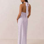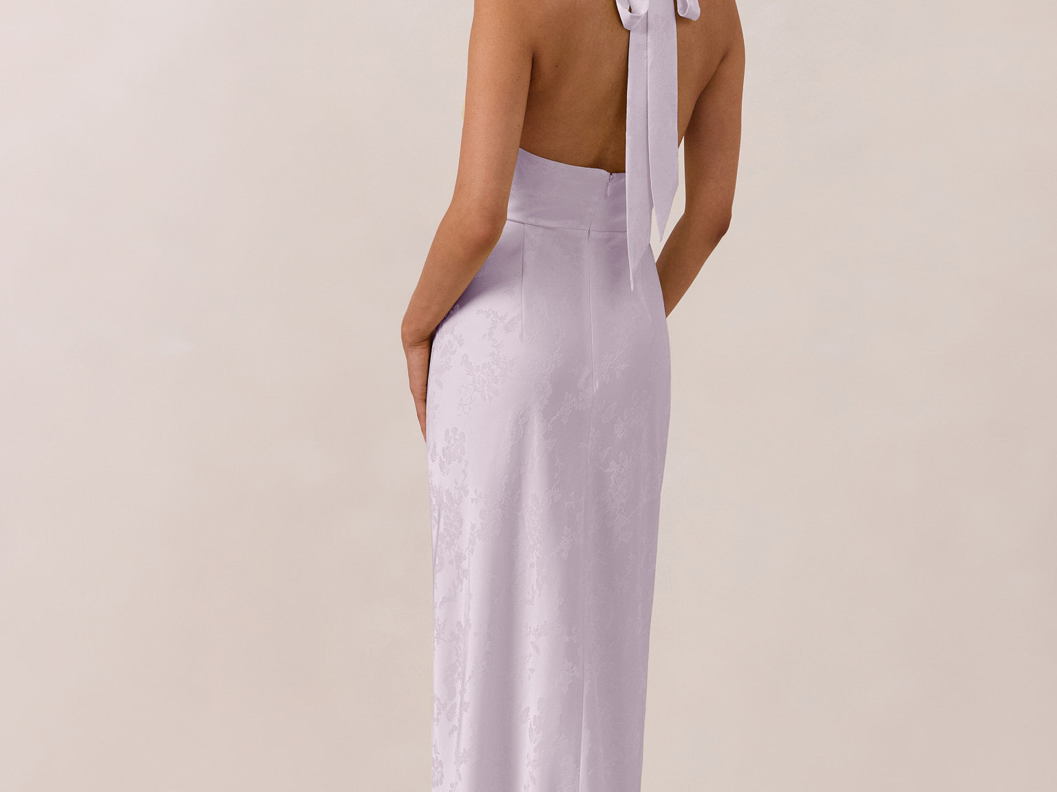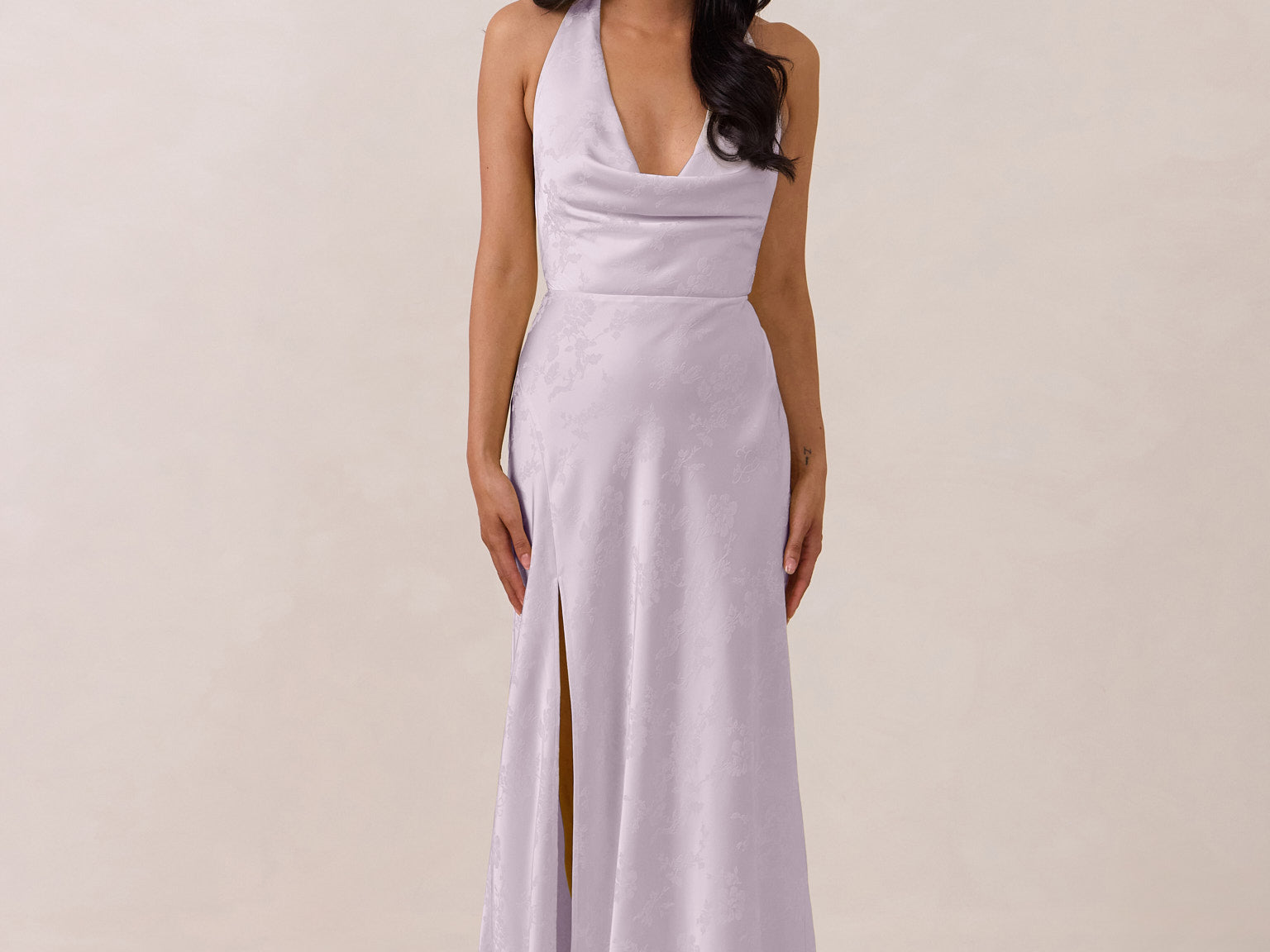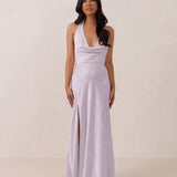 Effortlessly elegant, this bias-cut satin maxi dress features a fluid skirt with a curved thigh-high slit and a draped cowl neckline. A delicate halter back completes the look. Perfect for any occasion, it's glossy and flattering.