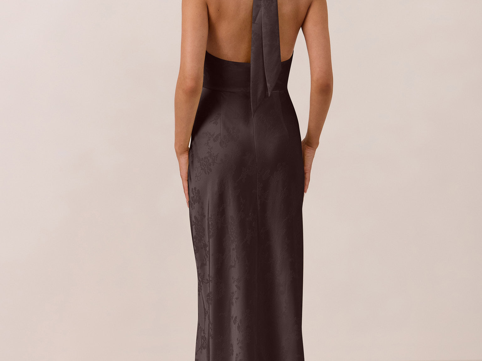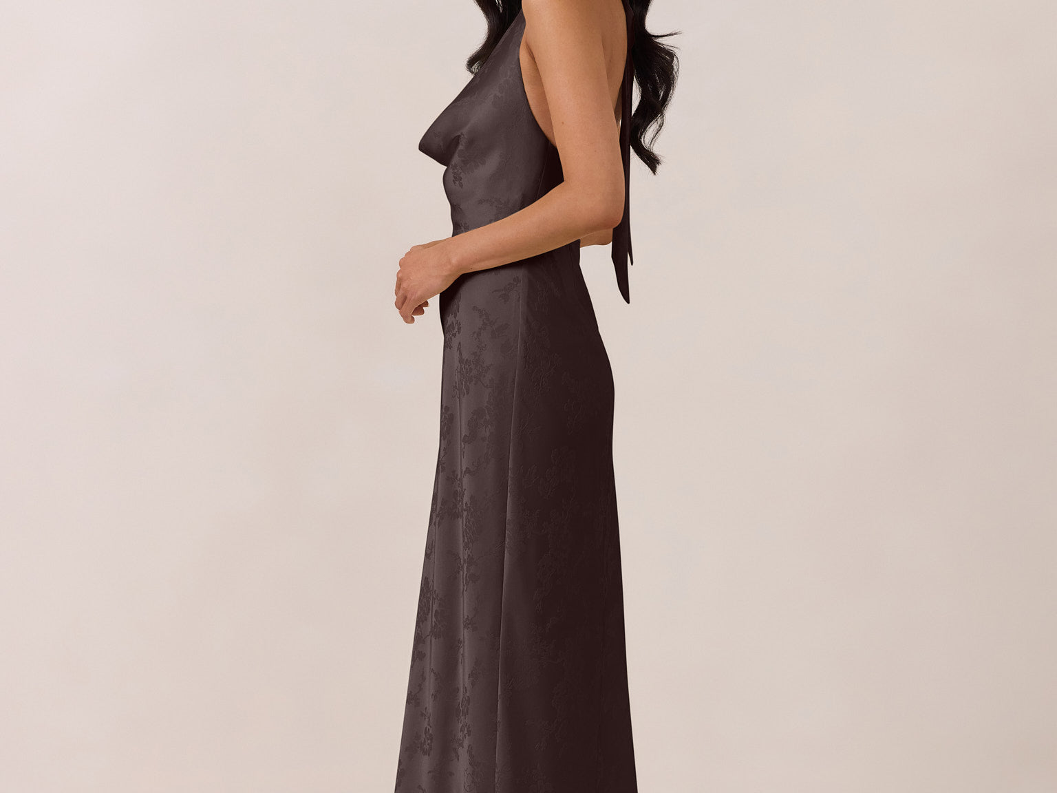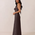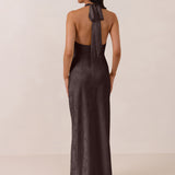 Effortlessly elegant, this bias-cut satin maxi dress features a fluid skirt with a curved thigh-high slit and a draped cowl neckline. A halter tie and open back complete the look. Perfect for any formal occasion, it's glossy and flattering.