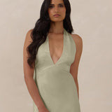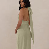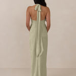 A sleek and versatile silhouette crafted in luxurious Jacquard for a touch of texture and sophistication. Designed for effortless elegance, it features a halter neckline with a dramatic open back and long ties that can be styled as a scarf or knotted for a custom halter look. The bias-cut skirt flows beautifully into a flattering maxi length, creating graceful movement with every step.