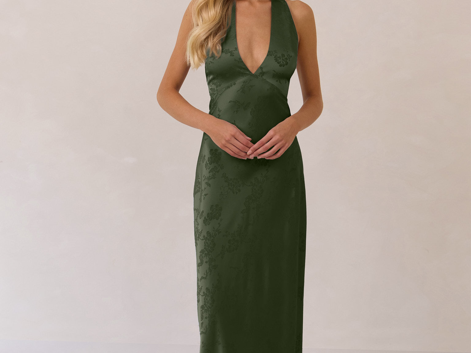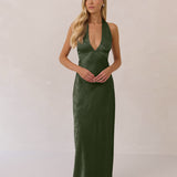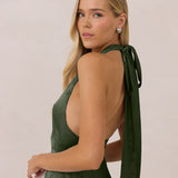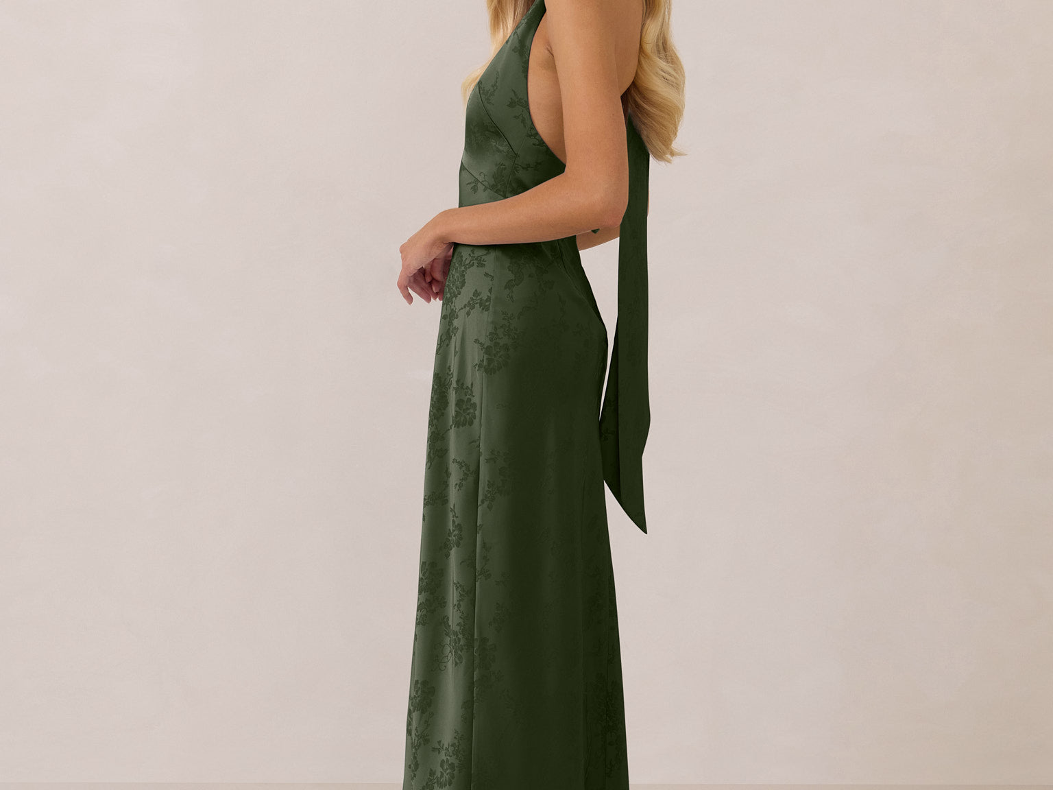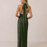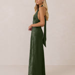 A sleek and versatile silhouette crafted in luxurious Jacquard for a touch of texture and sophistication. Designed for effortless elegance, it features a halter neckline with a dramatic open back and long ties that can be styled as a scarf or knotted for a custom halter look. The bias-cut skirt flows beautifully into a flattering maxi length, creating graceful movement with every step.