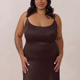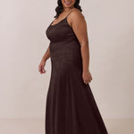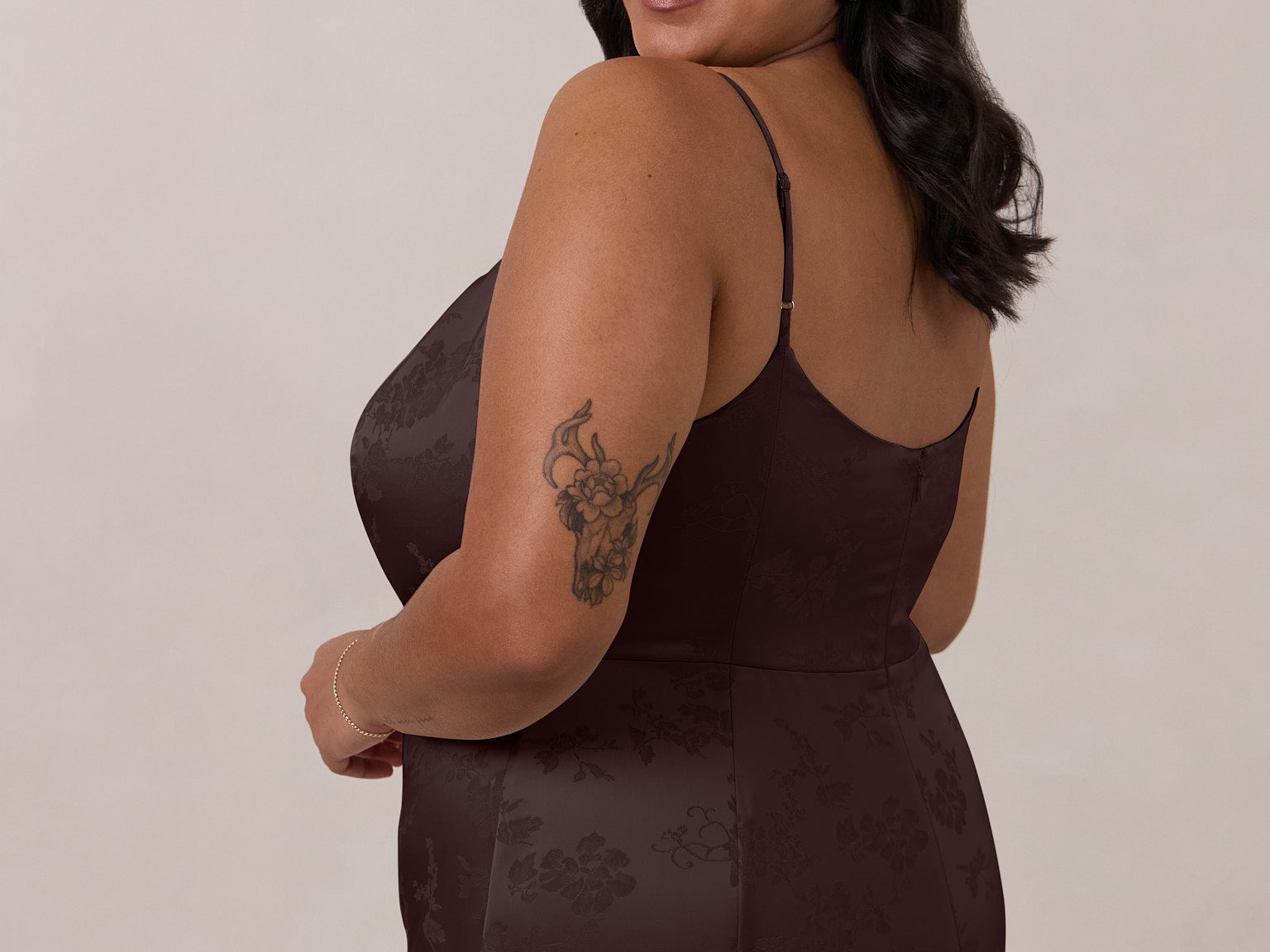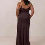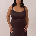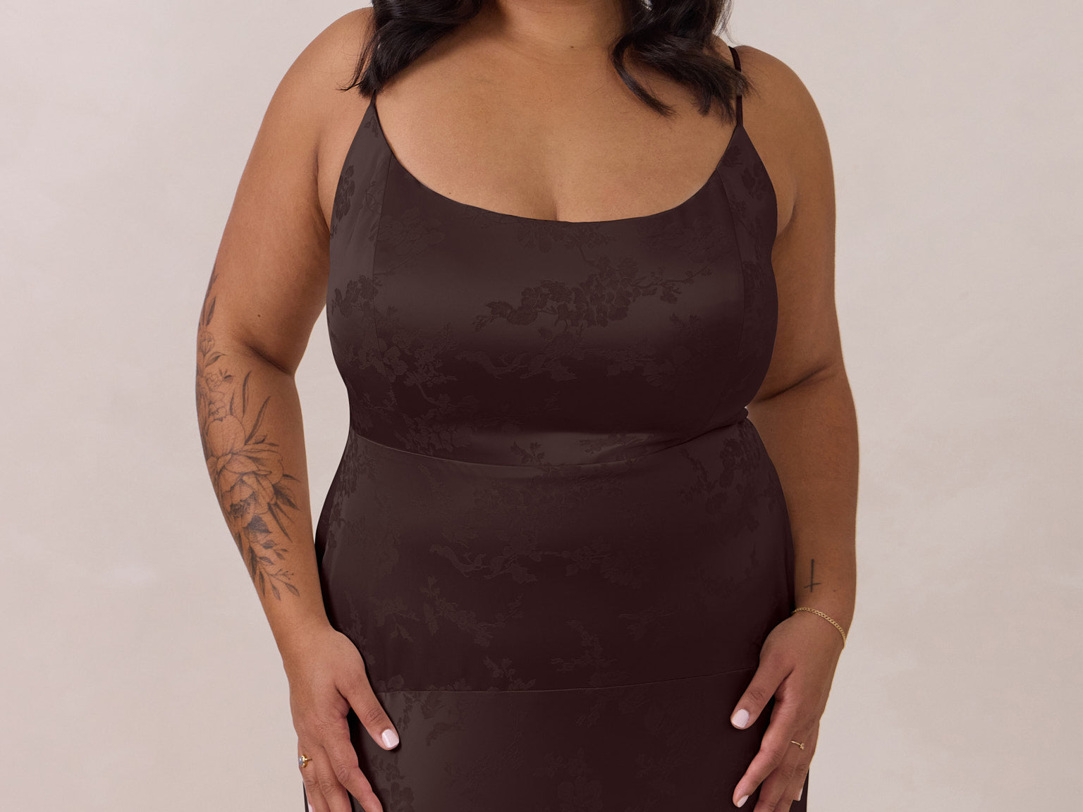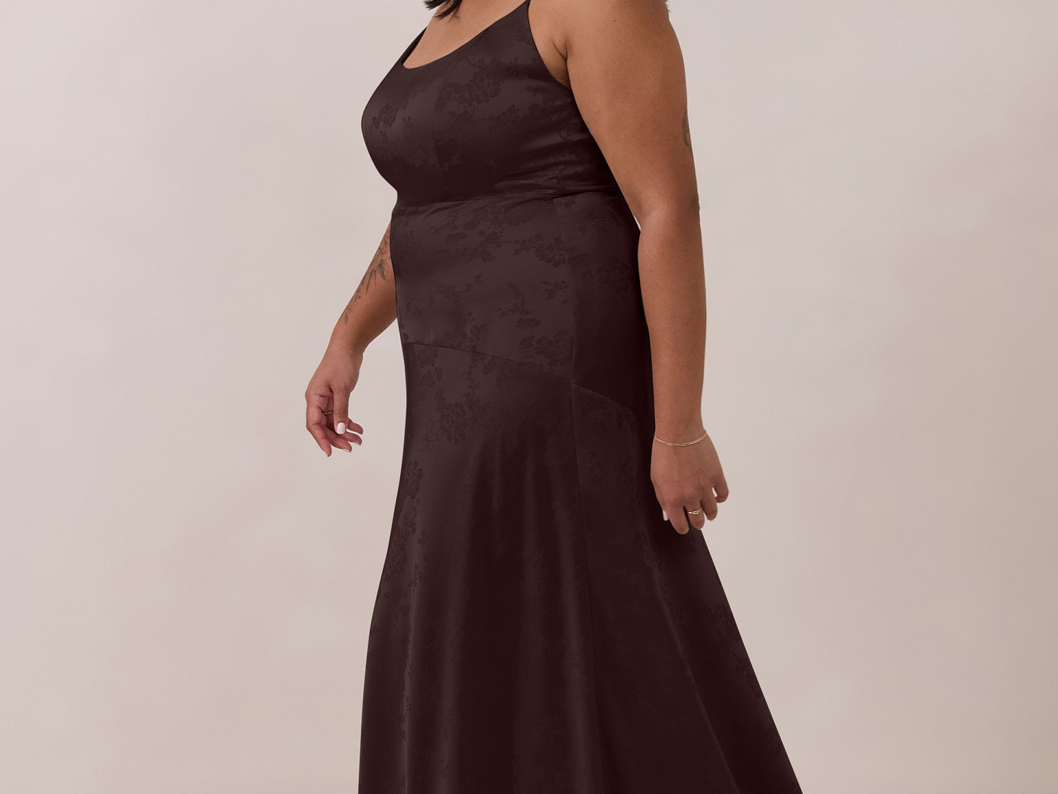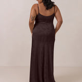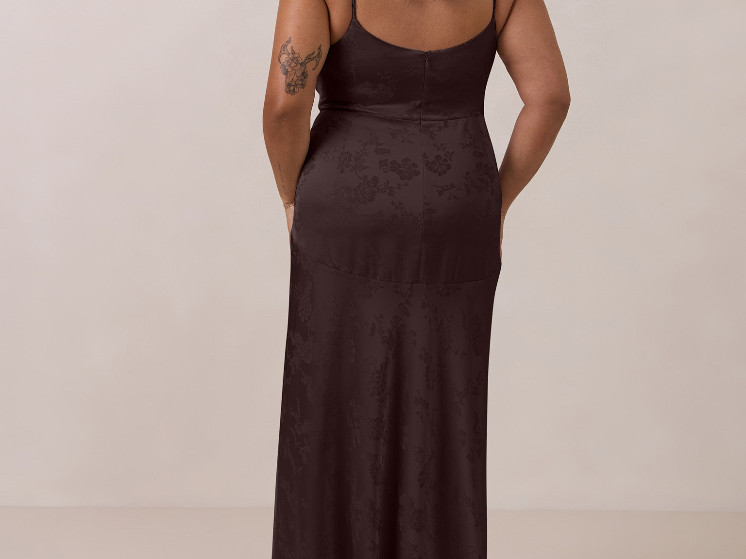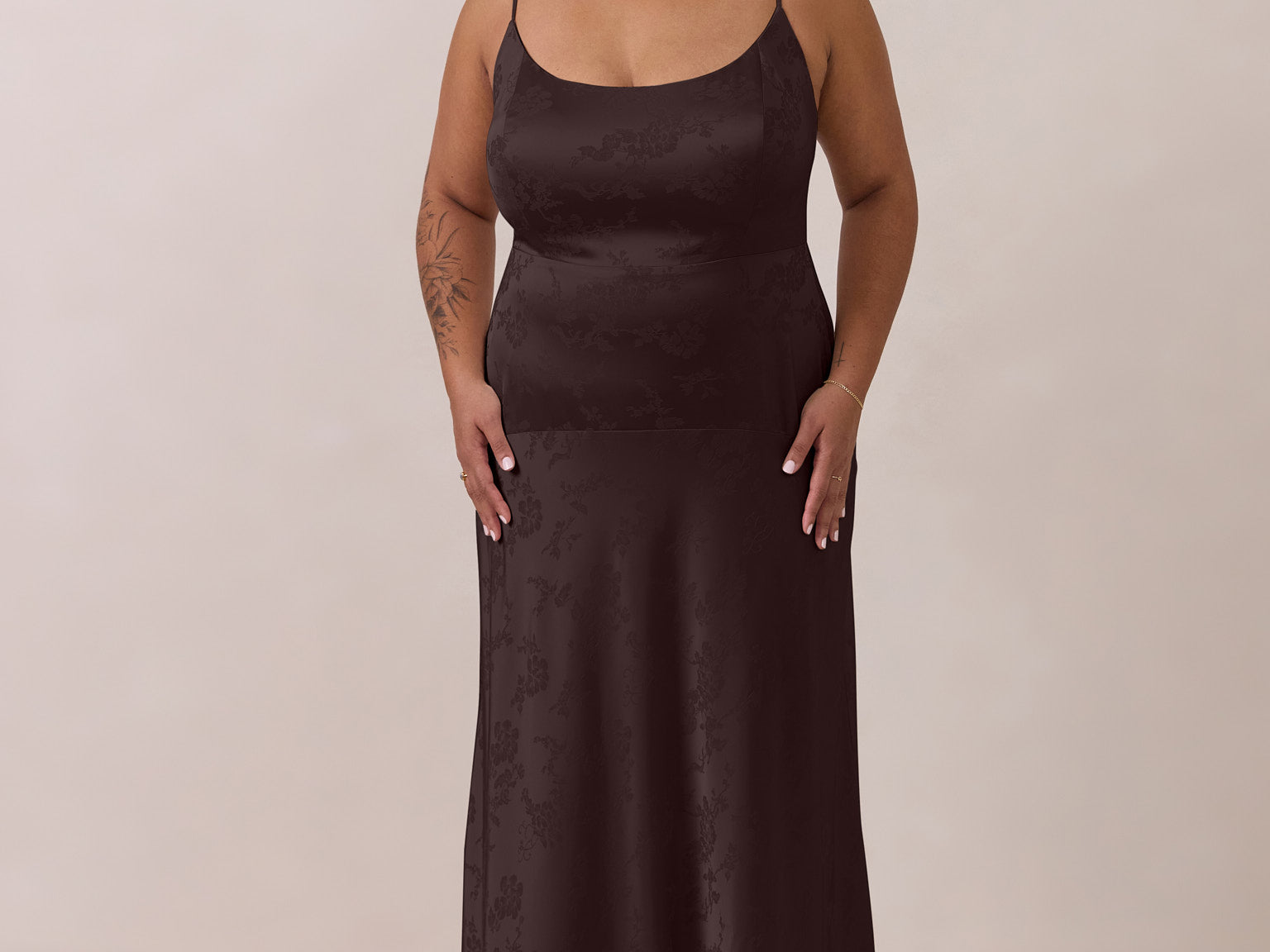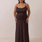 Crafted from luxurious Jacquard satin, this full-length dress features adjustable straps and a flattering drop waist, creating an elegant silhouette with timeless appeal. The scoop neckline and back add a delicate, feminine touch, while the bias-cut skirt flows gracefully to the floor, combining sophistication and comfort for a truly captivating look.