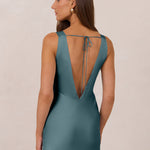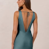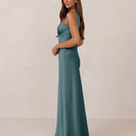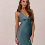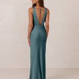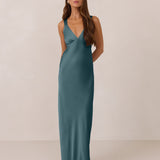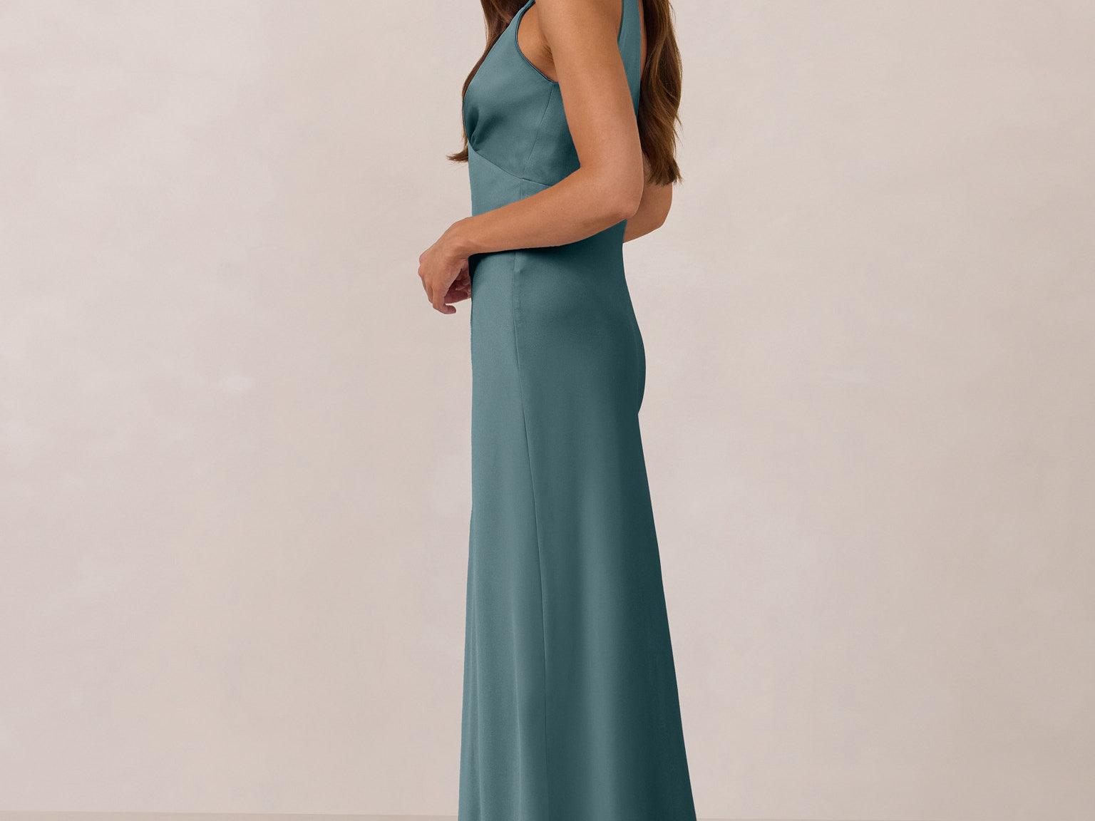 Featuring a flattering V-neckline, gathering at the bust, and an open back, this bias-cut dress offers a sleek, elongating silhouette. The clean lines and minimalist design make it the perfect choice for any special occasion.