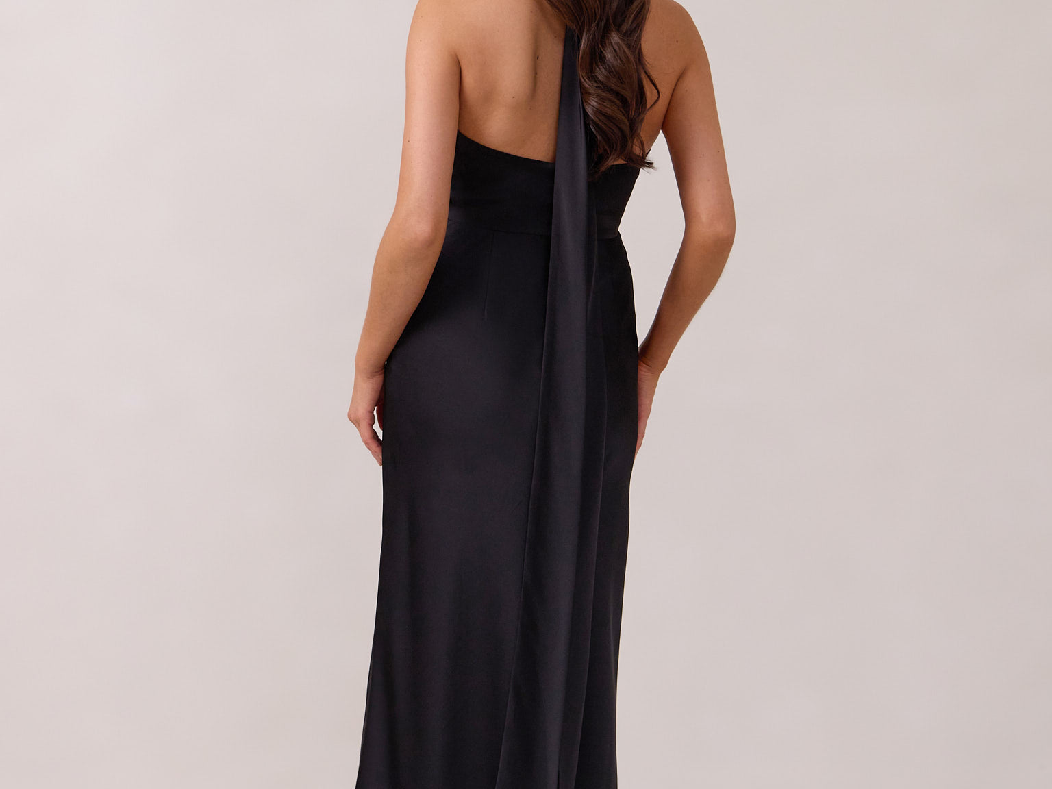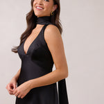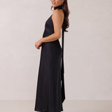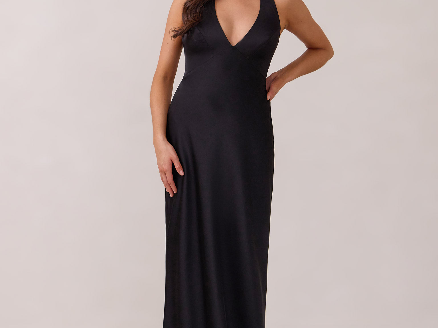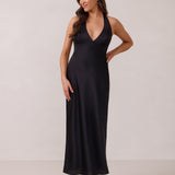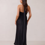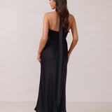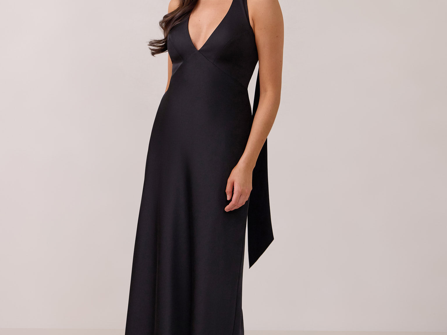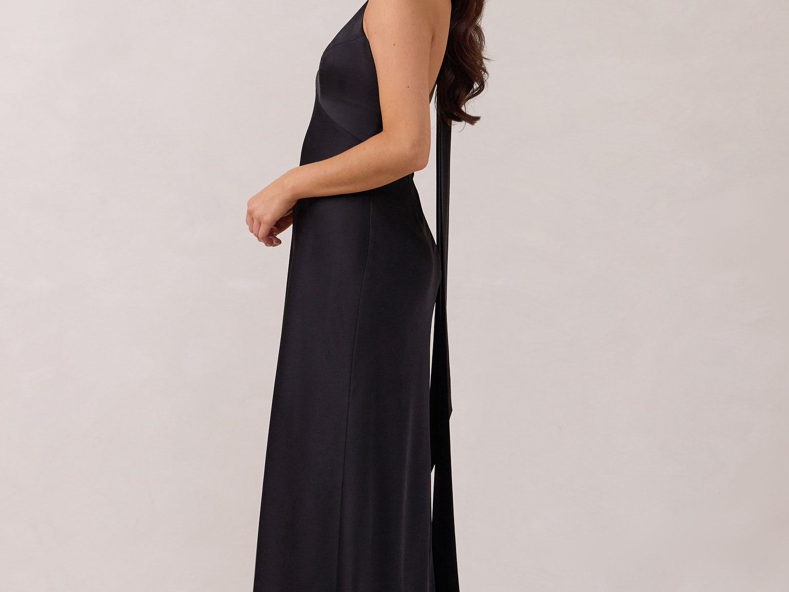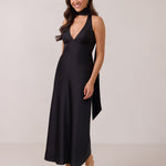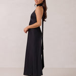 A sleek and versatile silhouette designed for effortless elegance. Featuring a halter neckline with a dramatic open back, it includes long ties that can be styled as a scarf or tied for a custom halter look. The bias-cut skirt flows beautifully for a flattering tea-length fit.