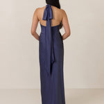 Designed to turn heads. Crafted from our smooth satin, this bust-friendly halter style features long, versatile ties that can be styled in a bow or worn as a neck scarf for a modern touch. Finished with a bias-cut skirt and a subtle slit, this dress effortlessly balances elegance with a bold edge.