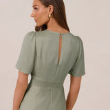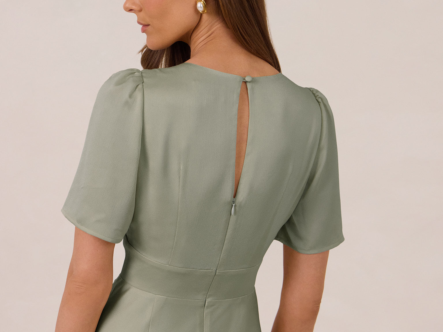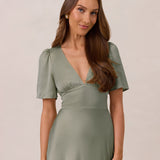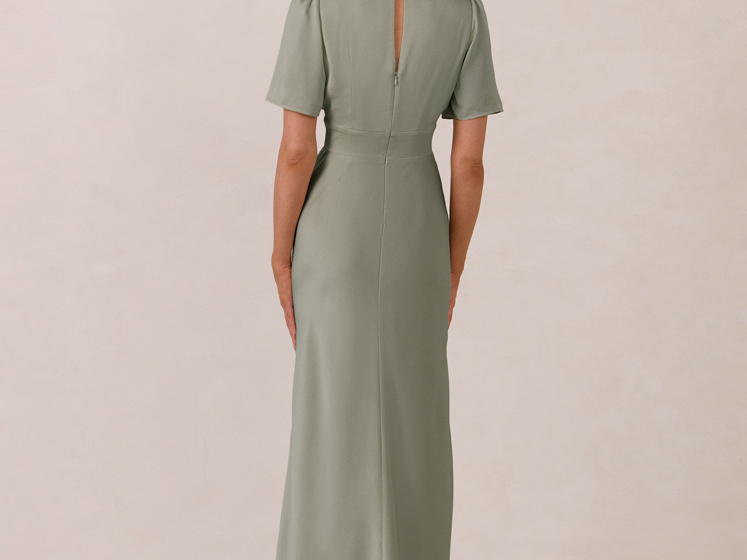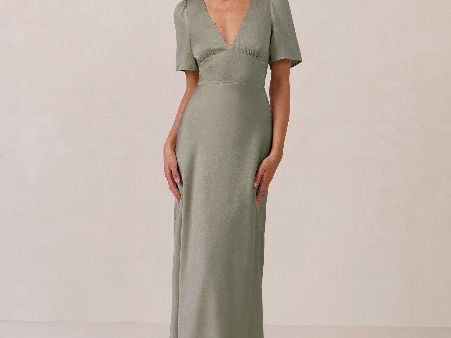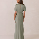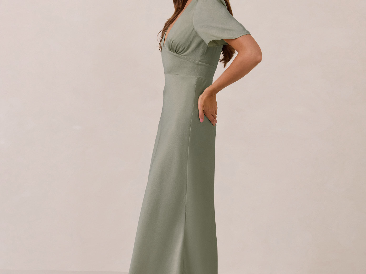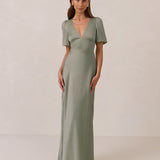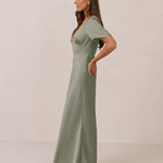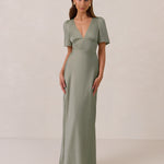 This full-length satin dress features a romantic V neckline, short sleeves, and a bias-cut skirt for an effortlessly feminine silhouette. A subtle keyhole back and delicate button closure add unexpected detail. Finished in silky satin with a soft, light-catching sheen.