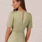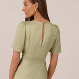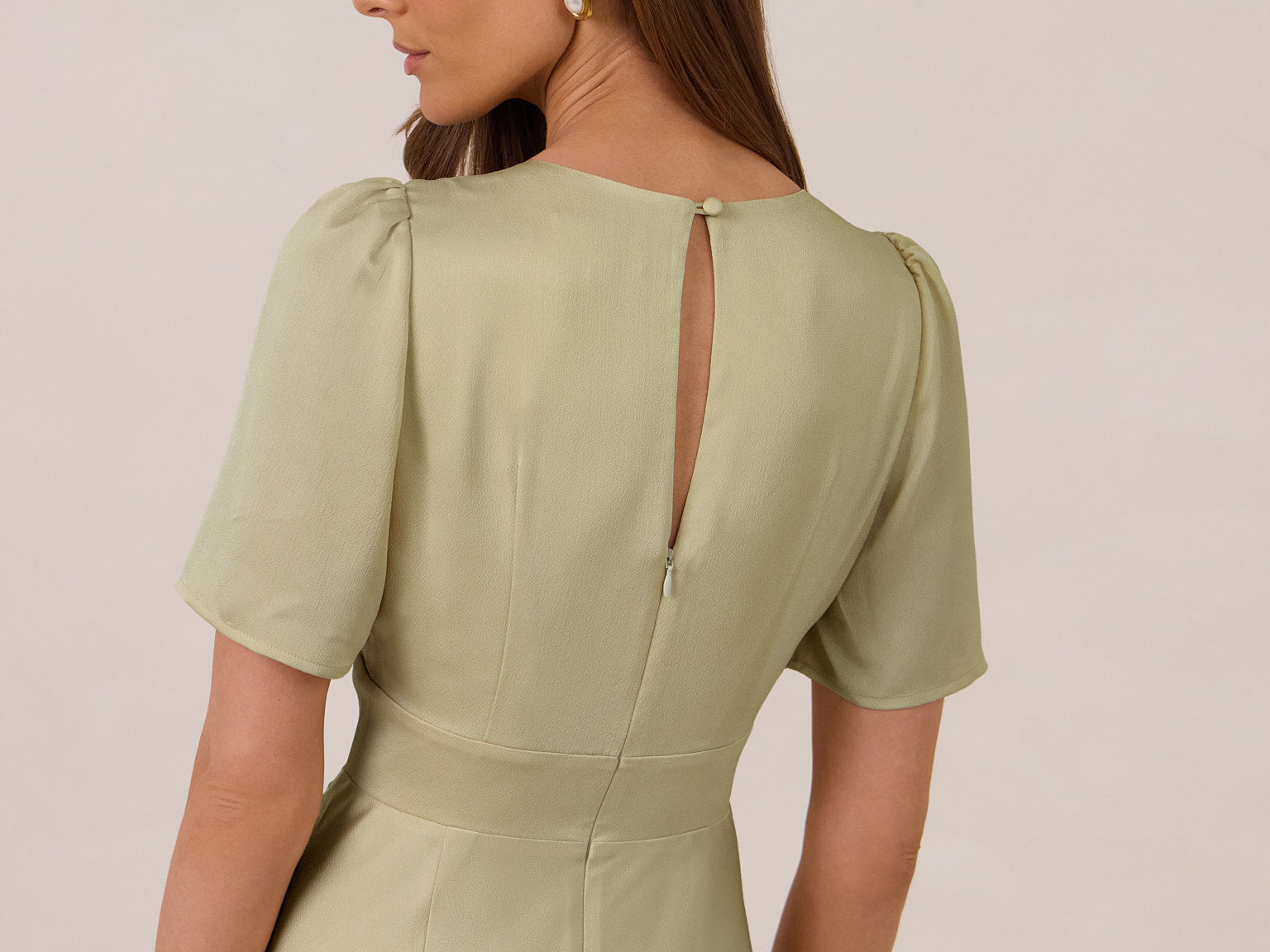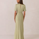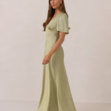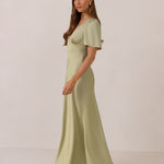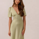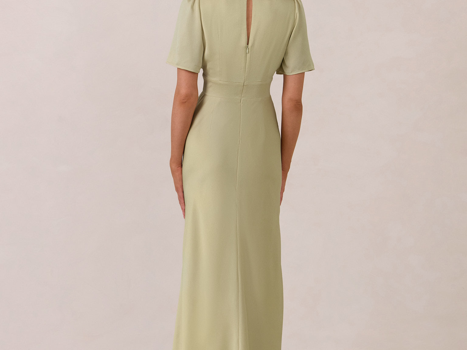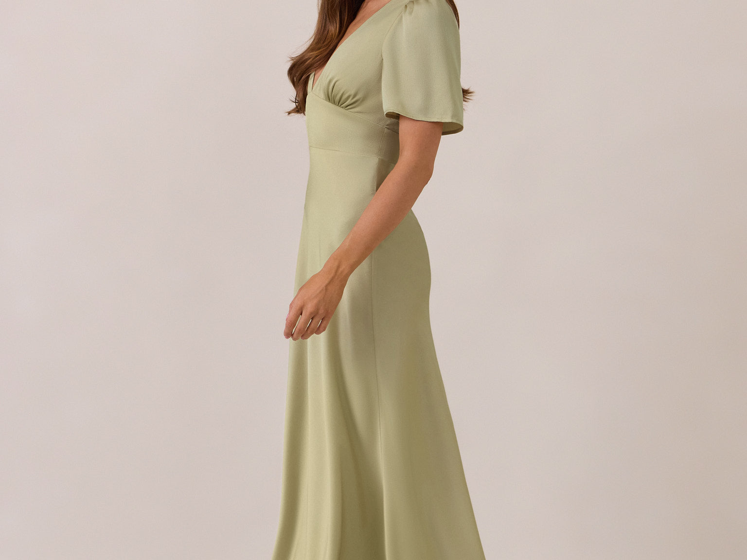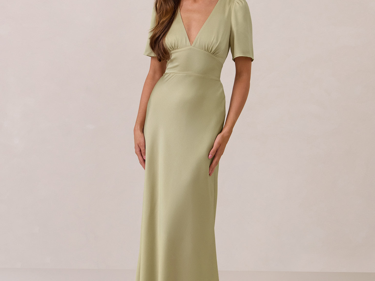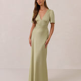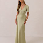This full-length satin dress features a romantic V neckline, short sleeves, and a bias-cut skirt for an effortlessly feminine silhouette. A subtle keyhole back and delicate button closure add unexpected detail. Finished in silky satin with a soft, light-catching sheen.