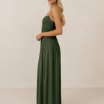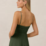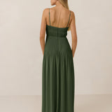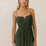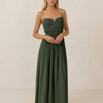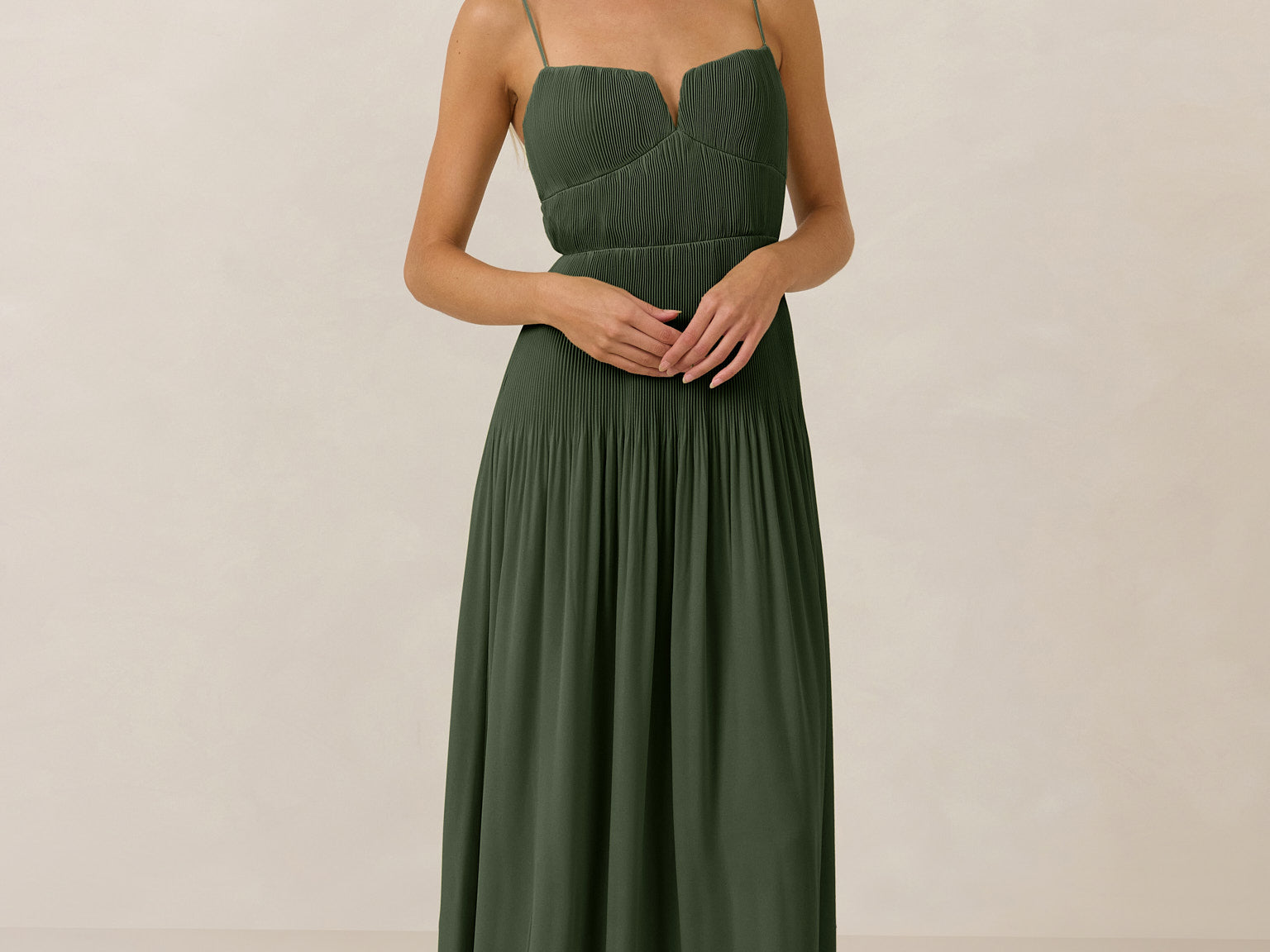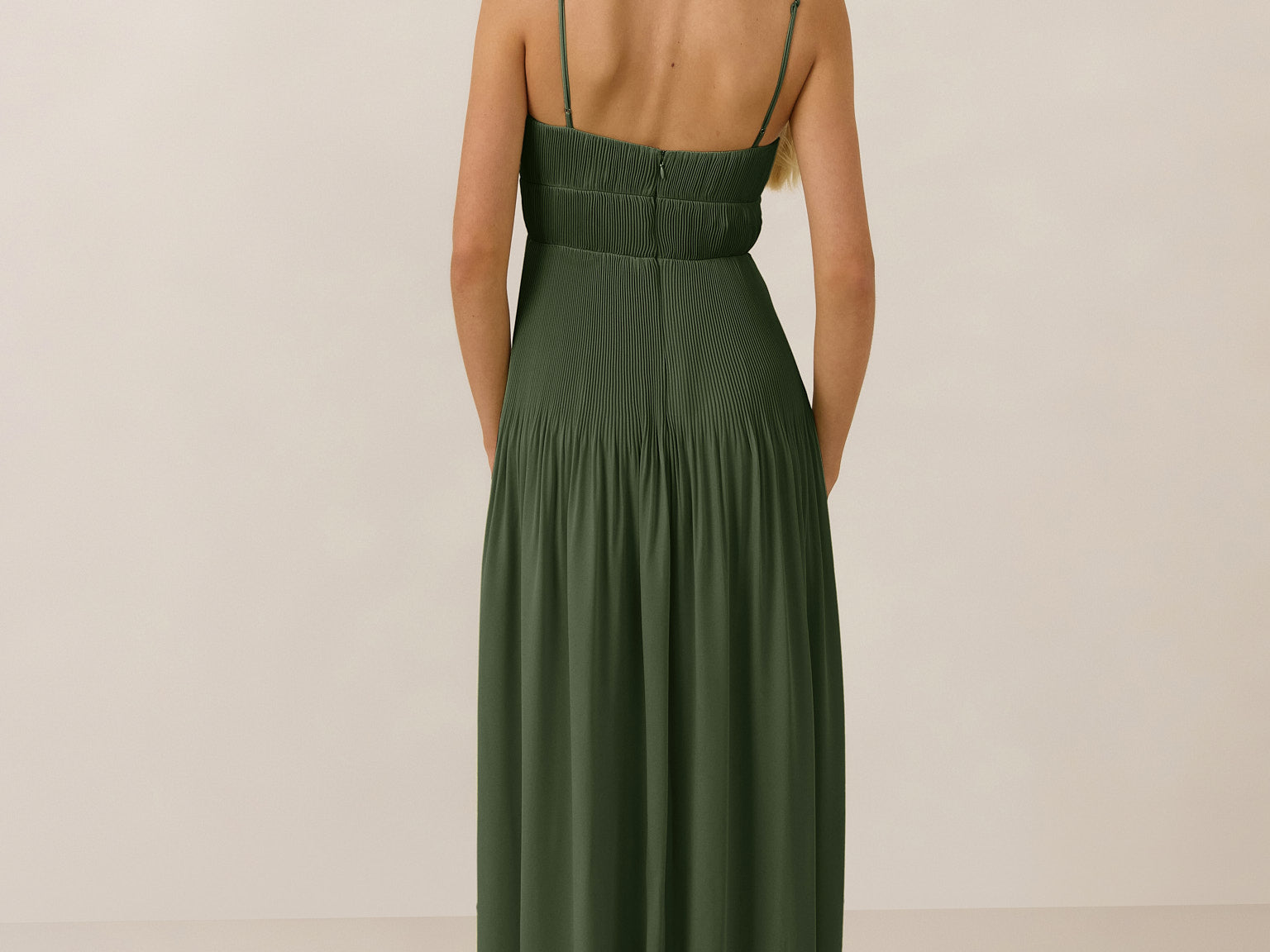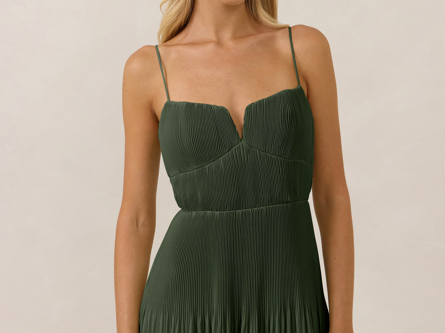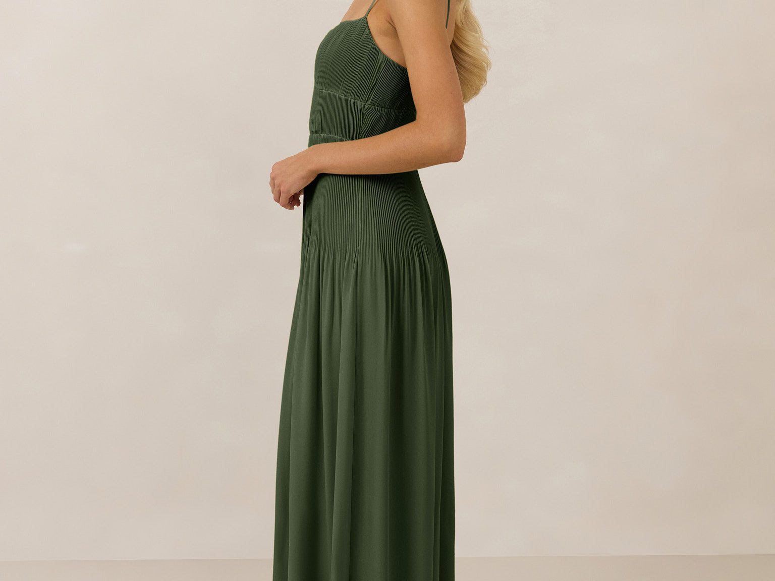 The Lena dress, crafted from airy chiffon, is a harmonious blend of elegance and movement. Its softly pleated skirt drapes gracefully, creating an ethereal flow with every stride. A modern touch is added by the structured V-wire neckline, which not only provides support but also subtly enhances the romantic silhouette.