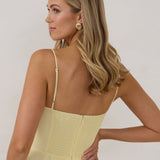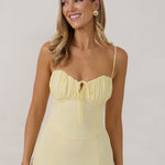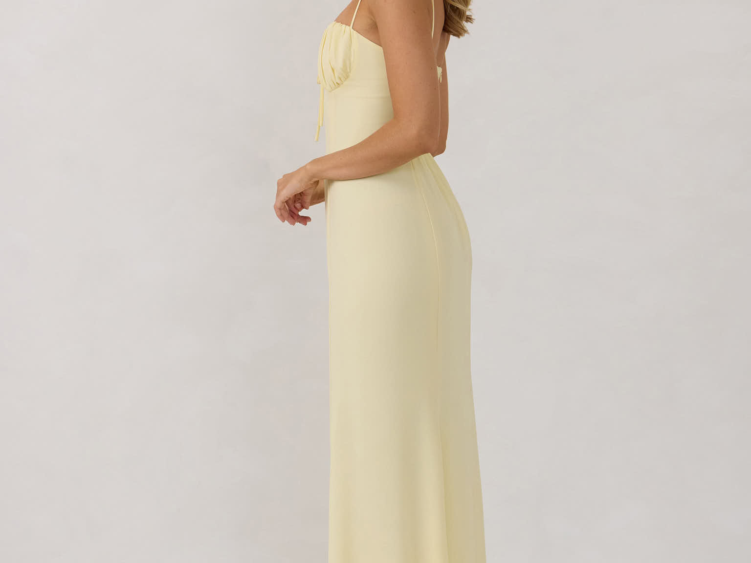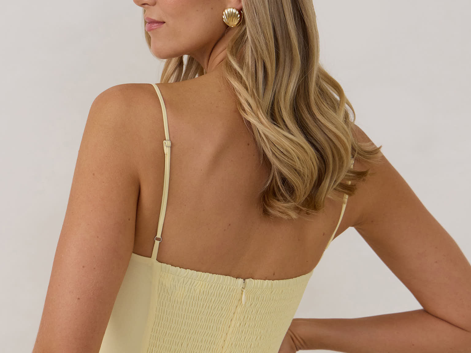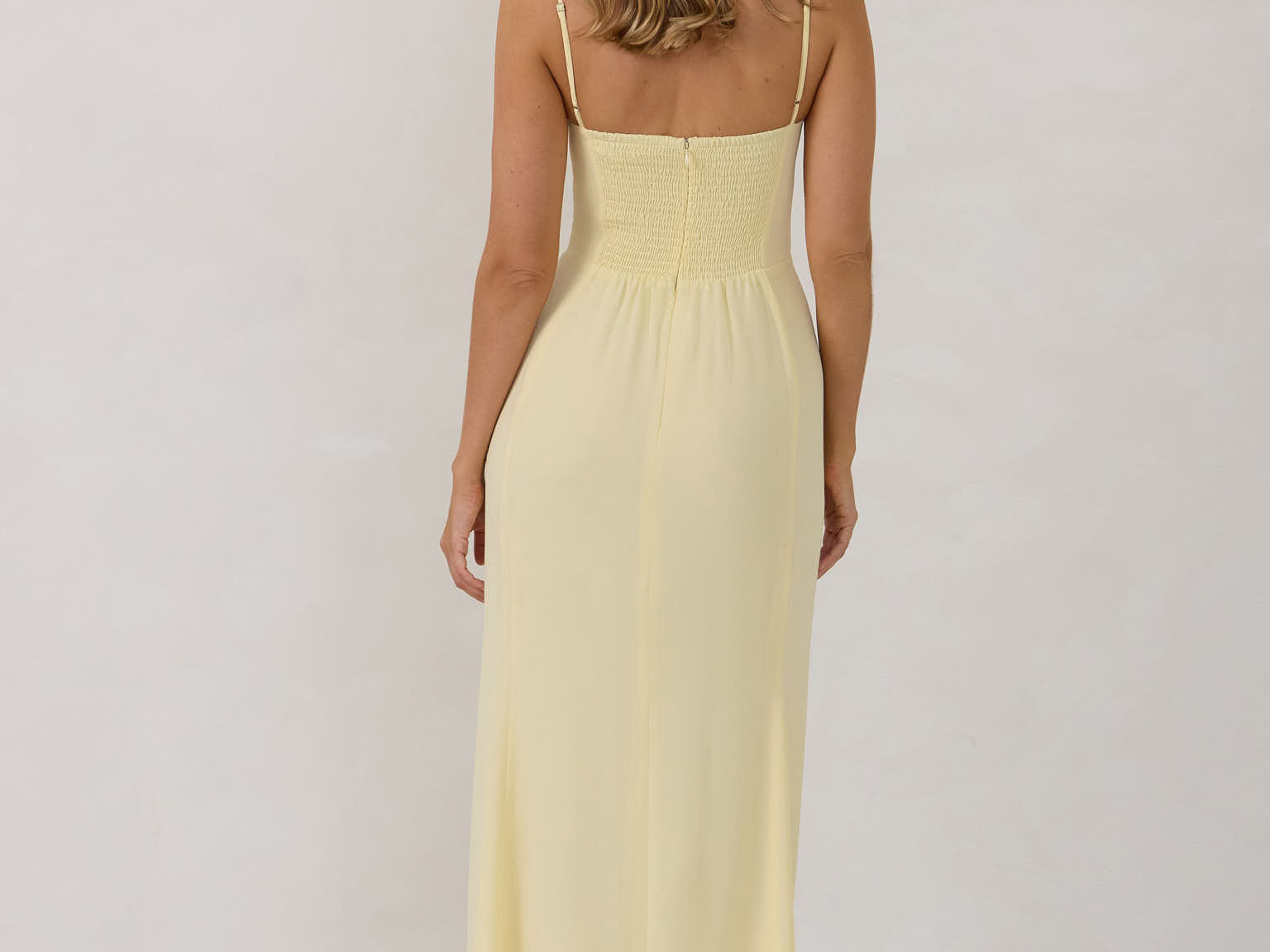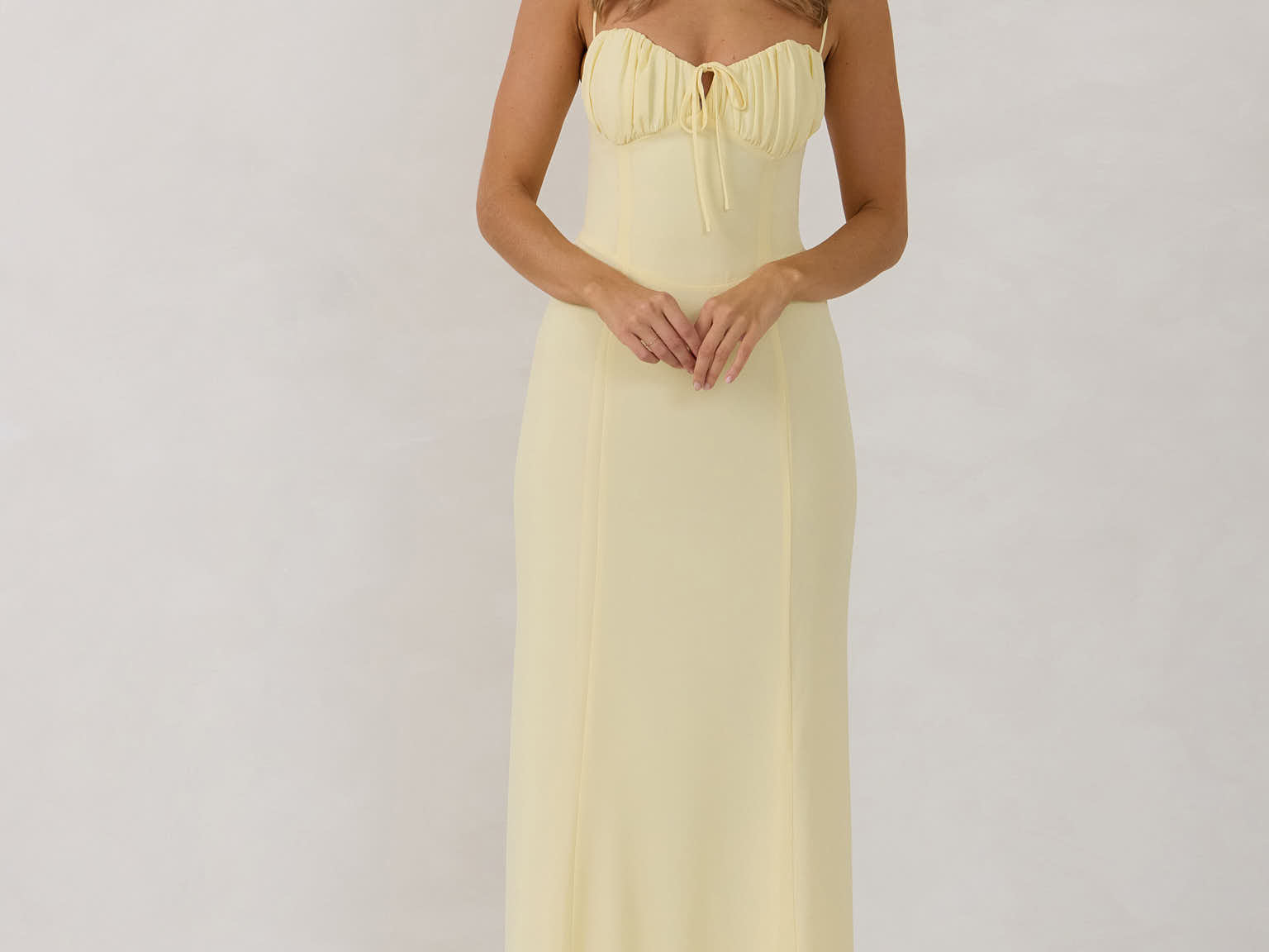 Designed with a basque waist and structured paneling, this dress offers a flattering, sculpted silhouette. The ruched bodice and shirred back give it a comfortable, flexible fit.