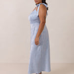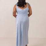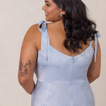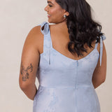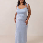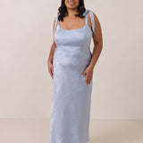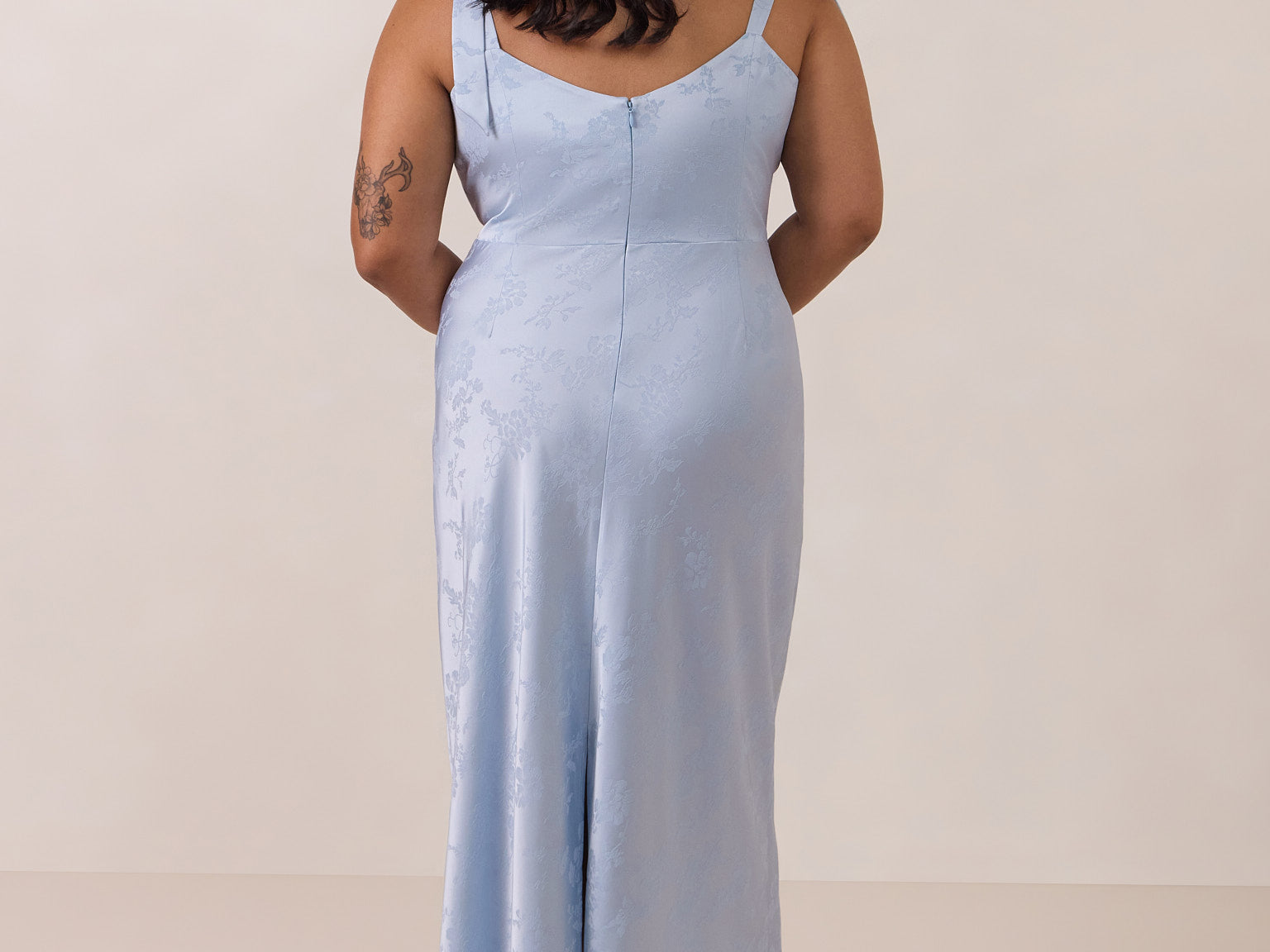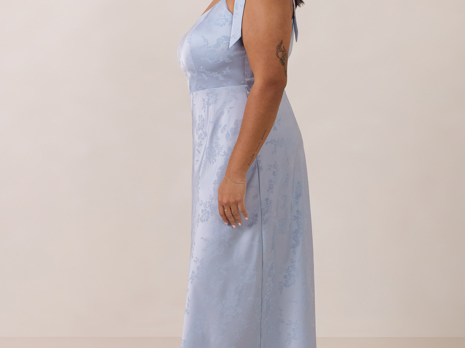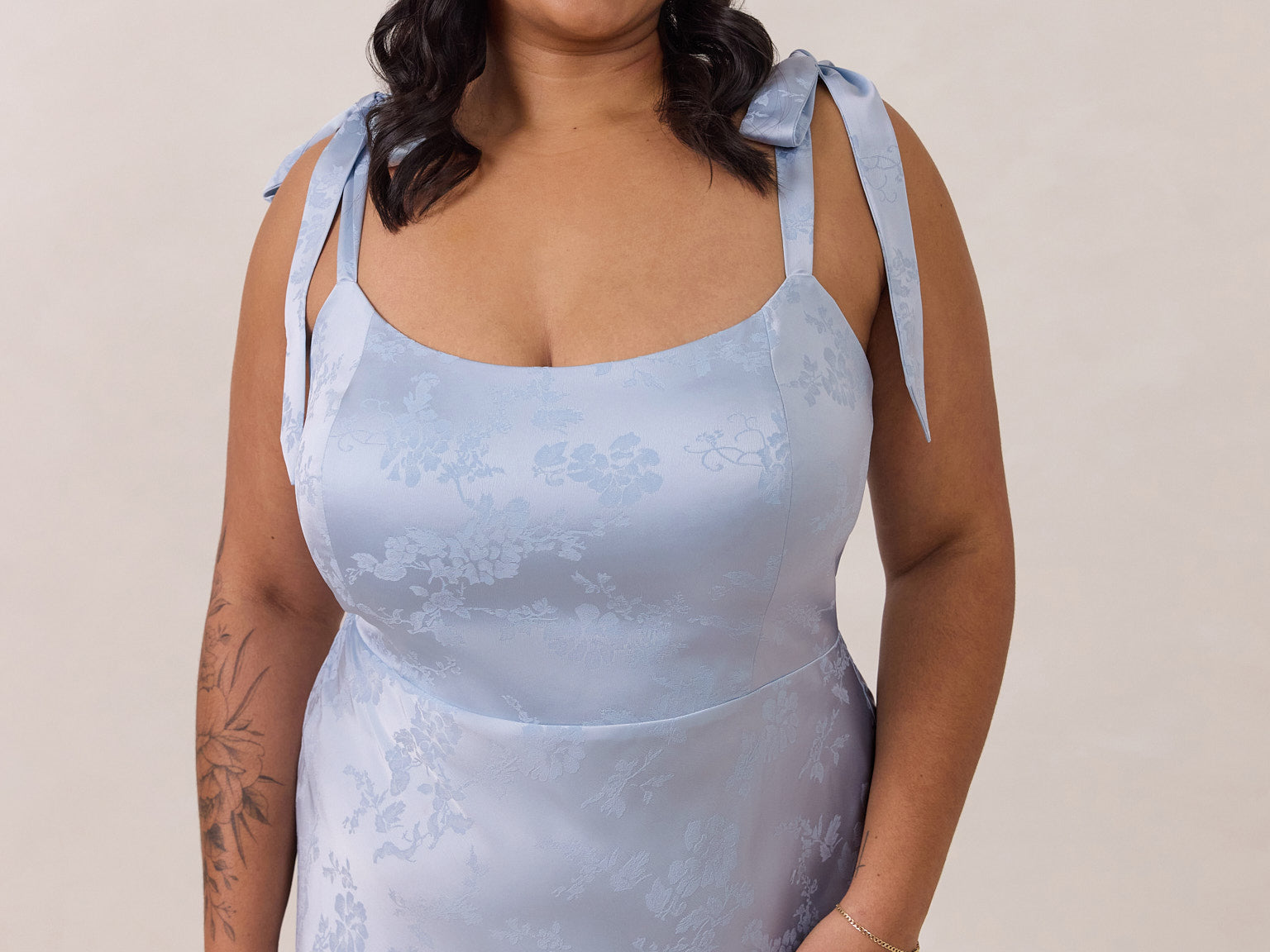Crafted from luxurious Jacquard satin, this dress features feminine tie straps and a flattering bias-cut skirt, offering a flattering silhouette with timeless appeal.