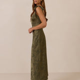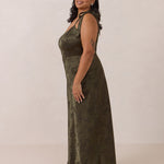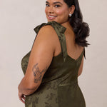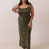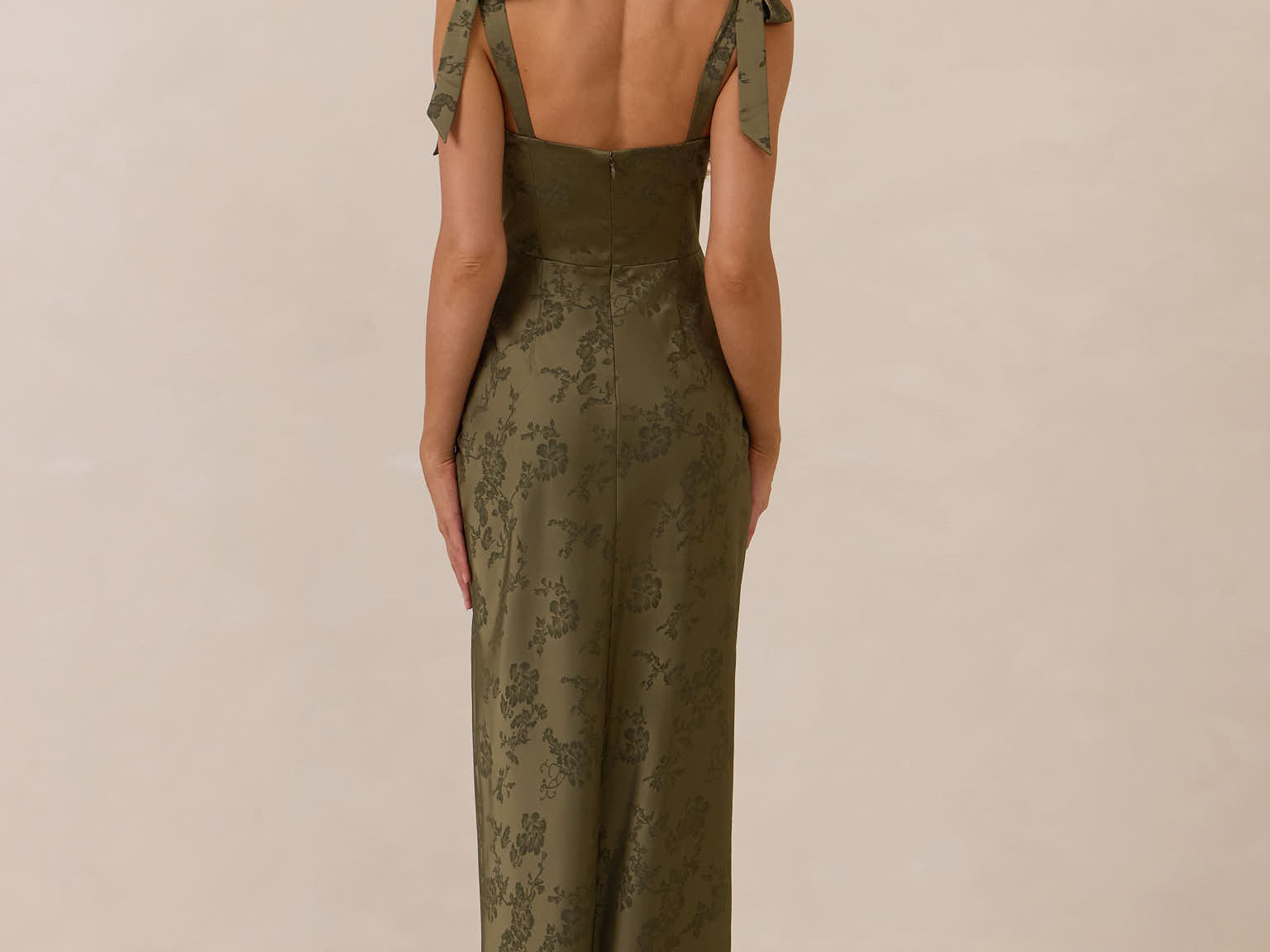 Crafted from luxurious Jacquard satin, this dress features feminine tie straps and a flattering bias-cut skirt, offering a flattering silhouette with timeless appeal.