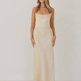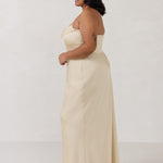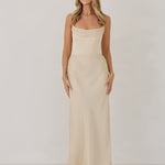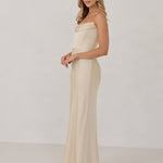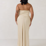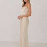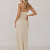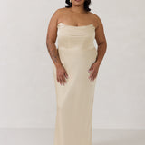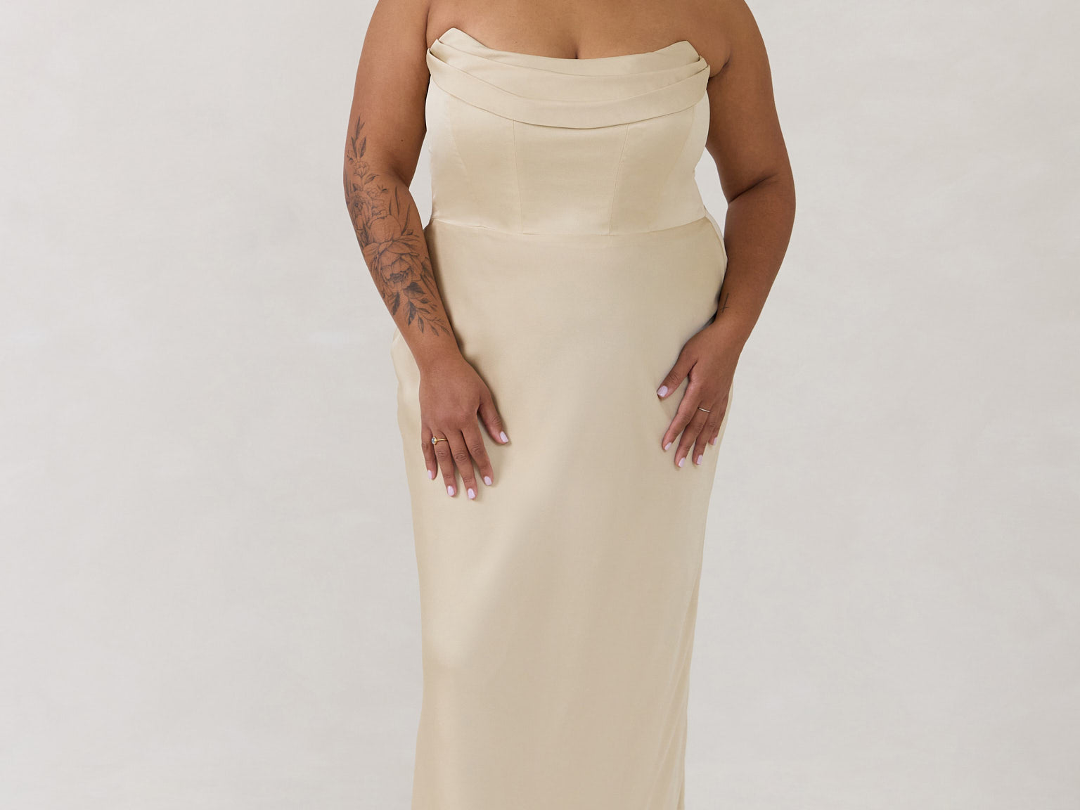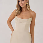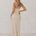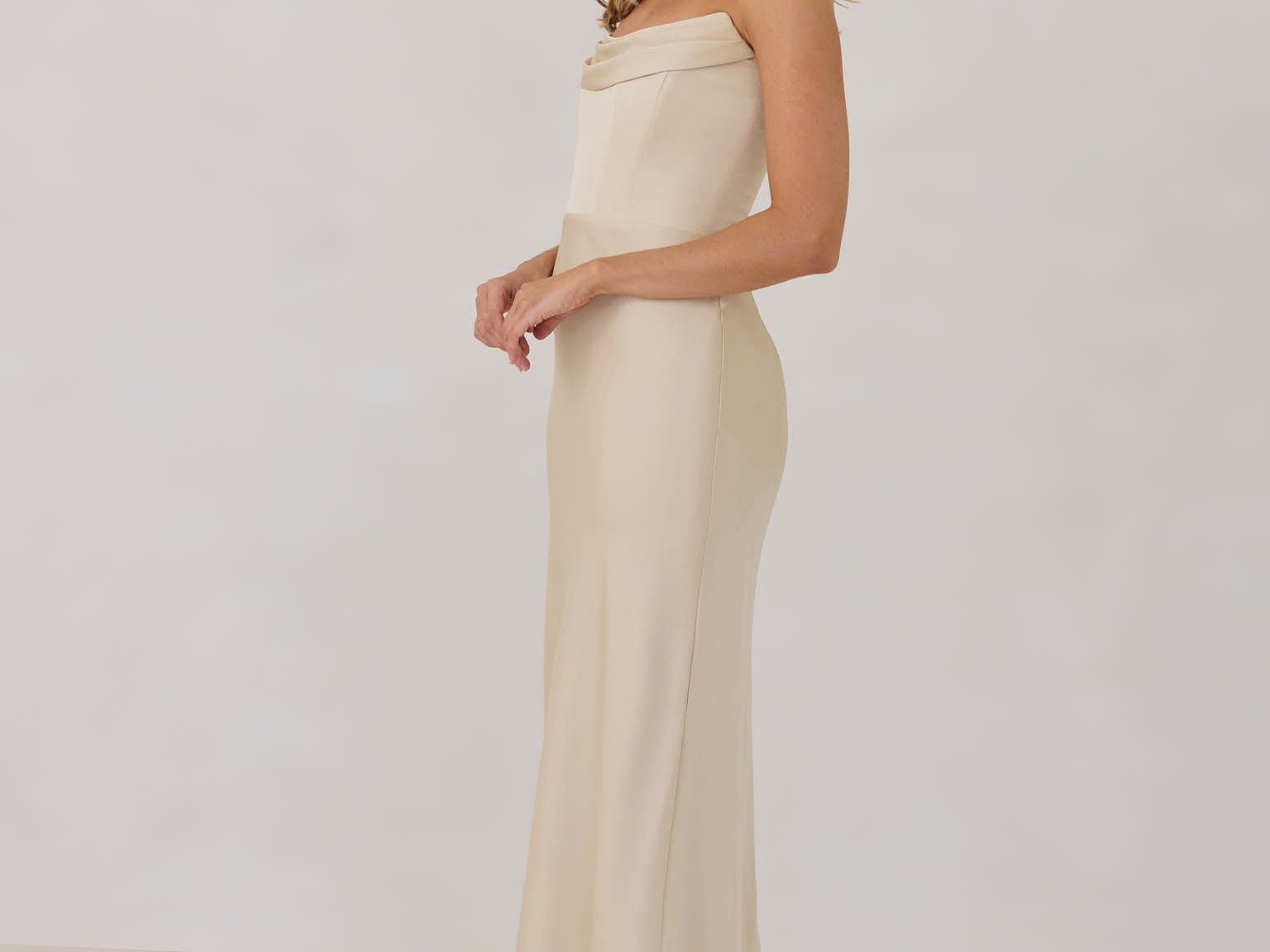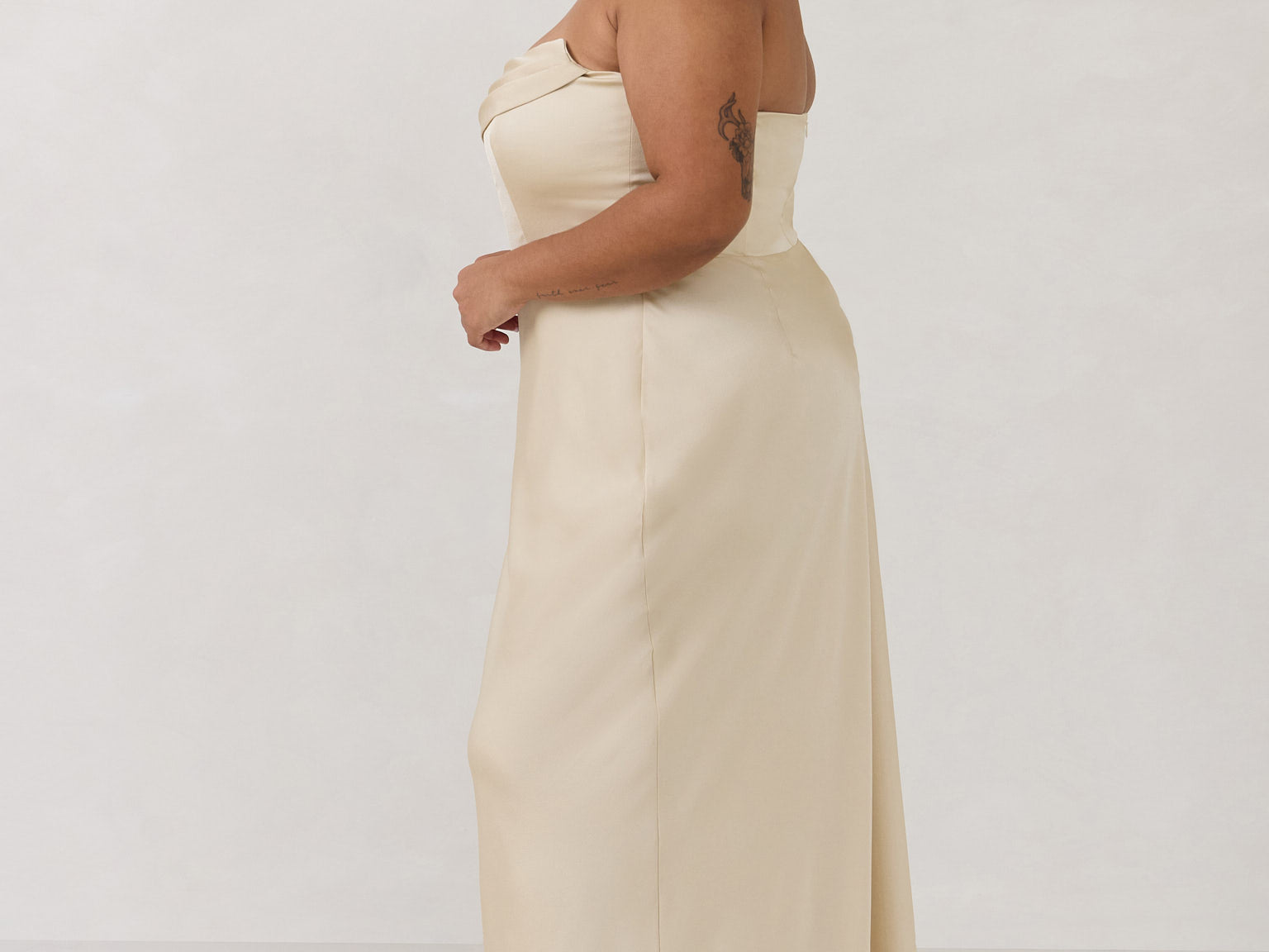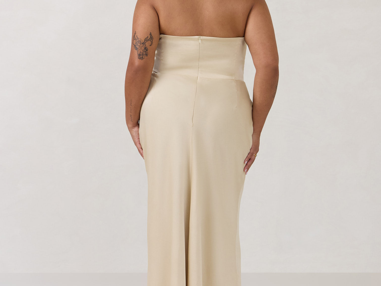 An elegant strapless design with a modern edge, this dress features an exaggerated pointed neckline and a boned bodice for a structured, flattering fit. The bias-cut skirt creates a smooth, elongating silhouette, while the full-length design makes it perfect for galas and formal occasions.