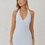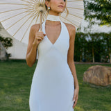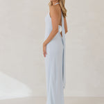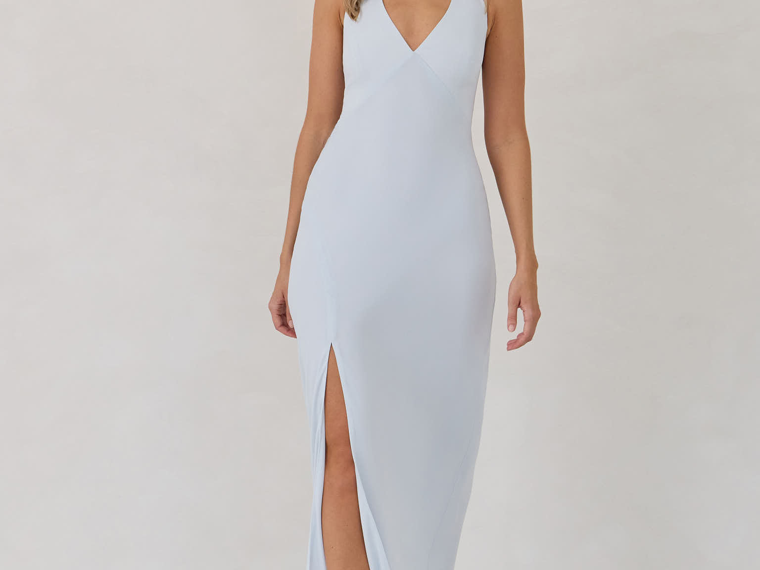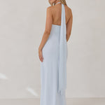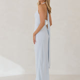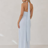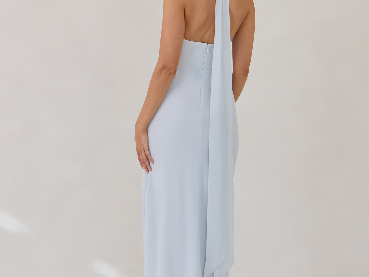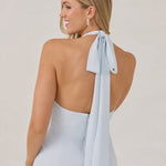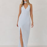 Designed to make an impression. This bust-friendly halter style features long, versatile ties that can be styled in a bow or worn as a neck scarf for a modern touch. Finished with a bias-cut skirt with a slit, this dress balances elegance with a bold edge.