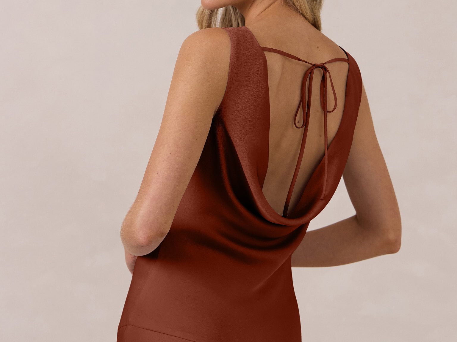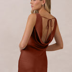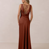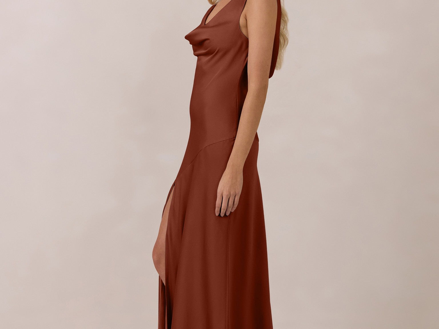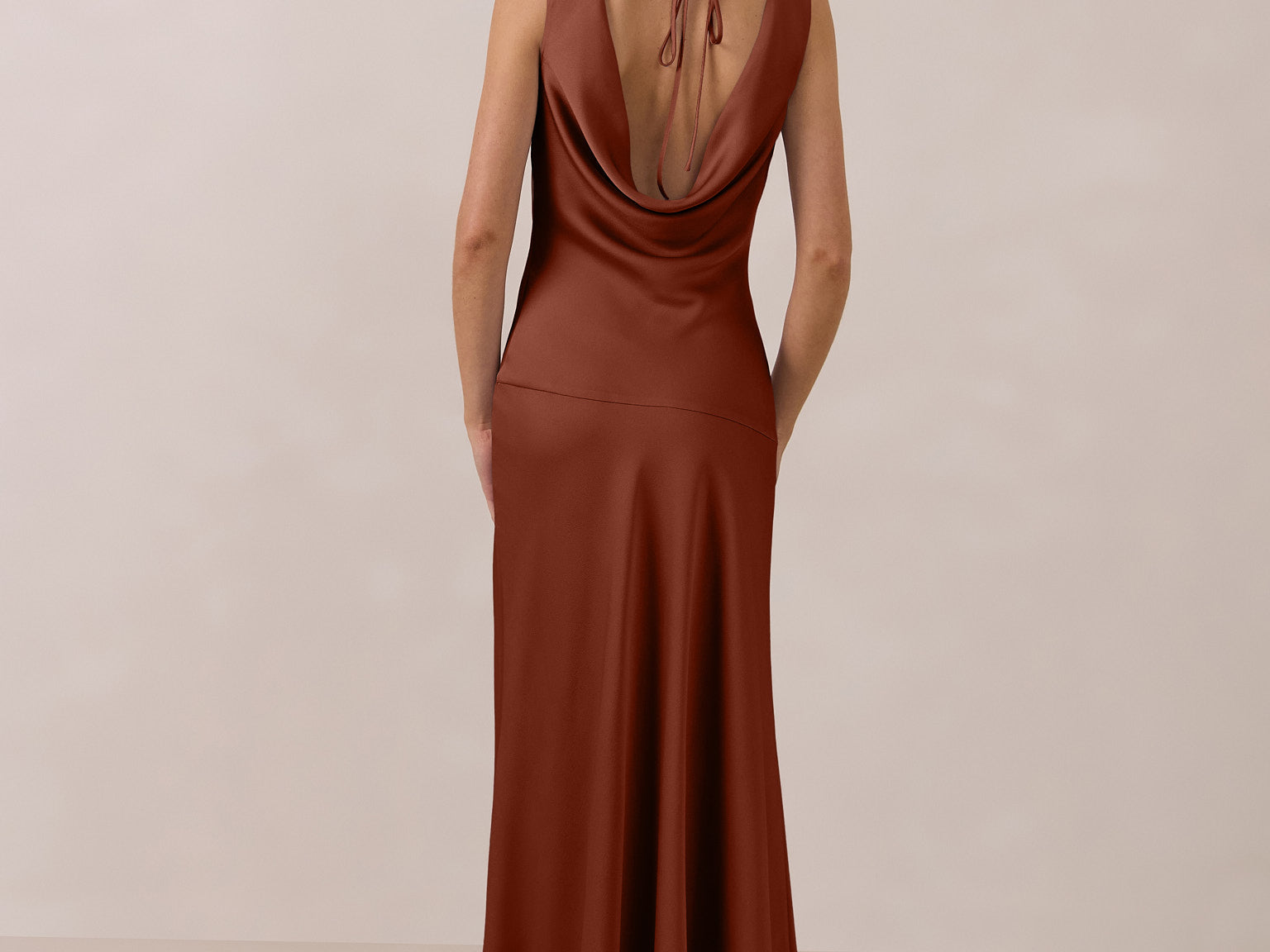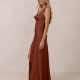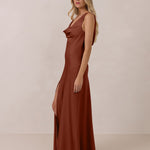 Crafted from soft satin, this full-length dress blends timeless ease with understated drama. A draped cowl neckline and low, open back create an elegant balance of structure and fluidity. The bodice is cut on the bias for a flattering fit, flowing into a fuller skirt with a side slit for a subtle hint of movement.
