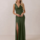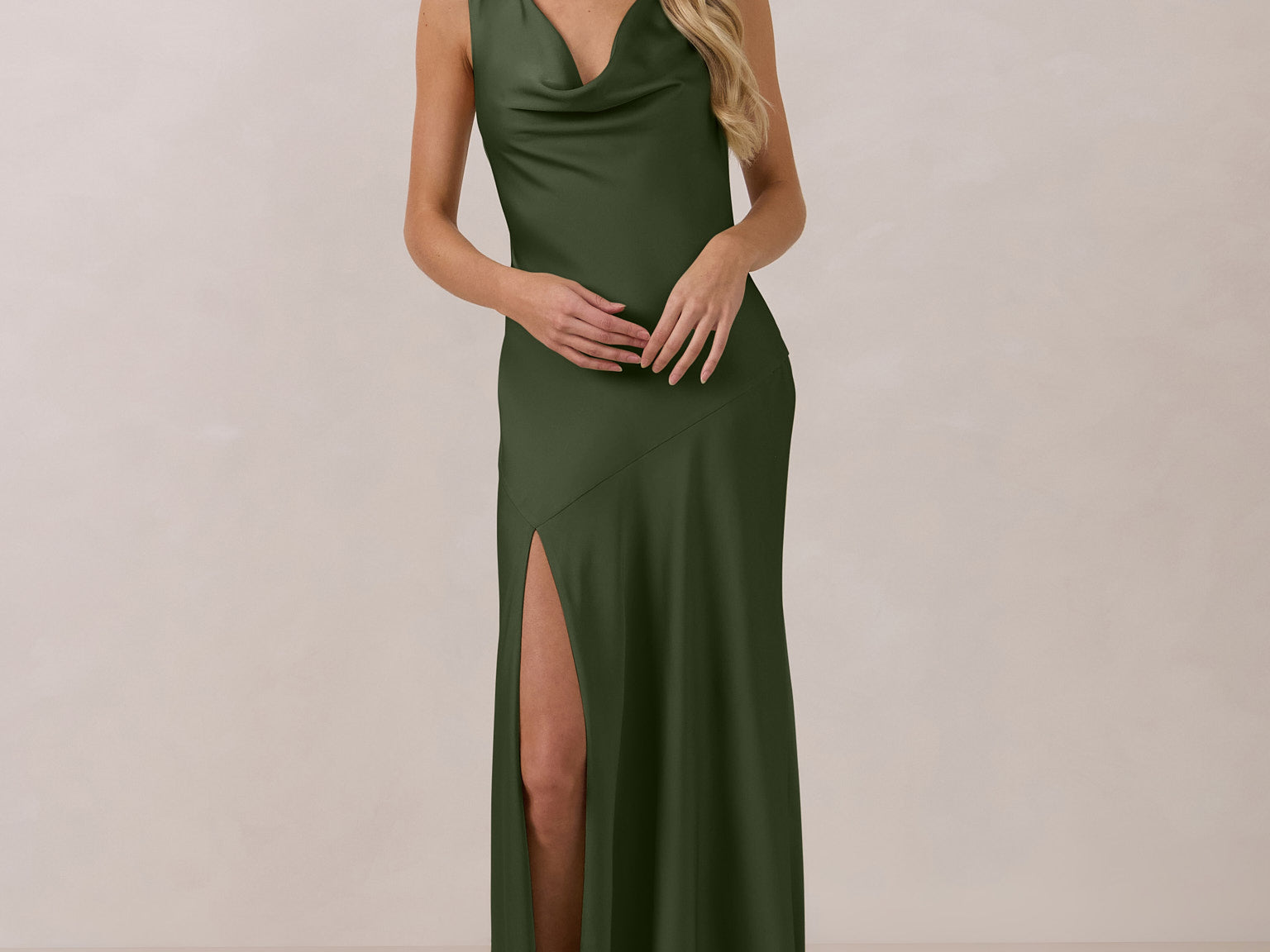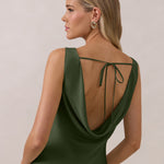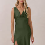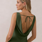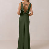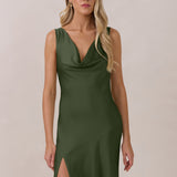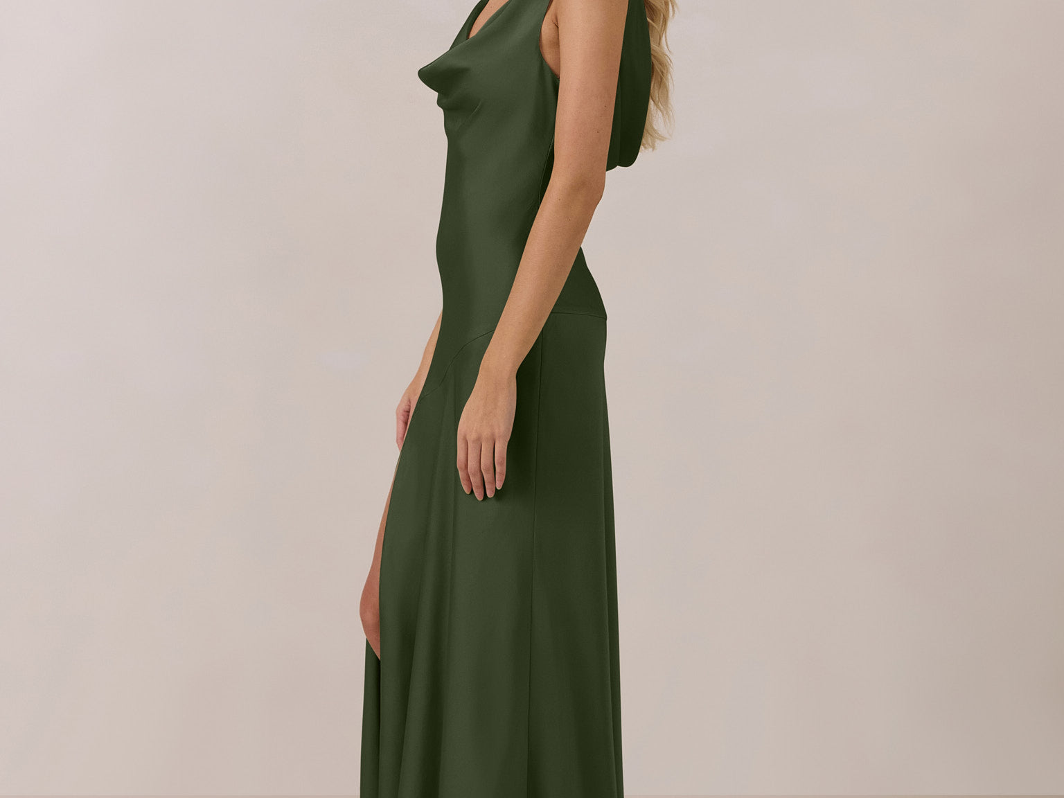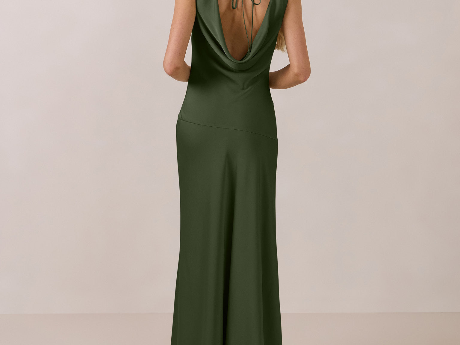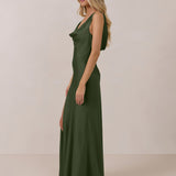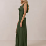 Crafted from soft satin, this full-length dress blends timeless ease with understated drama. A draped cowl neckline and low, open back create an elegant balance of structure and fluidity. The bodice is cut on the bias for a flattering fit, flowing into a fuller skirt with a side slit for a subtle hint of movement.