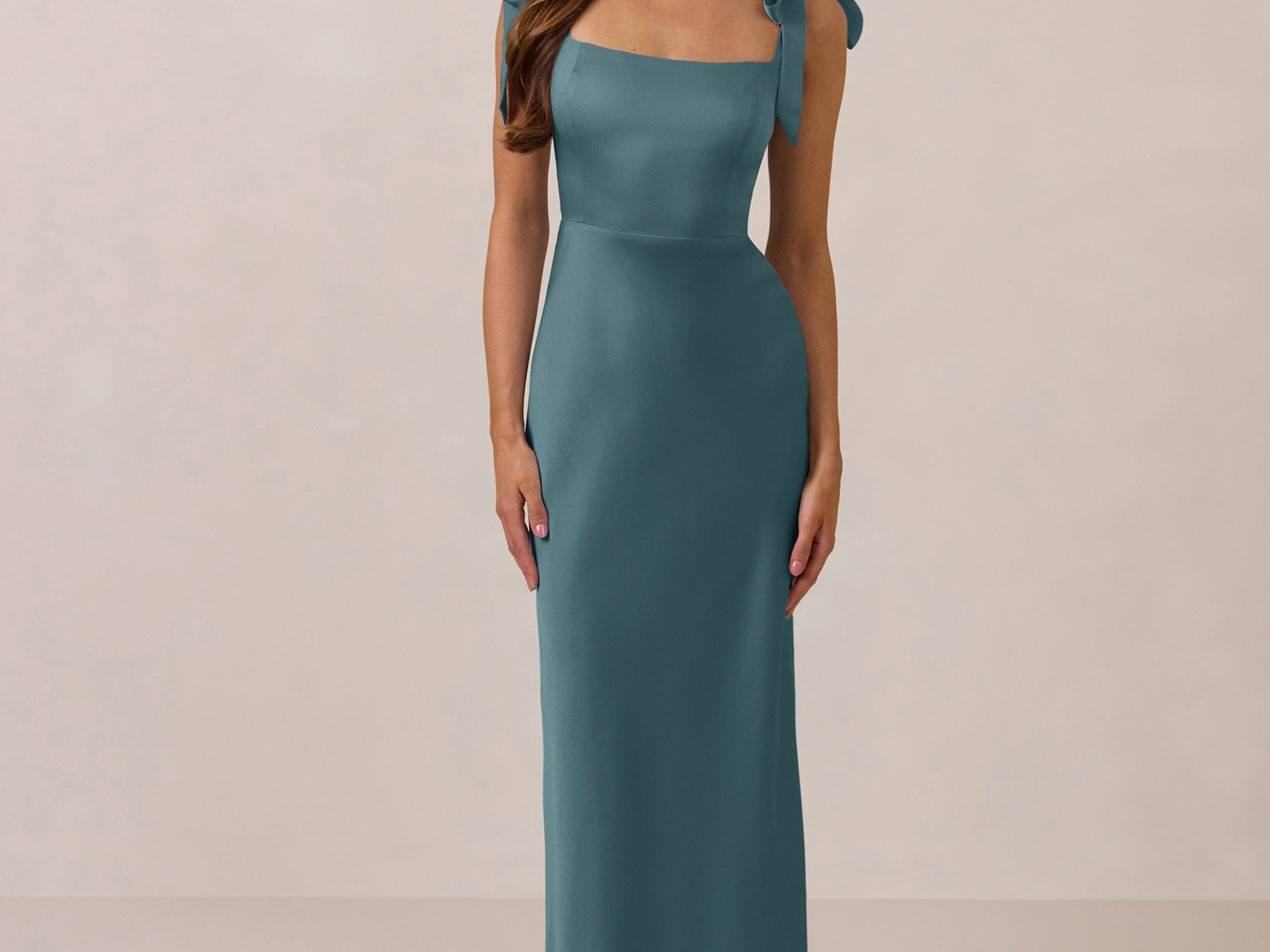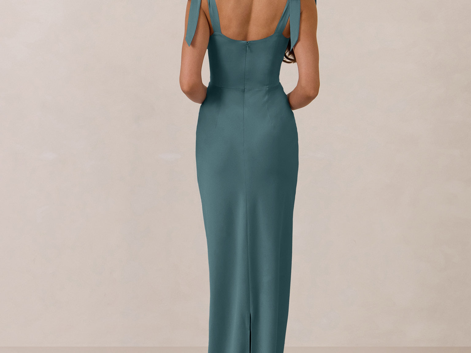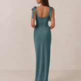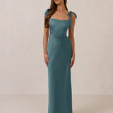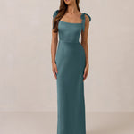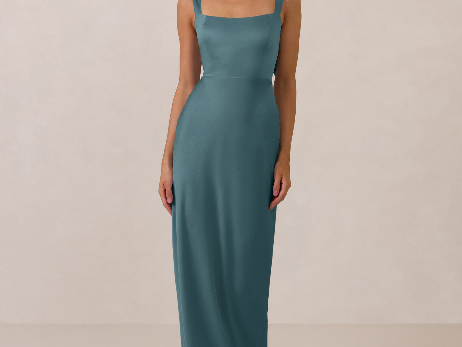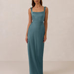 This full-length dress, made from luxurious satin, features a sleek square neckline and thick tie straps, offering a structured yet effortless aesthetic. The slim-fit skirt gently embraces the body, creating a smooth and elongated silhouette. An invisible back zipper ensures a seamless finish, making this dress ideal for sophisticated evening events.