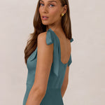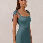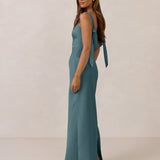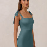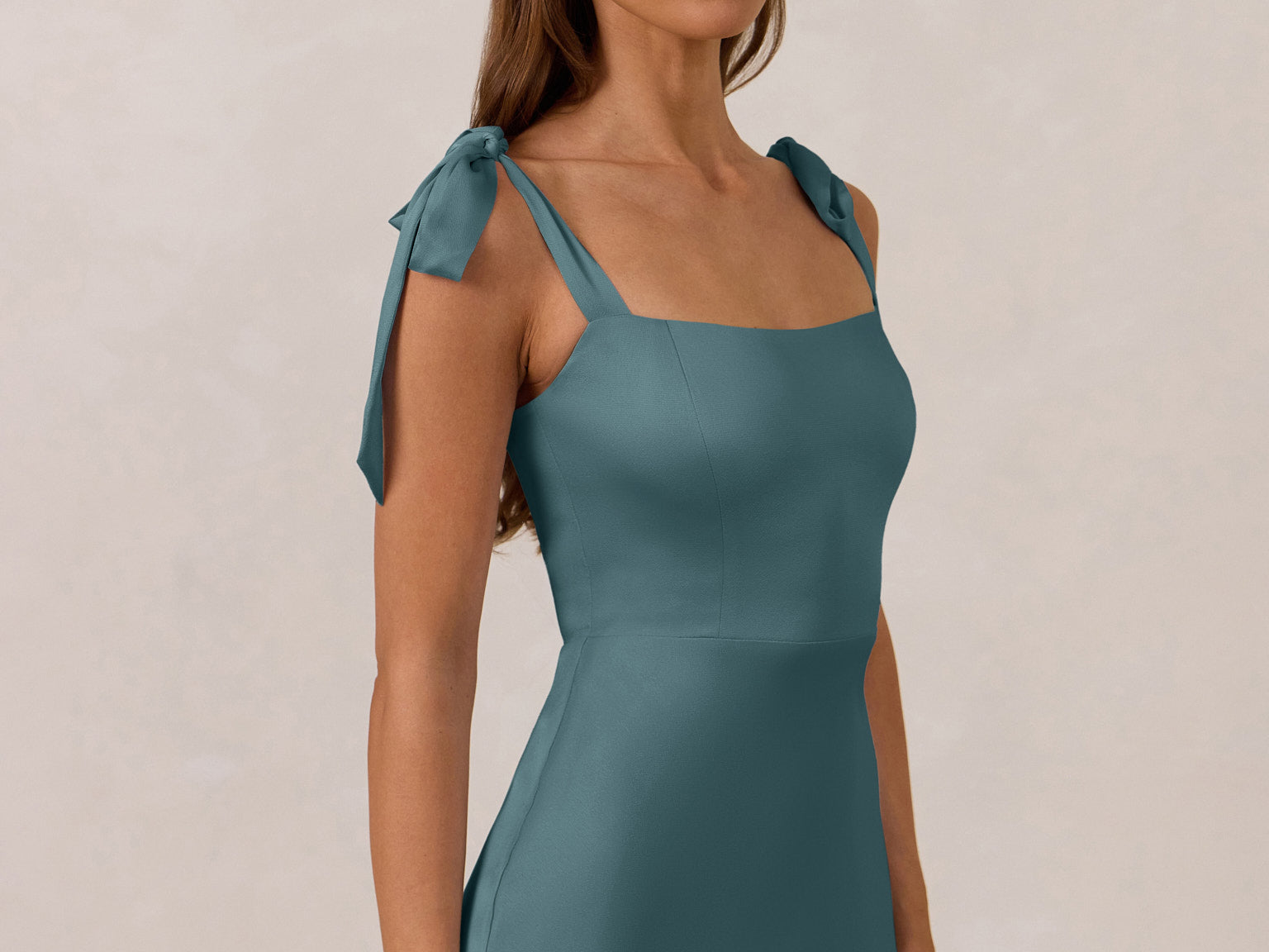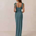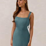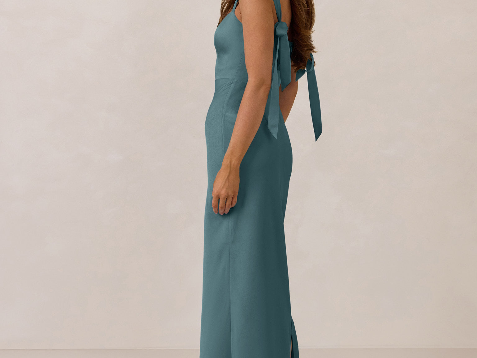 This full-length dress, made from luxurious satin, features a sleek square neckline and thick tie straps, offering a structured yet effortless aesthetic. The slim-fit skirt gently embraces the body, creating a smooth and elongated silhouette. An invisible back zipper ensures a seamless finish, making this dress ideal for sophisticated evening events.