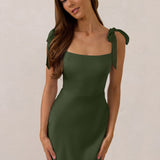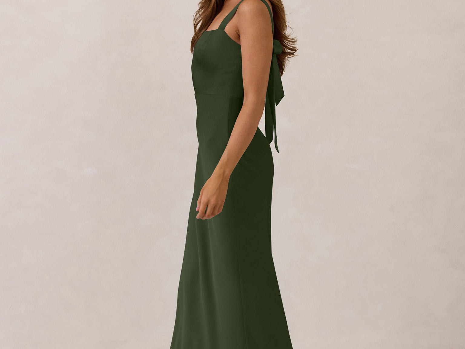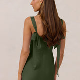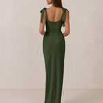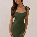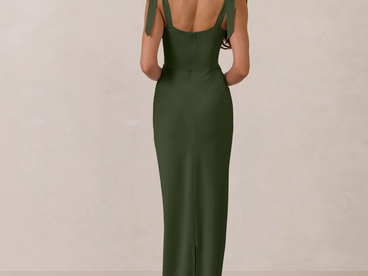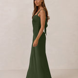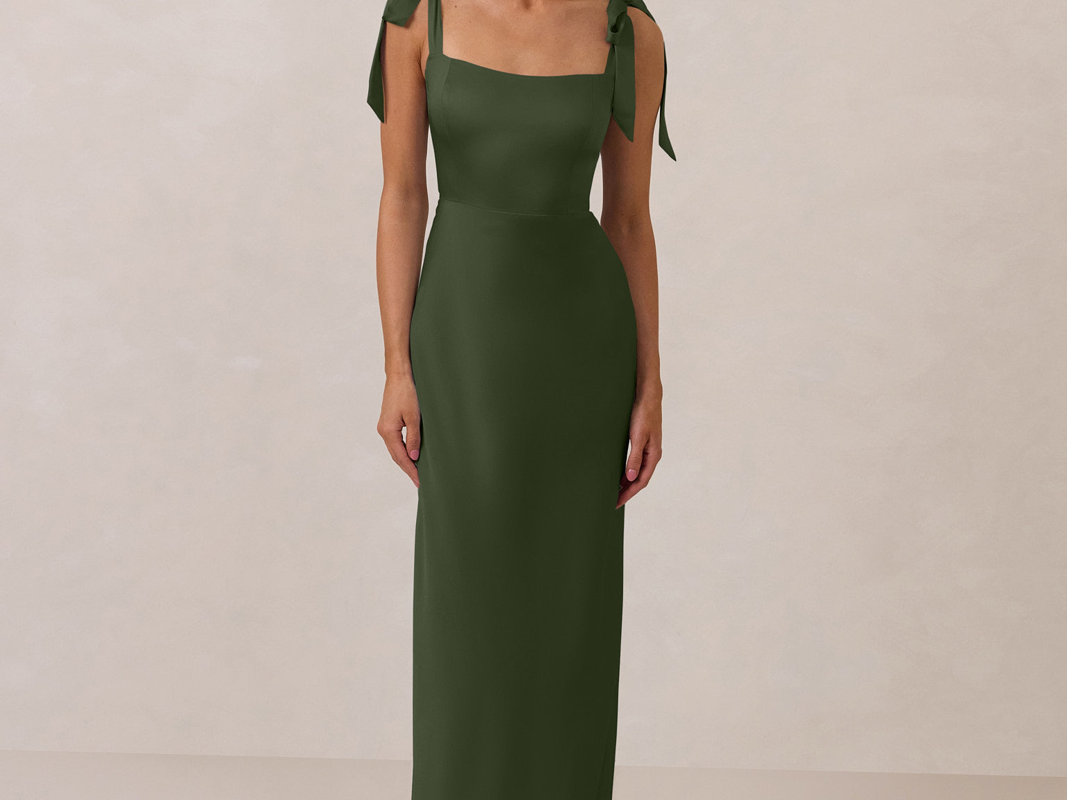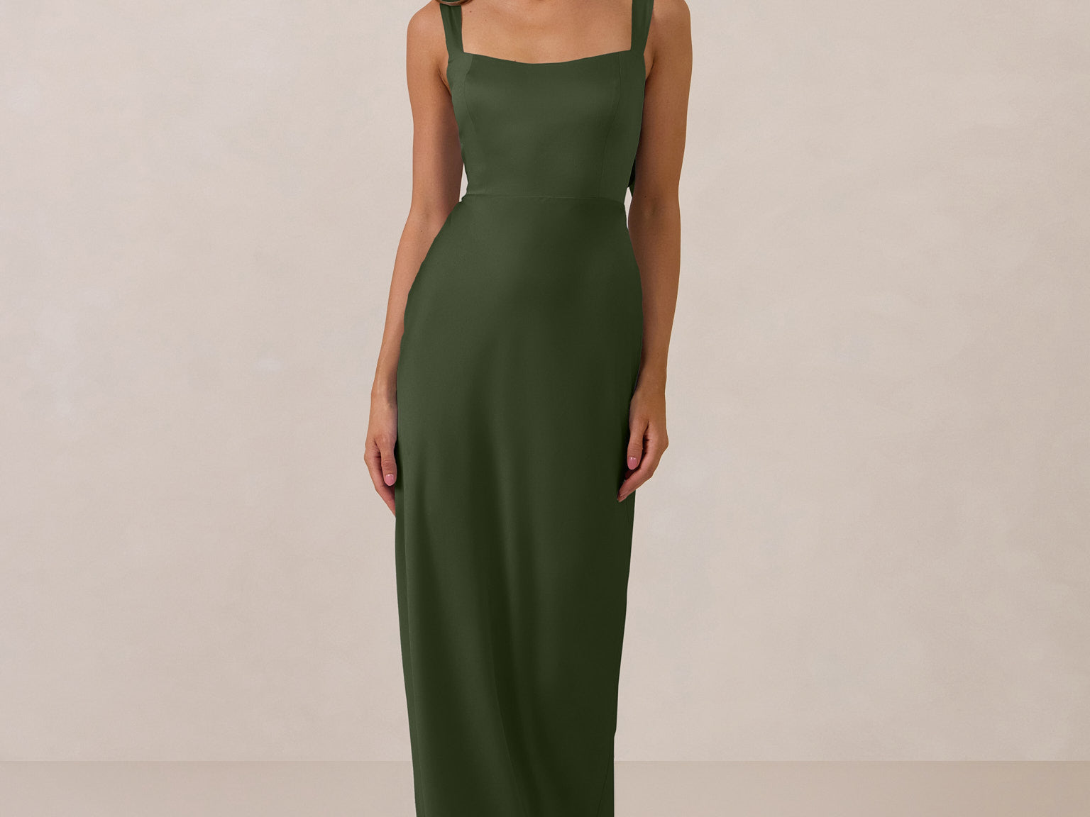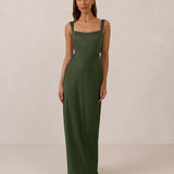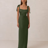This full-length dress, made from luxurious satin, features a sleek square neckline and thick tie straps, offering a structured yet effortless aesthetic. The slim-fit skirt gently embraces the body, creating a smooth and elongated silhouette. An invisible back zipper ensures a seamless finish, making this dress ideal for sophisticated evening events.