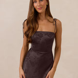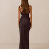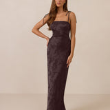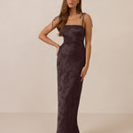 The Beckett dress embodies understated sophistication. Its floor-grazing silhouette flows effortlessly, complemented by a subtle back slit for added movement and a modern touch. Featuring a softly structured bodice and adjustable tie straps, it ensures both comfort and a tailored fit, making it perfect for any occasion requiring quiet confidence.