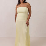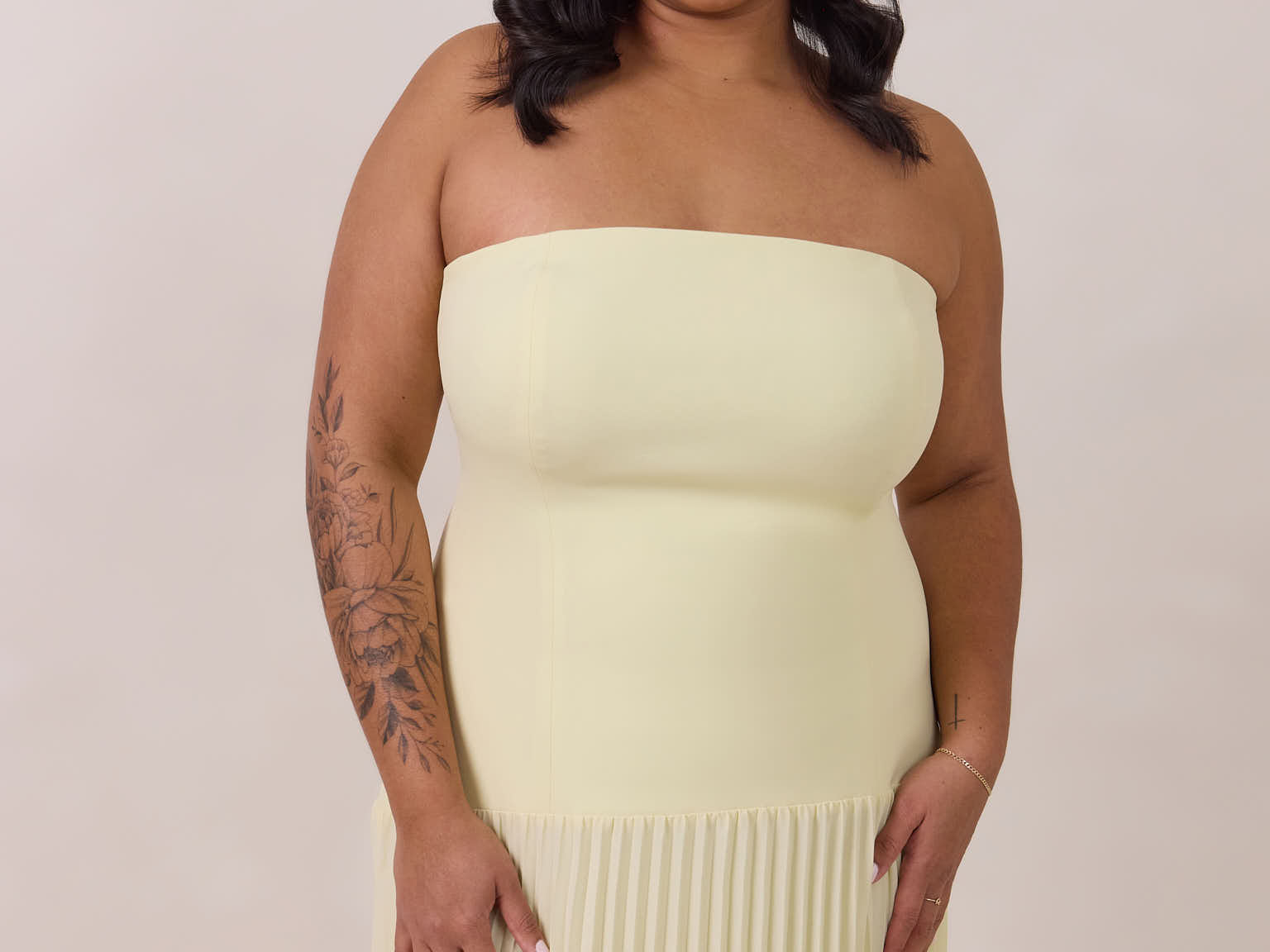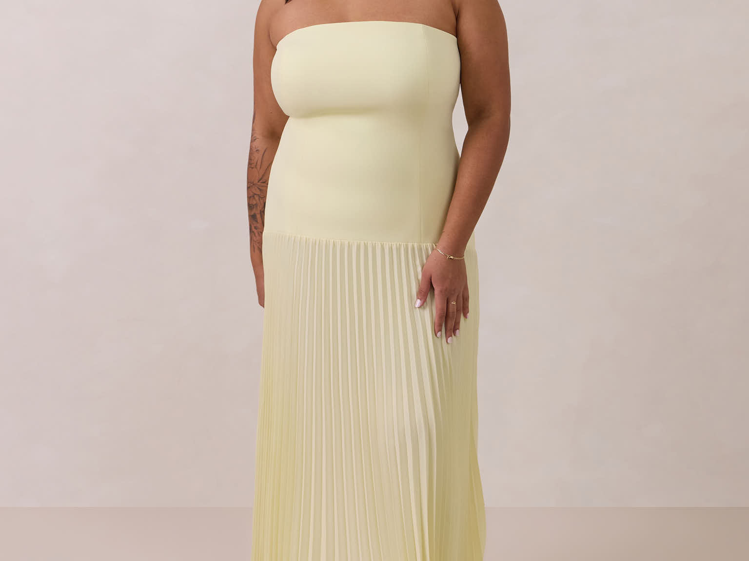 This dress captivates with its sleek stretch-crepe bodice and dreamy pleated skirt. The stretch crepe molds gently to your shape for a comfortable, supportive and flattering fit, while the lightweight skirt offers easy, effortless movement.
