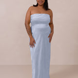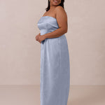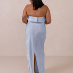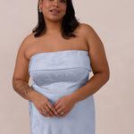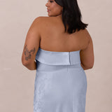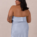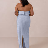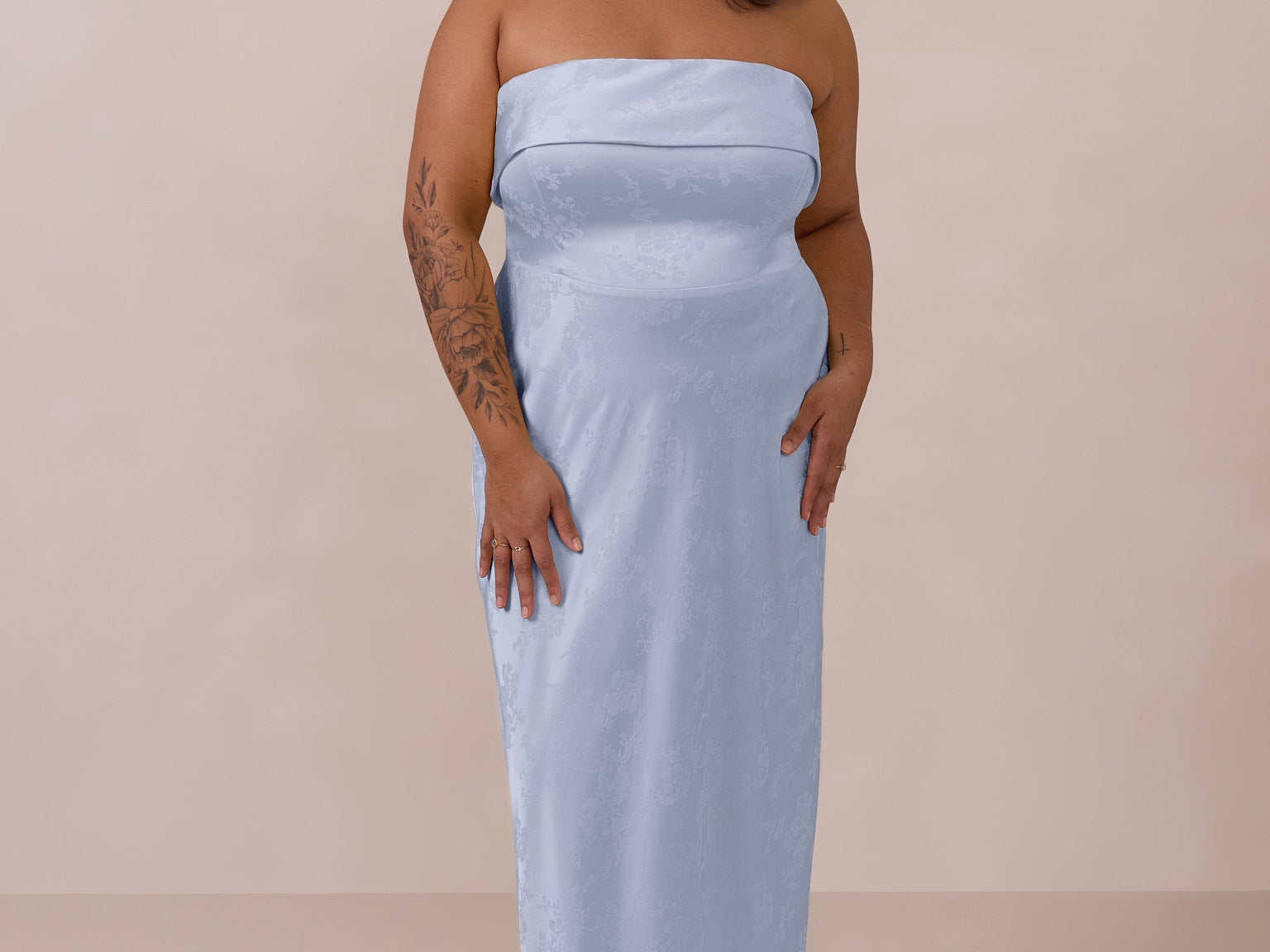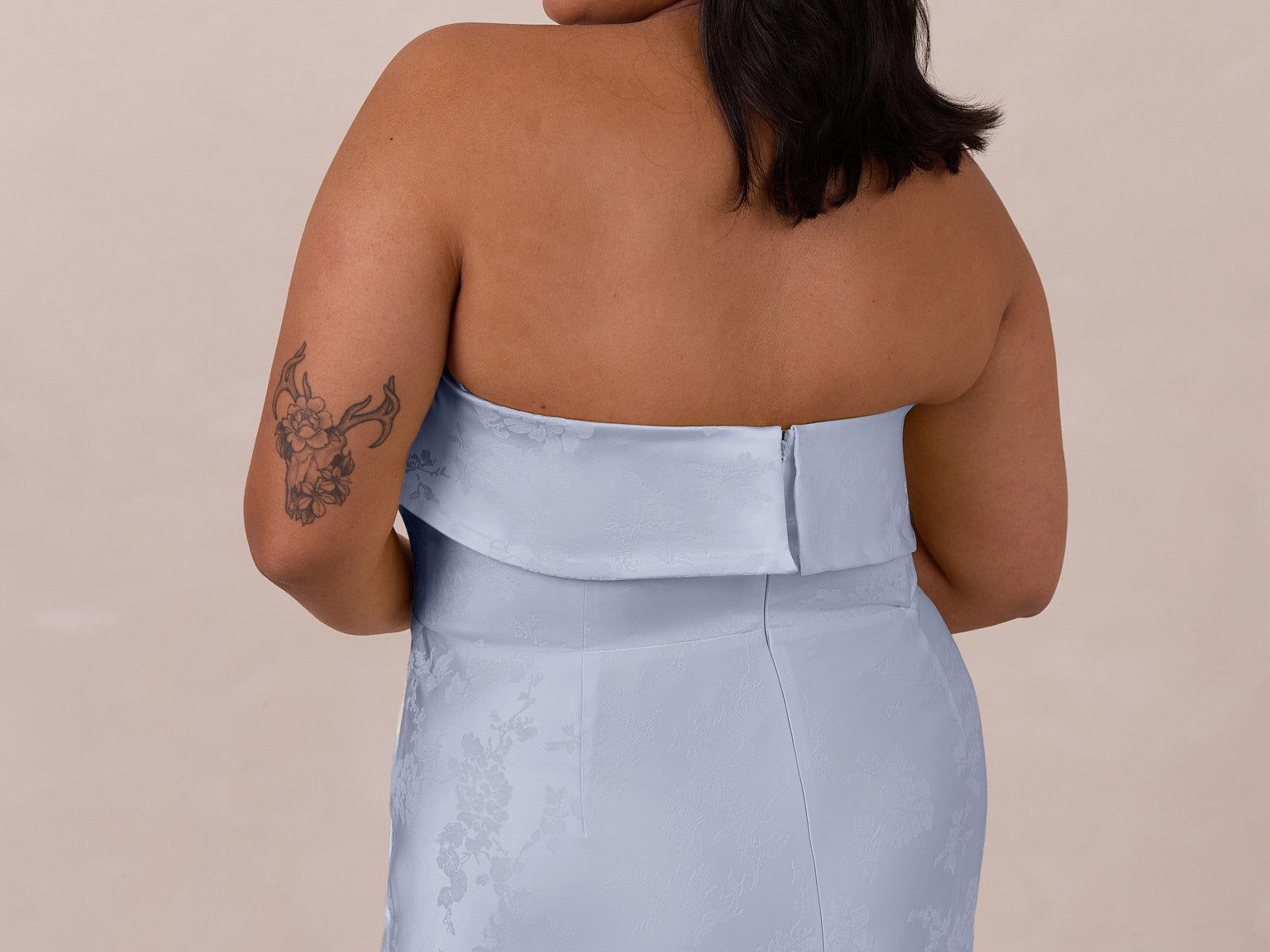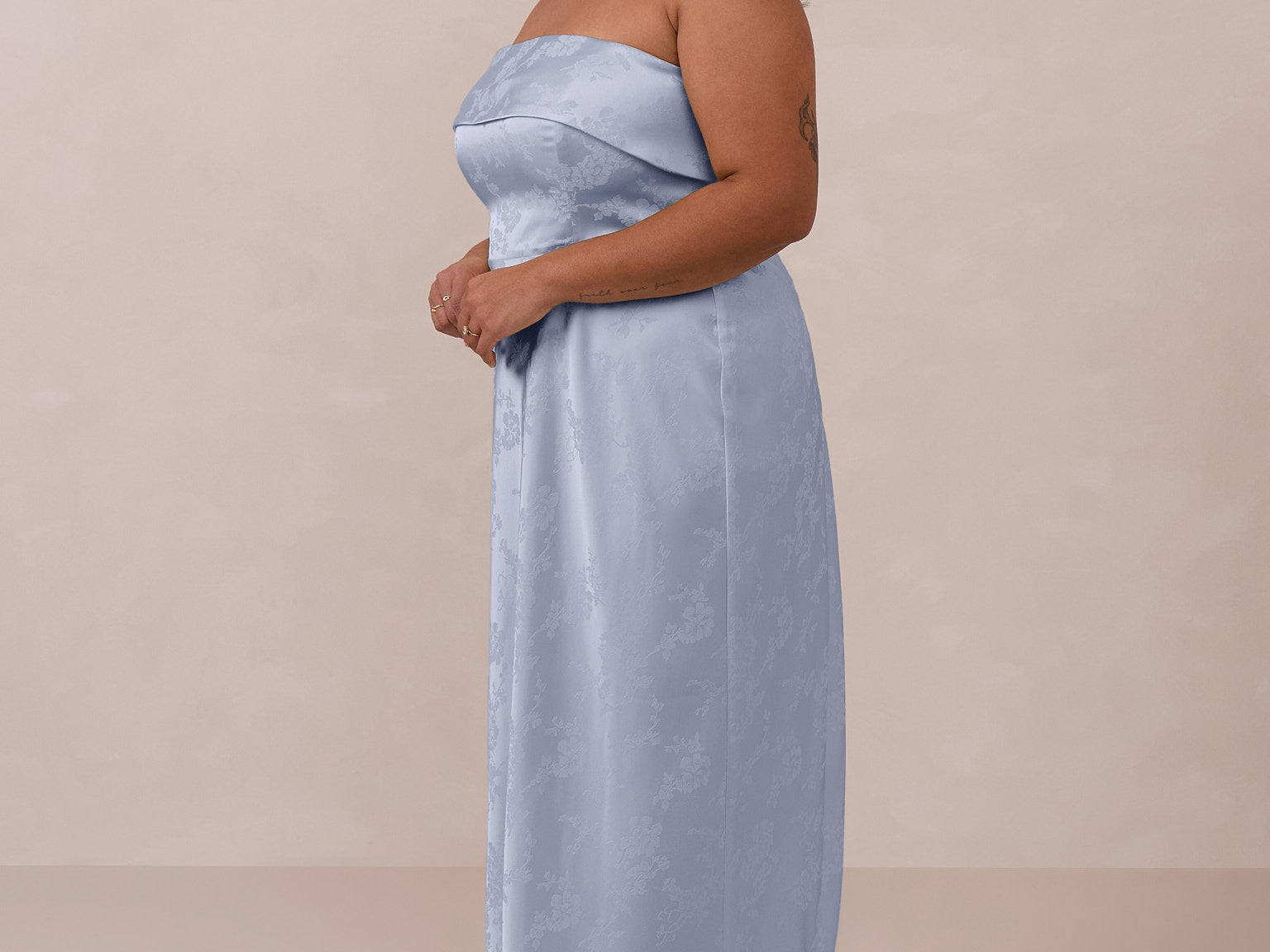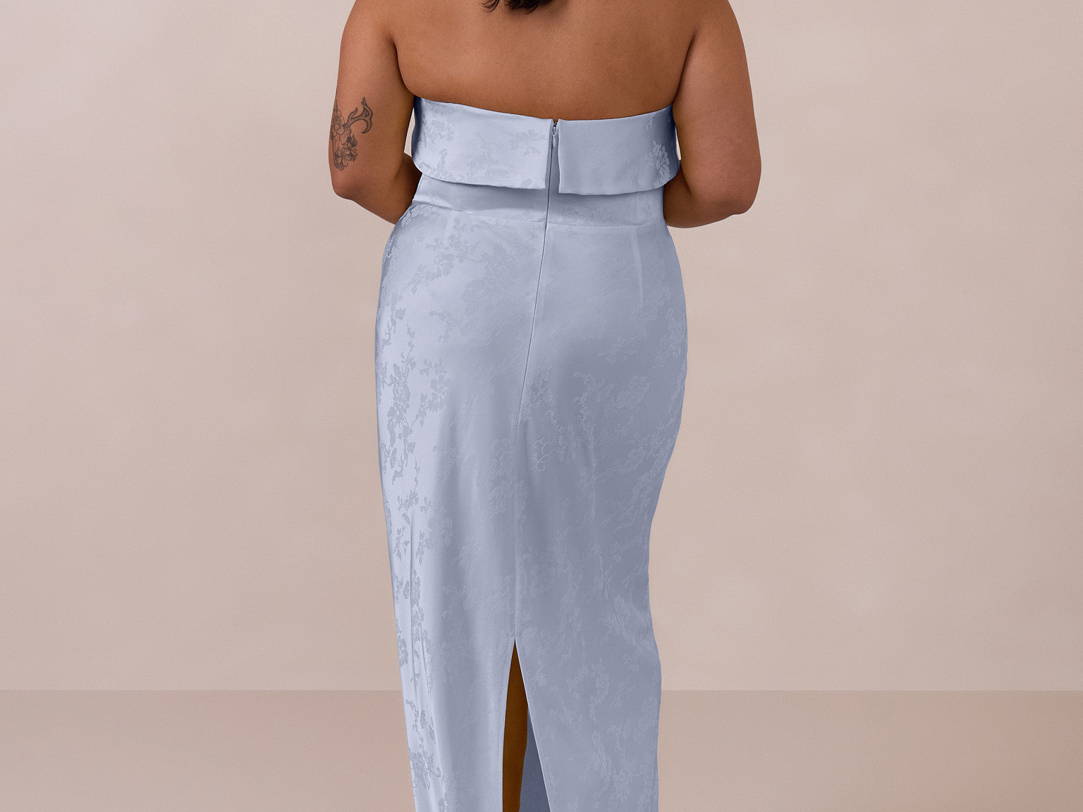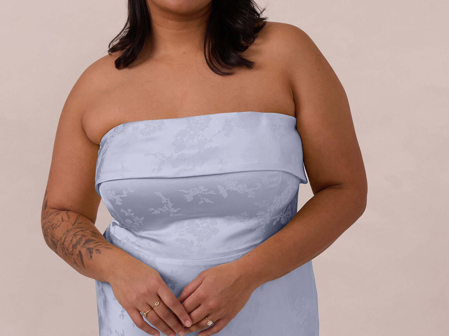 A timeless piece designed to captivate. Designed from luxe jacquard fabric with a subtle sheen and intricate texture, this dress exudes understated glamour. The structured, folded strapless neckline adds a modern sculptural element, gracefully framing the shoulders.