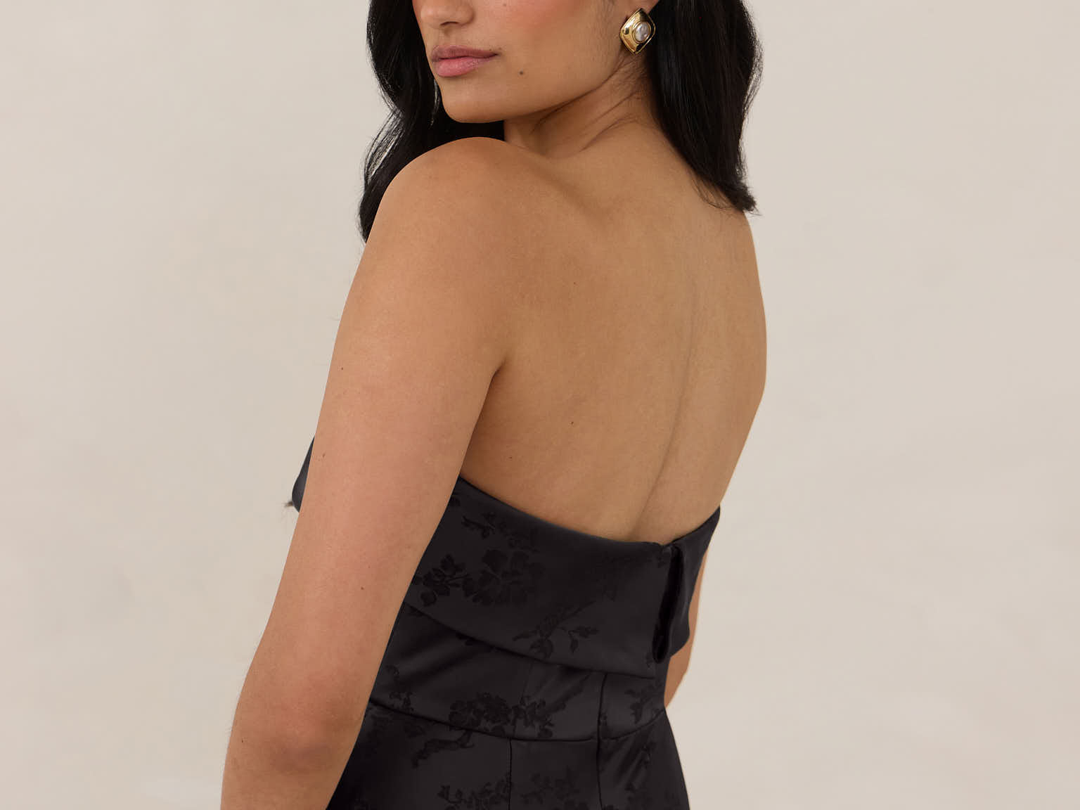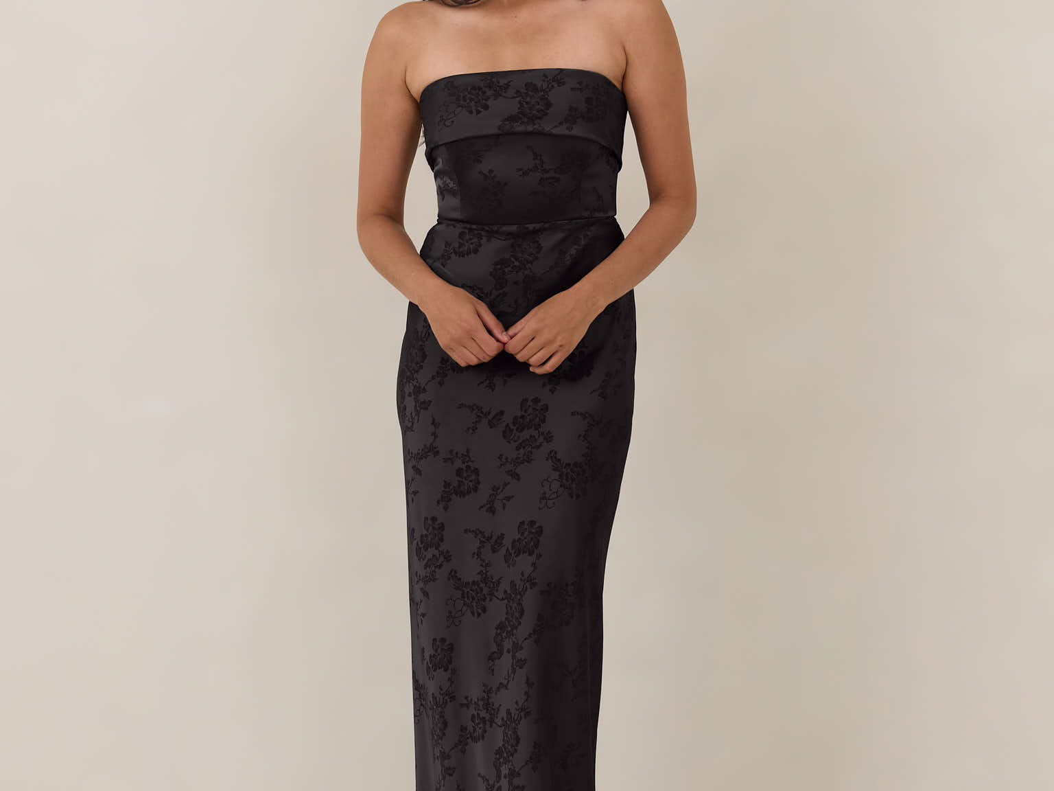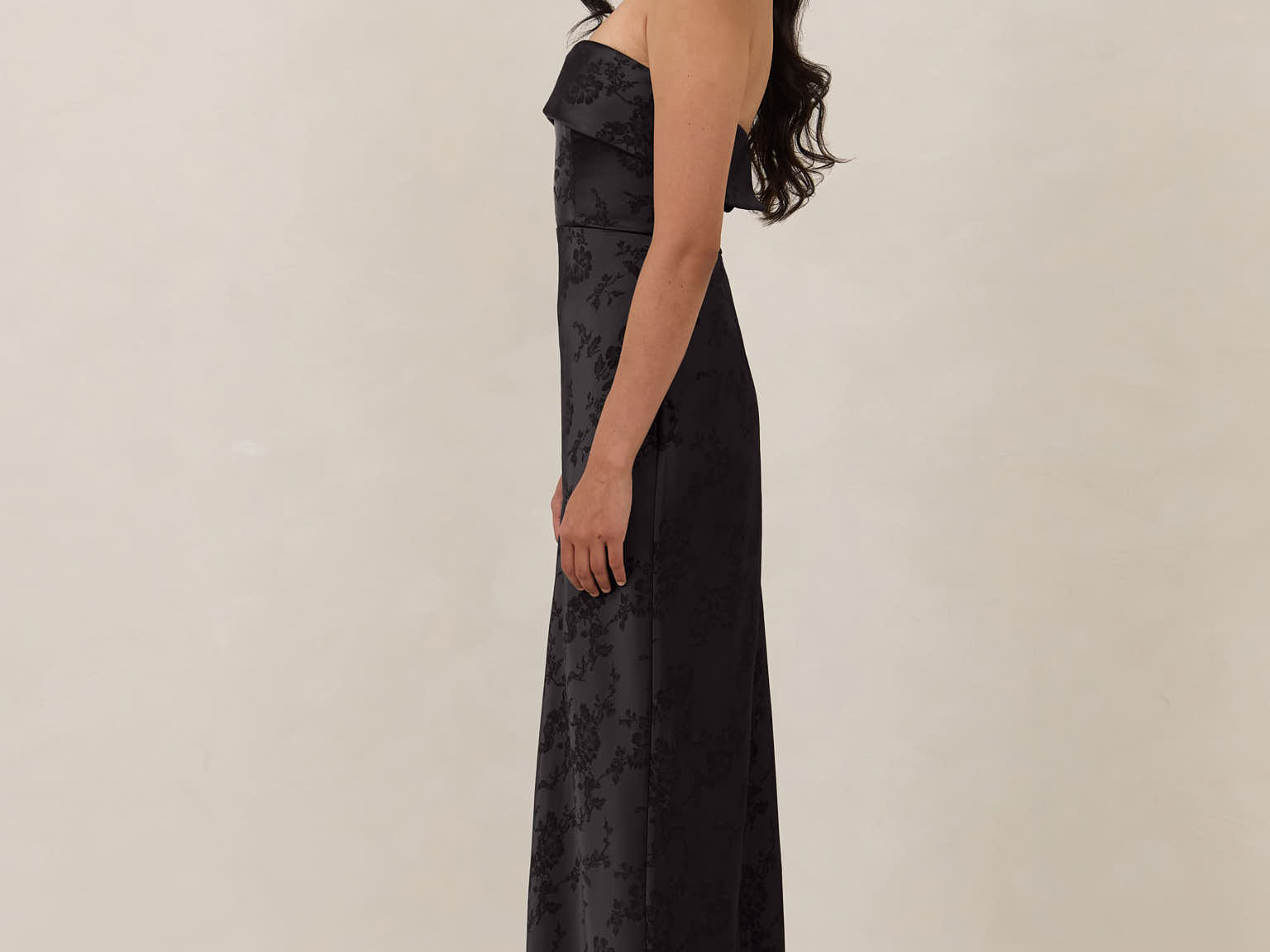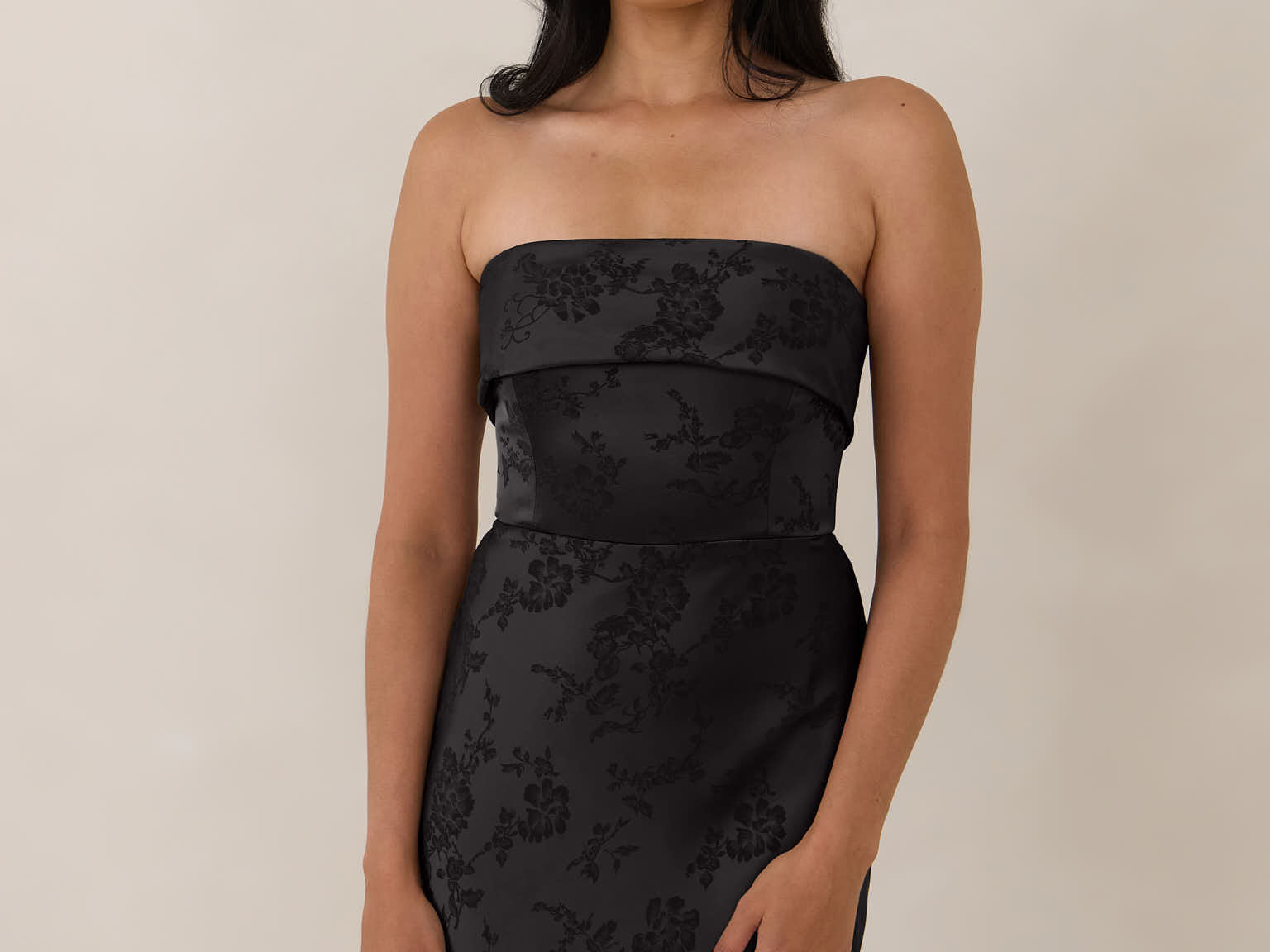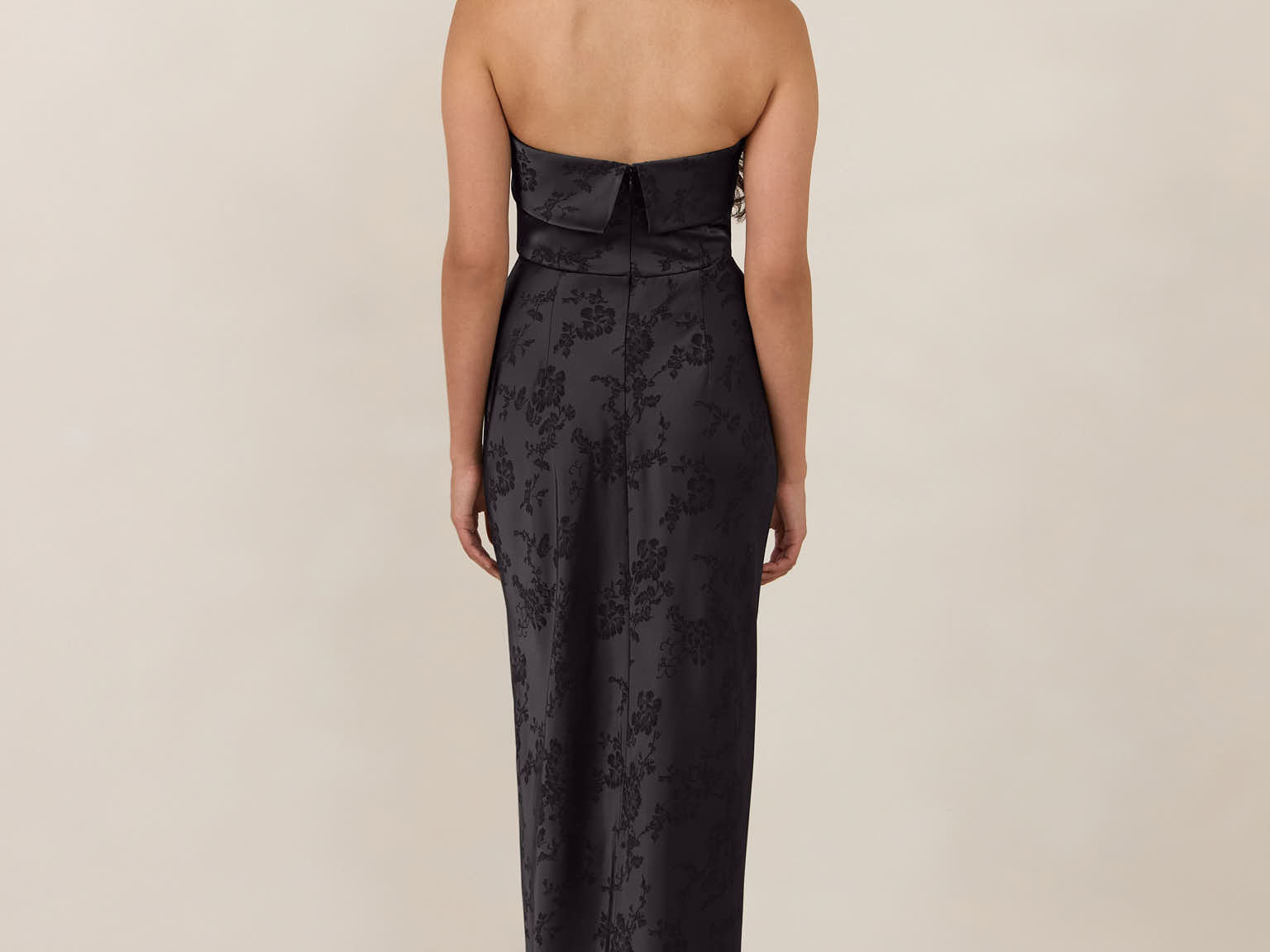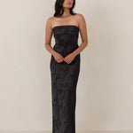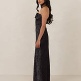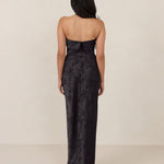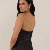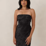 A timeless piece designed to captivate. Designed from luxe jacquard fabric with a subtle sheen and intricate texture, this dress exudes understated glamour. The structured, folded strapless neckline adds a modern sculptural element, gracefully framing the shoulders.