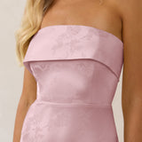 A timeless piece designed to captivate. Designed from luxe jacquard fabric with a subtle sheen and intricate texture, this dress exudes understated glamour. The structured, folded strapless neckline adds a modern sculptural element, gracefully framing the shoulders.