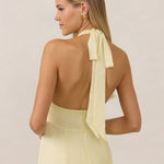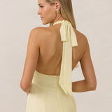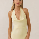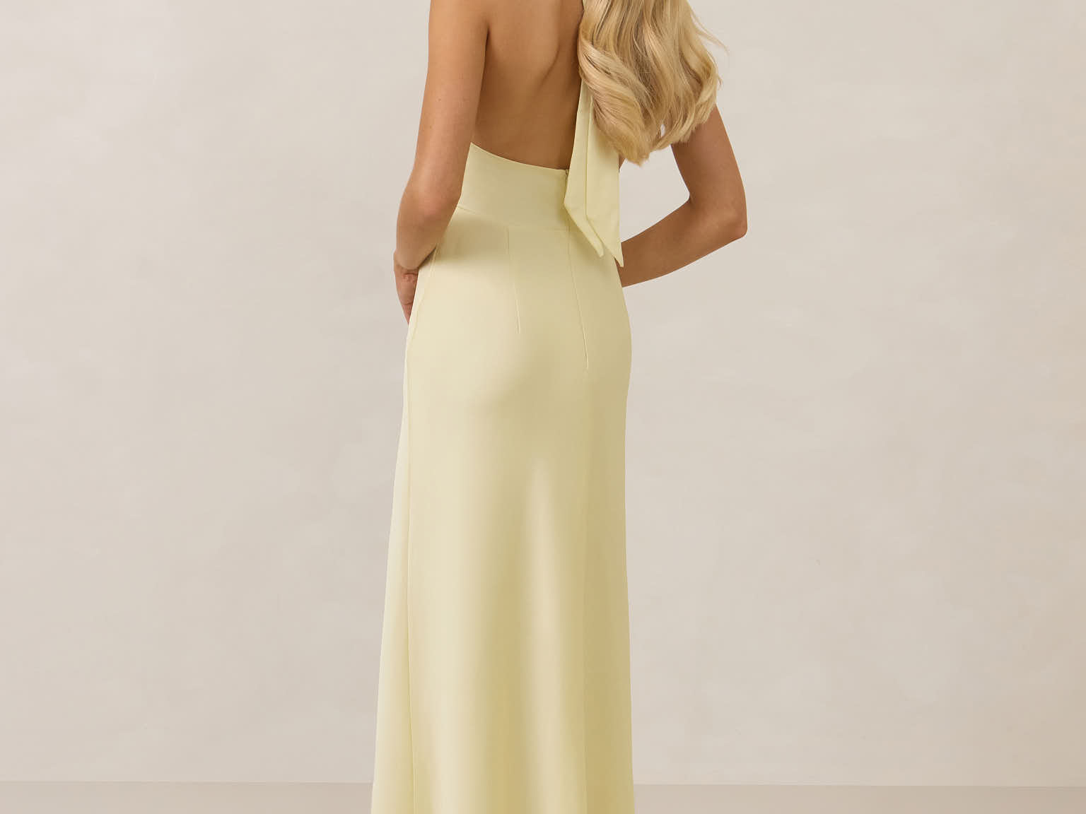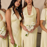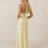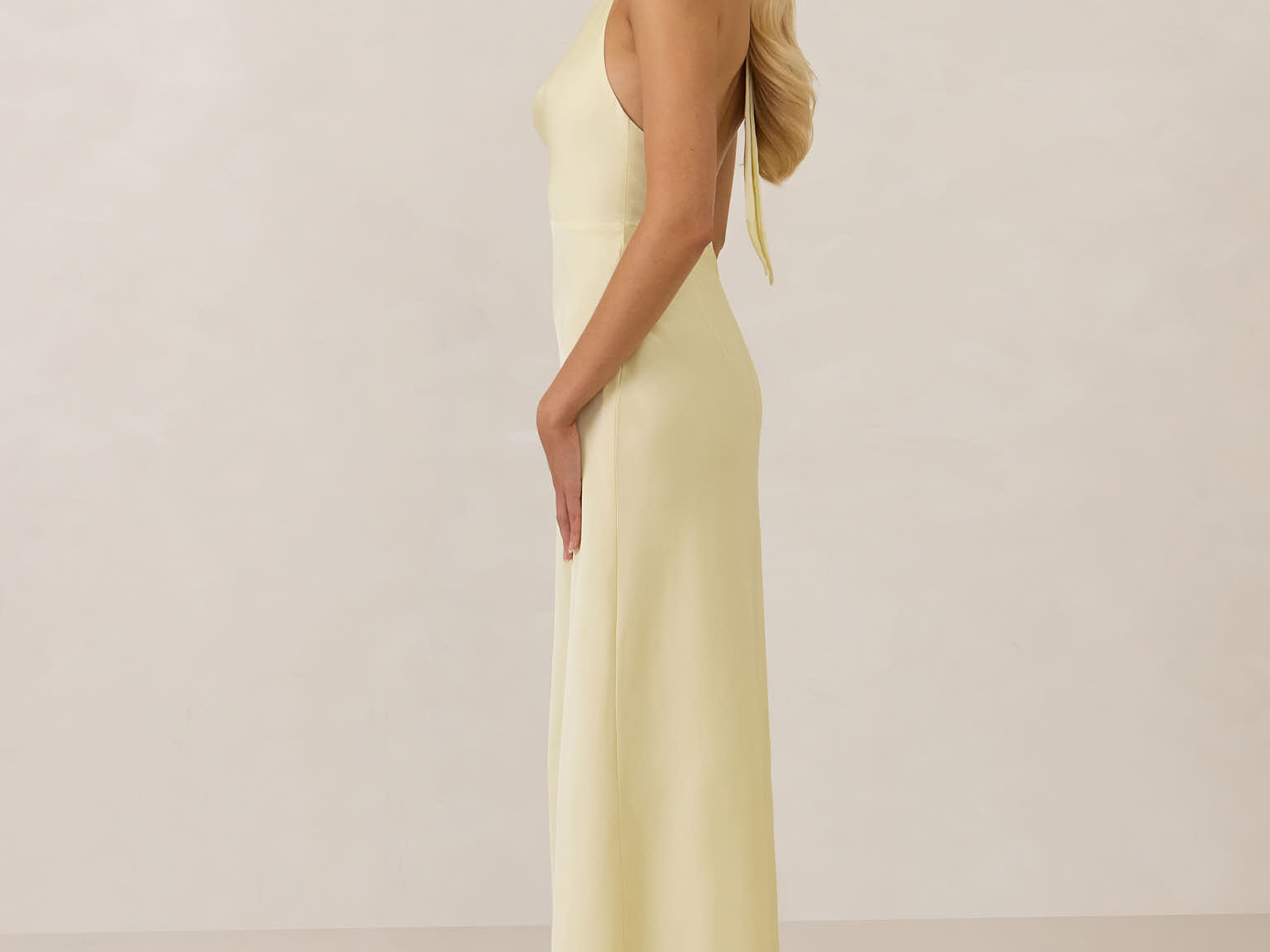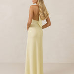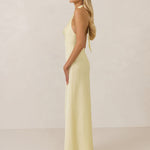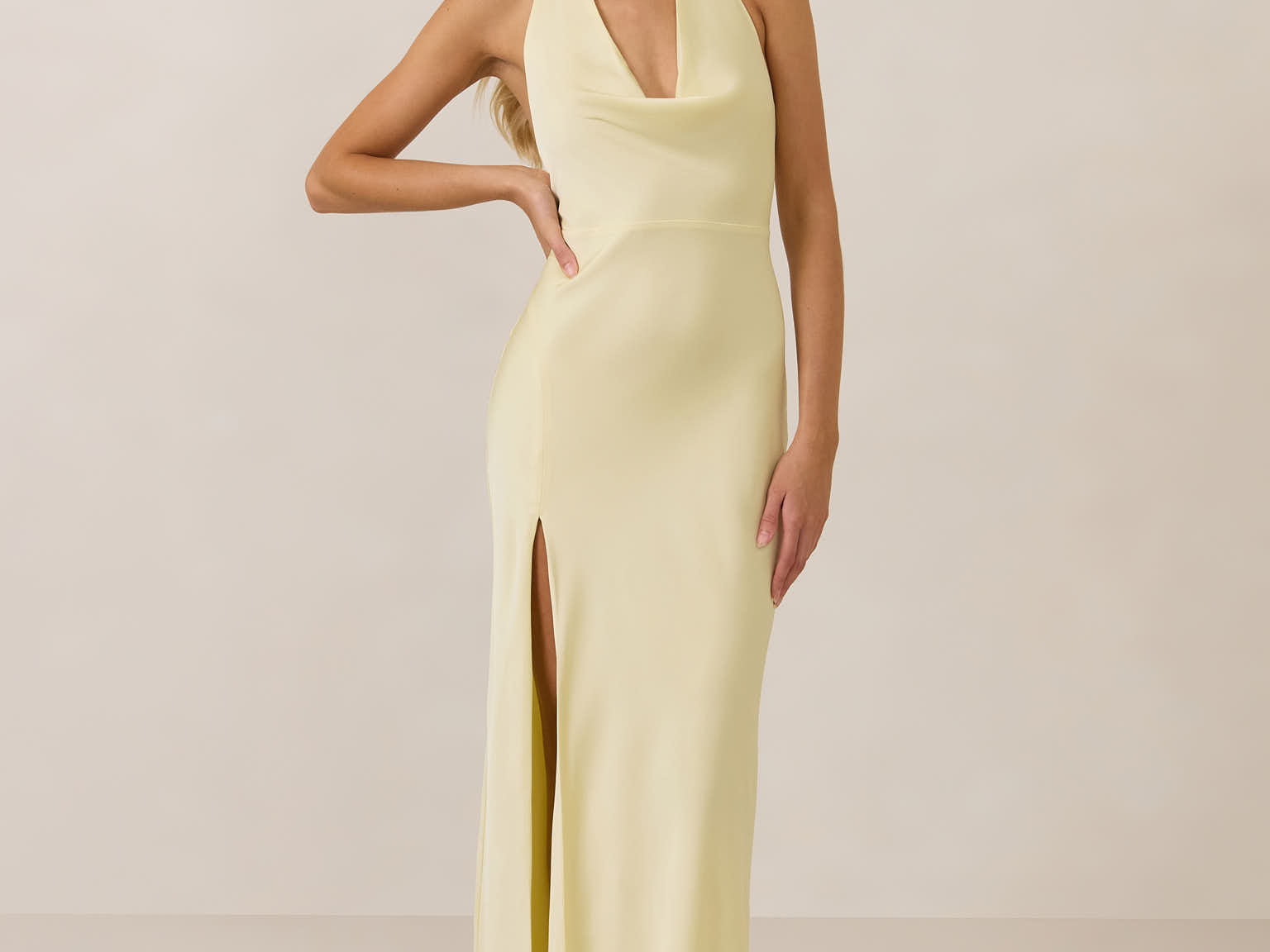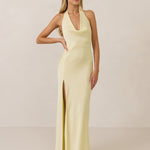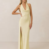 Effortlessly elegant, this bias-cut satin maxi dress features a fluid skirt with a curved thigh-high slit and a draped cowl neckline. Delicate, adjustable cross-back straps complete the look. Perfect for any occasion, it's glossy and flattering.