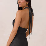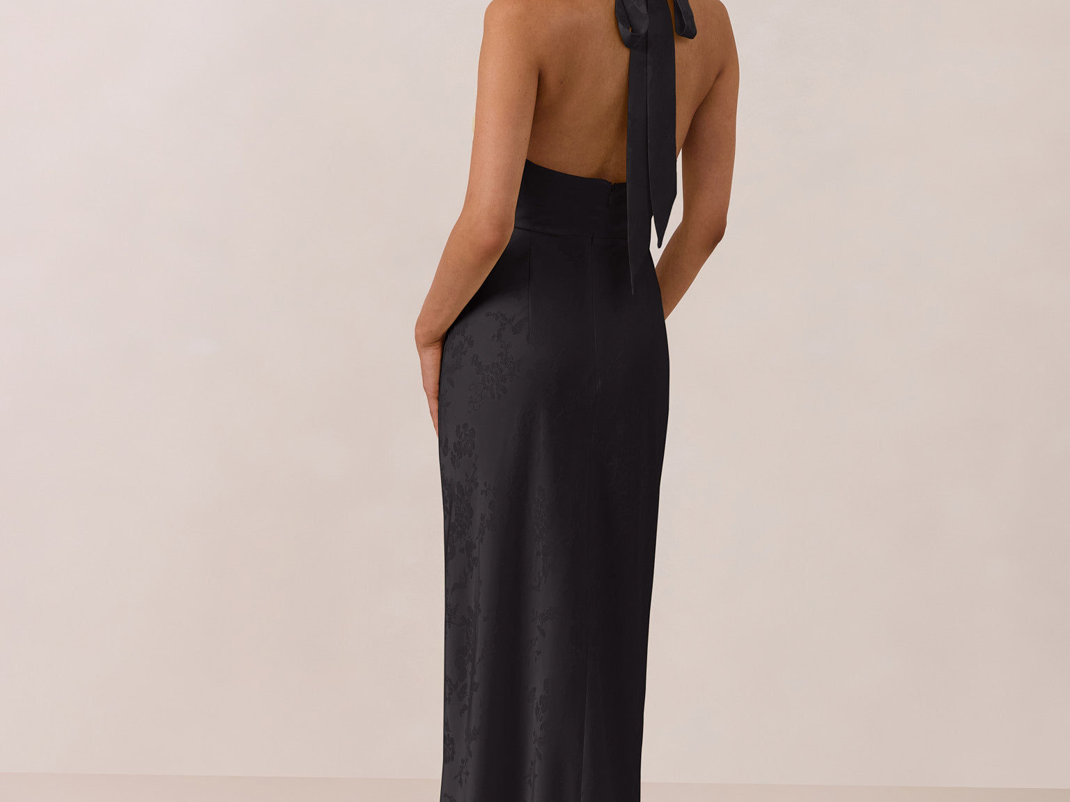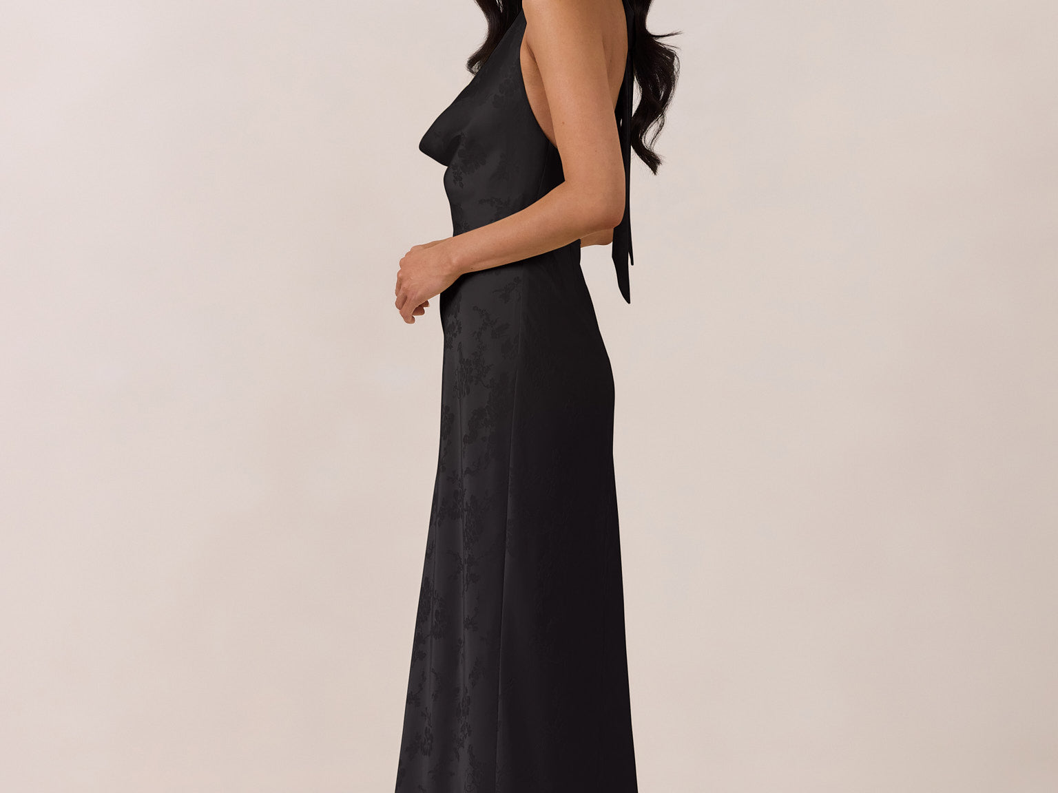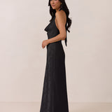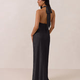 Effortlessly elegant, this bias-cut satin maxi dress features a fluid skirt with a curved thigh-high slit and a draped cowl neckline. A delicate halter back completes the look. Perfect for any occasion, it's glossy and flattering.