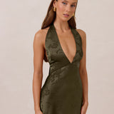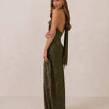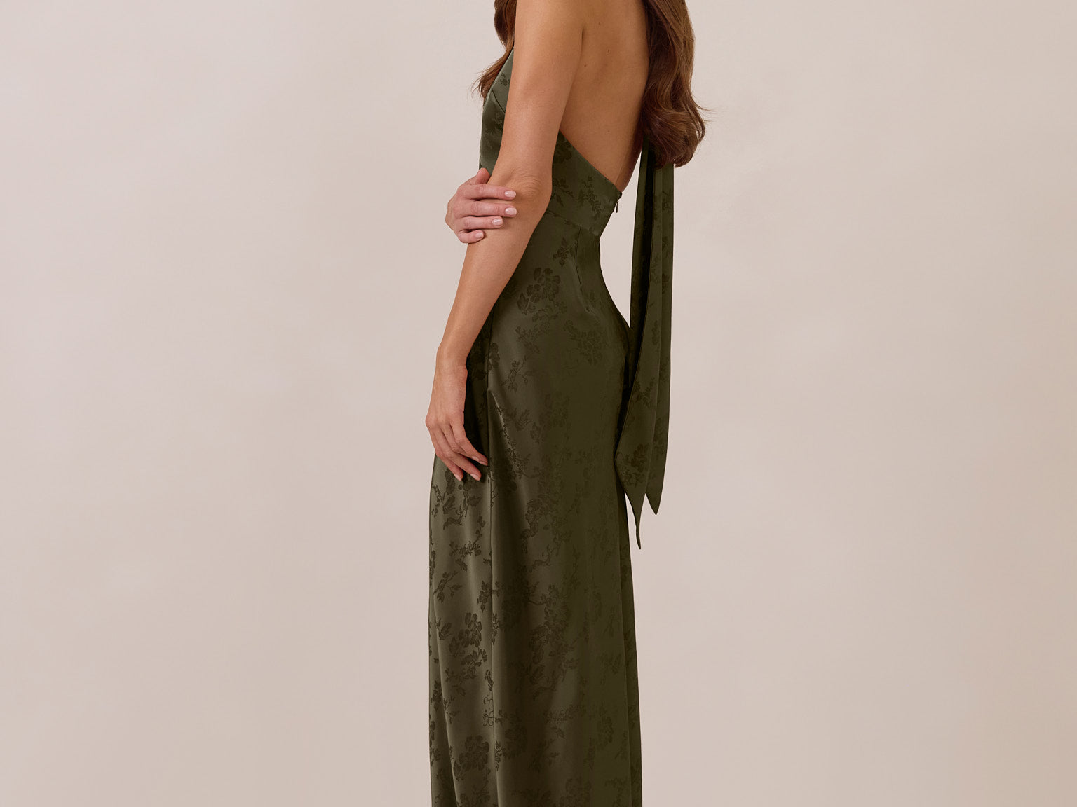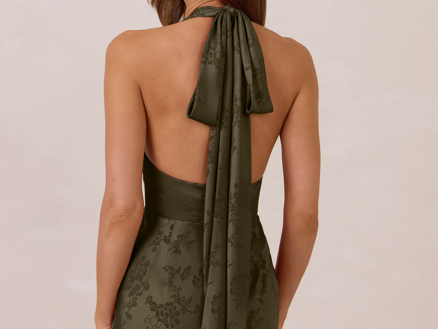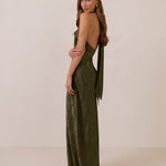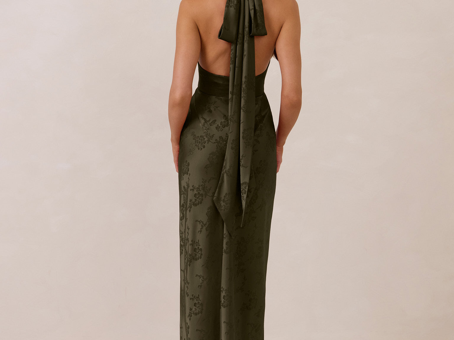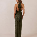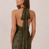 A sleek and versatile silhouette crafted in luxurious Jacquard for a touch of texture and sophistication. Designed for effortless elegance, it features a halter neckline with a dramatic open back and long ties that can be styled as a scarf or knotted for a custom halter look. The bias-cut skirt flows beautifully into a flattering maxi length, creating graceful movement with every step.