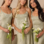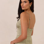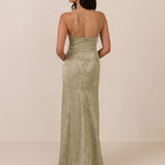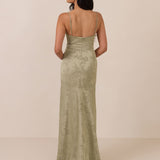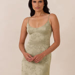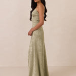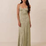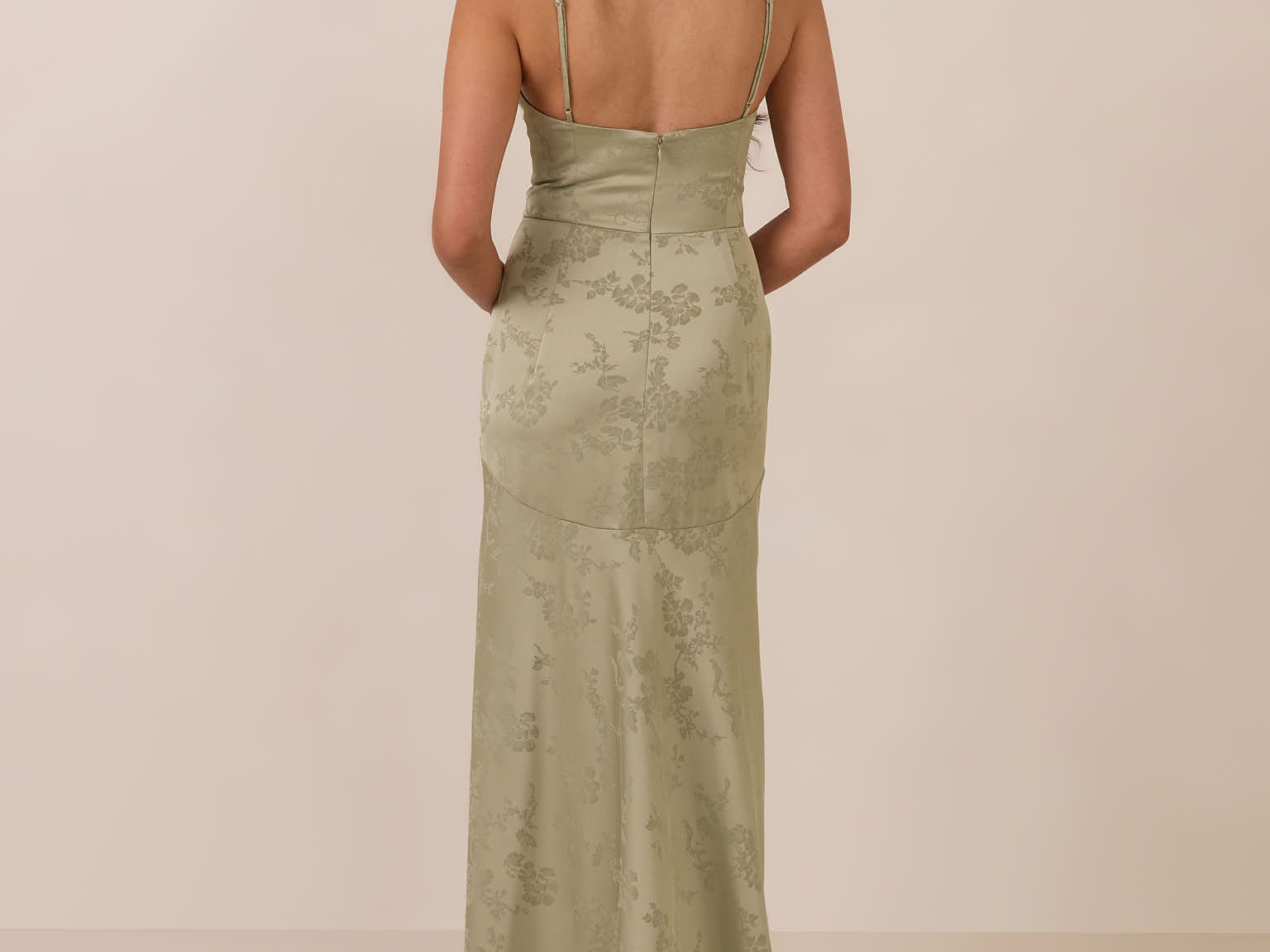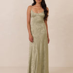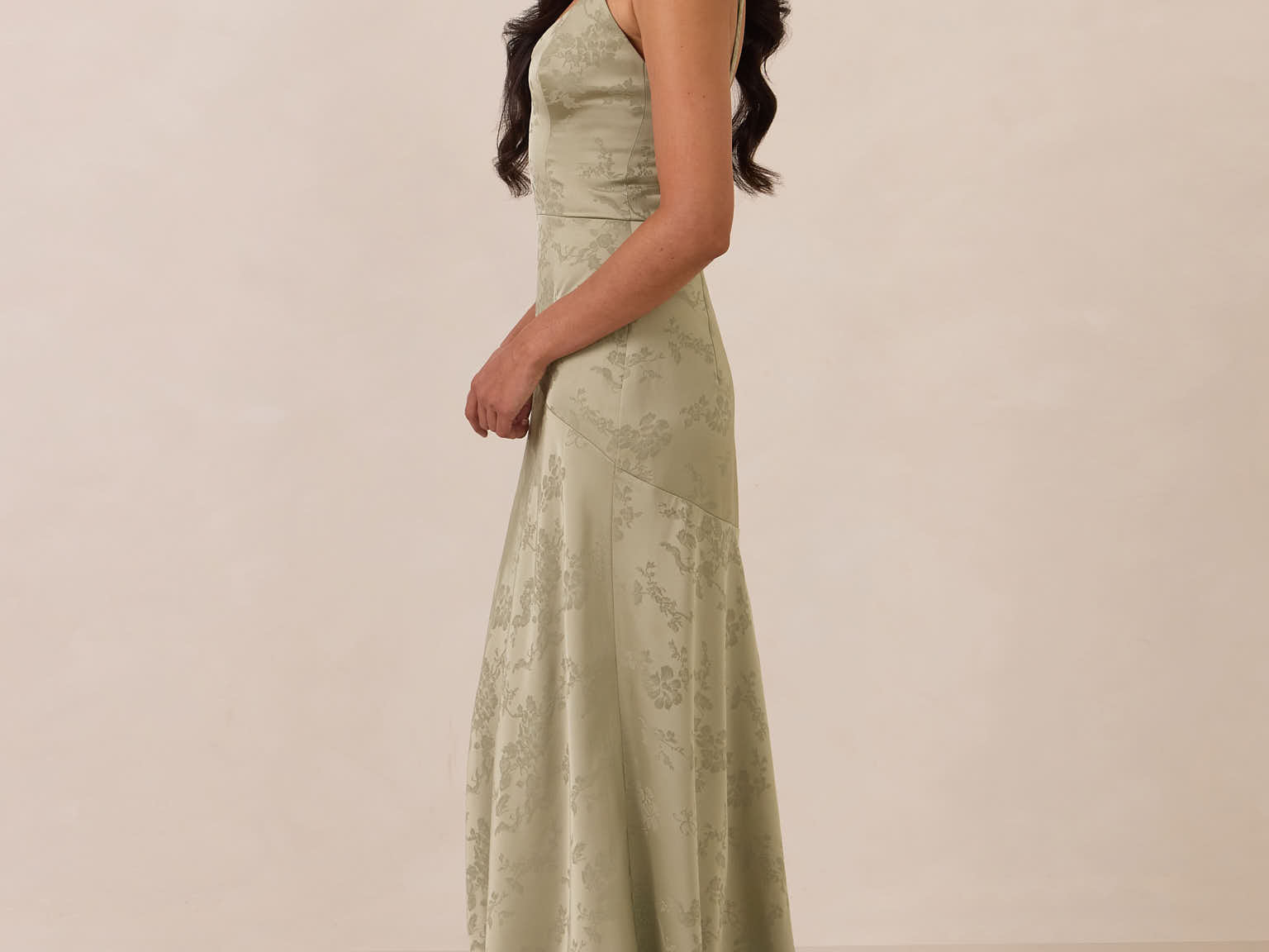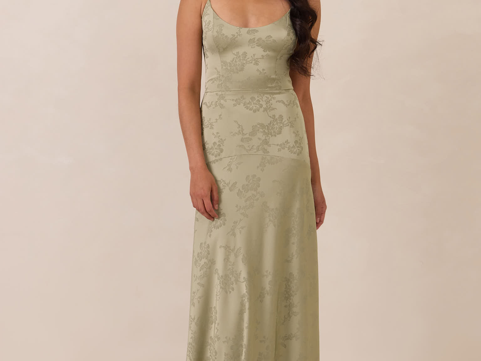 Crafted from luxurious Jacquard satin, this full-length dress features adjustable straps and a flattering drop waist, creating an elegant silhouette with timeless appeal. The scoop neckline and back add a delicate, feminine touch, while the bias-cut skirt flows gracefully to the floor, combining sophistication and comfort for a truly captivating look.