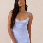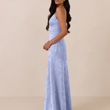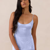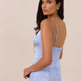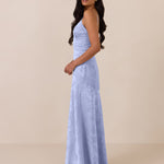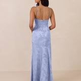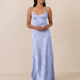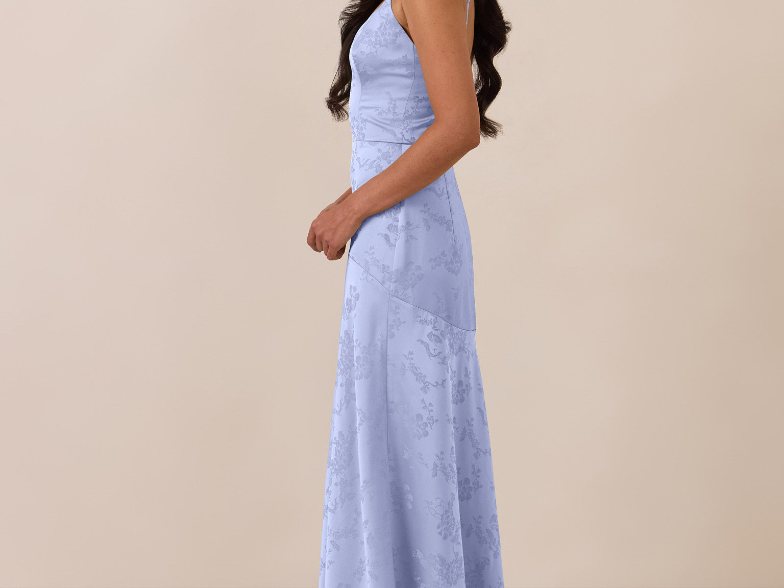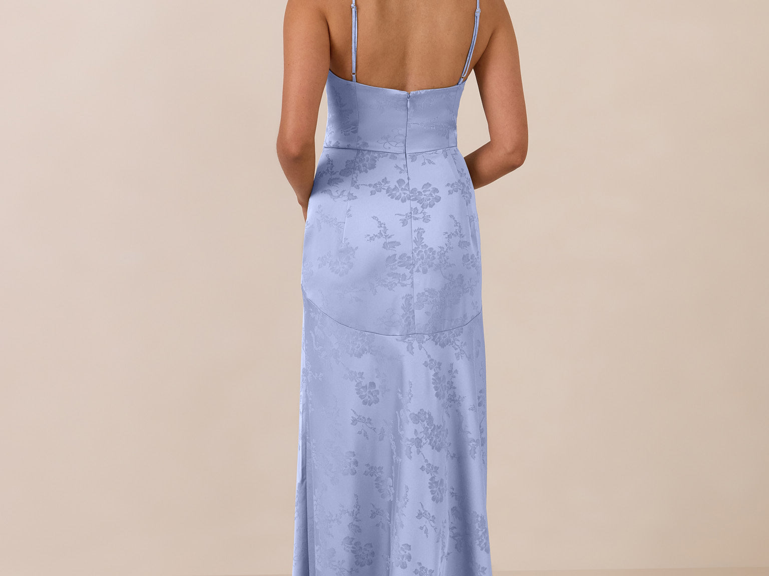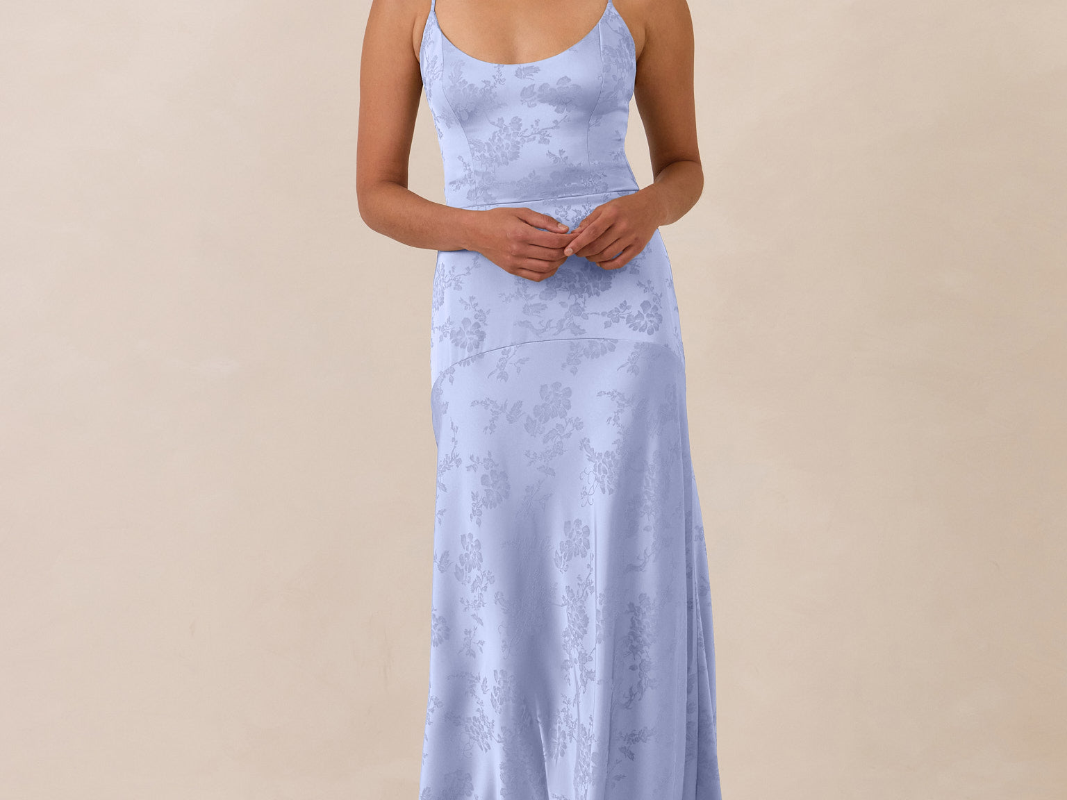 Crafted from luxurious Jacquard satin, this full-length dress features adjustable straps and a flattering drop waist, creating an elegant silhouette with timeless appeal. The scoop neckline and back add a delicate, feminine touch, while the bias-cut skirt flows gracefully to the floor, combining sophistication and comfort for a truly captivating look.
