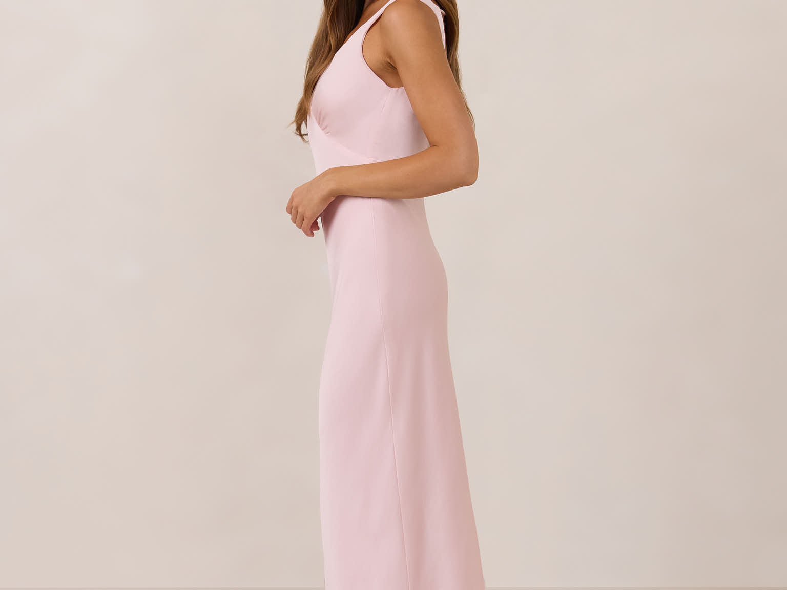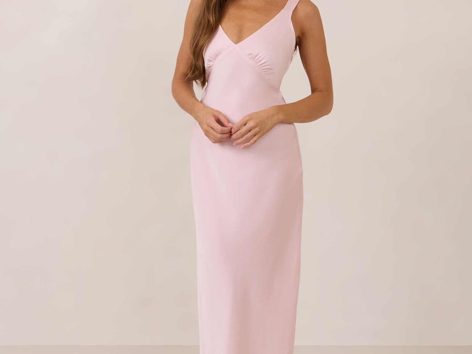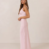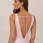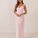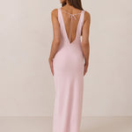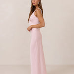 Featuring a flattering V-neckline, gathering at the bust, and an open back, this bias-cut dress offers a sleek, elongating silhouette. The clean lines and minimalist design make it the perfect choice for any special occasion.