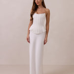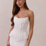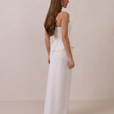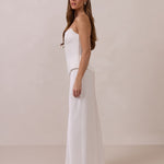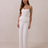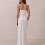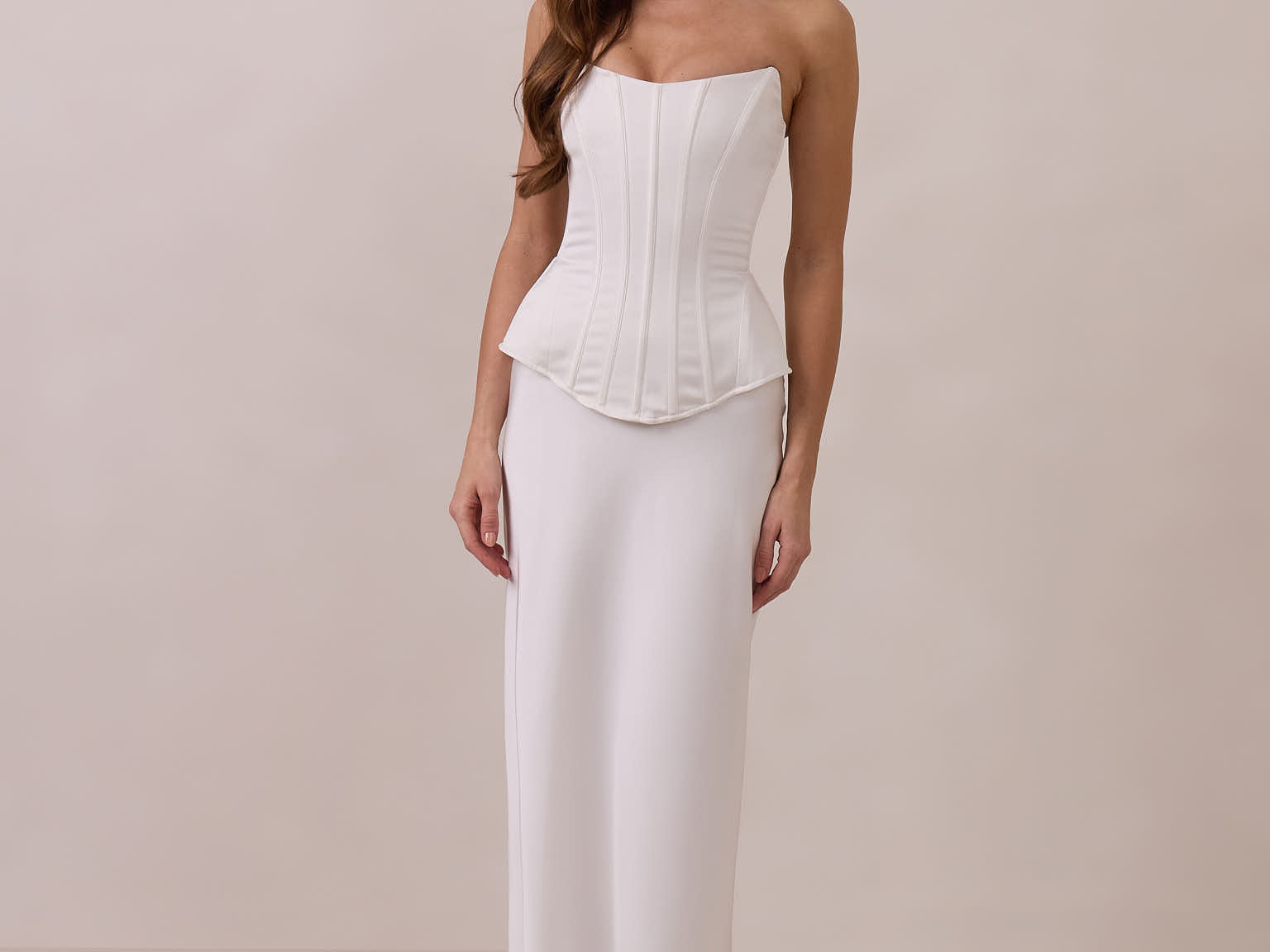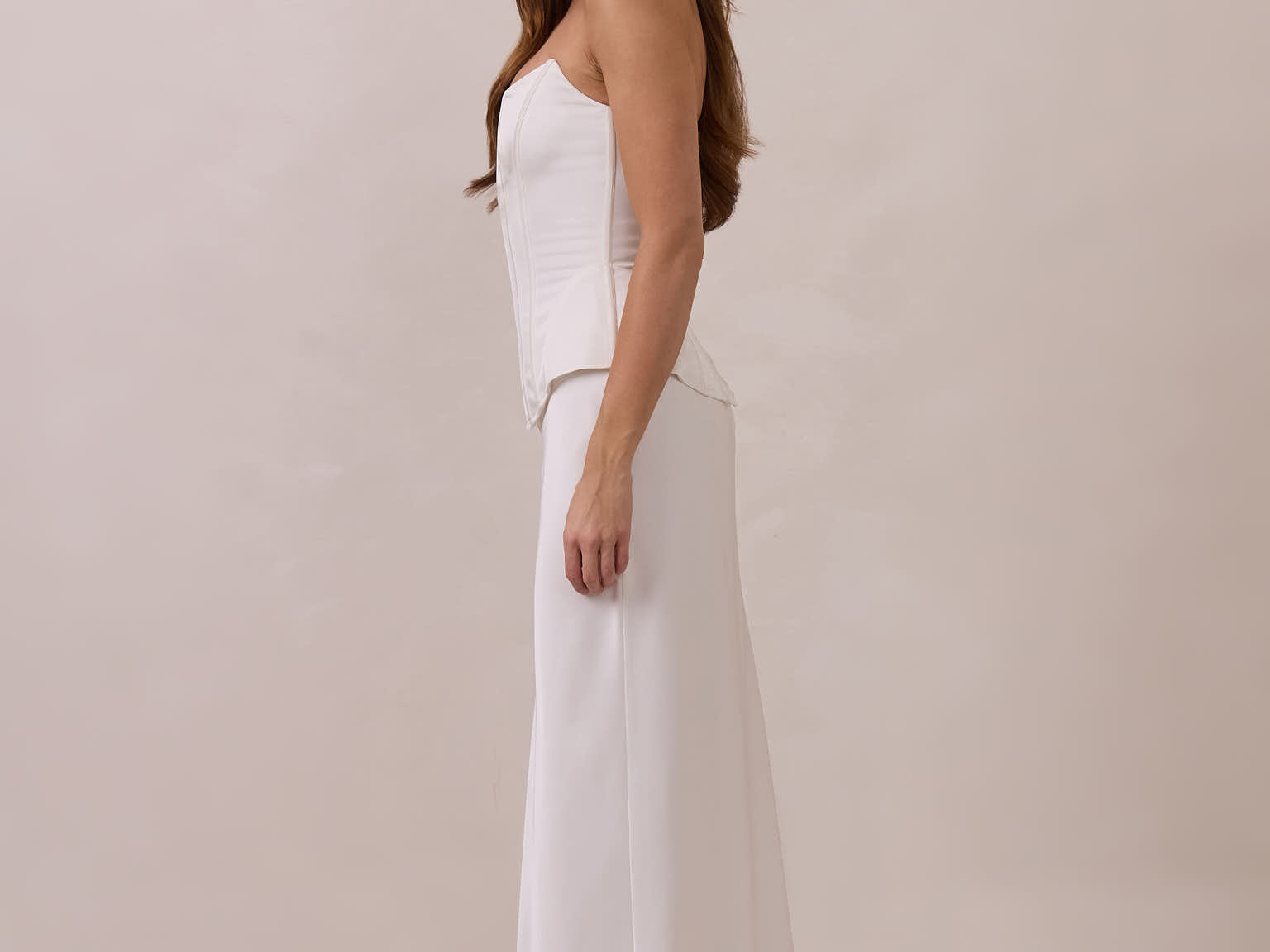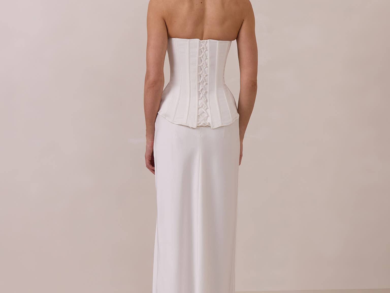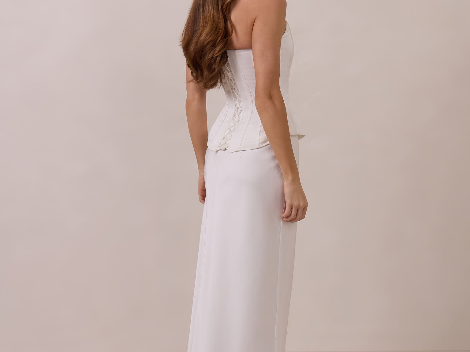A contemporary bridal set with clean lines and dramatic structure. The strapless satin corset top features sculpting boning for a contoured, supportive fit, finished with a timeless scoop neckline. A fluid, floor-length satin skirt completes the look, creating an elegant, elongated silhouette.