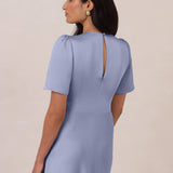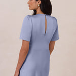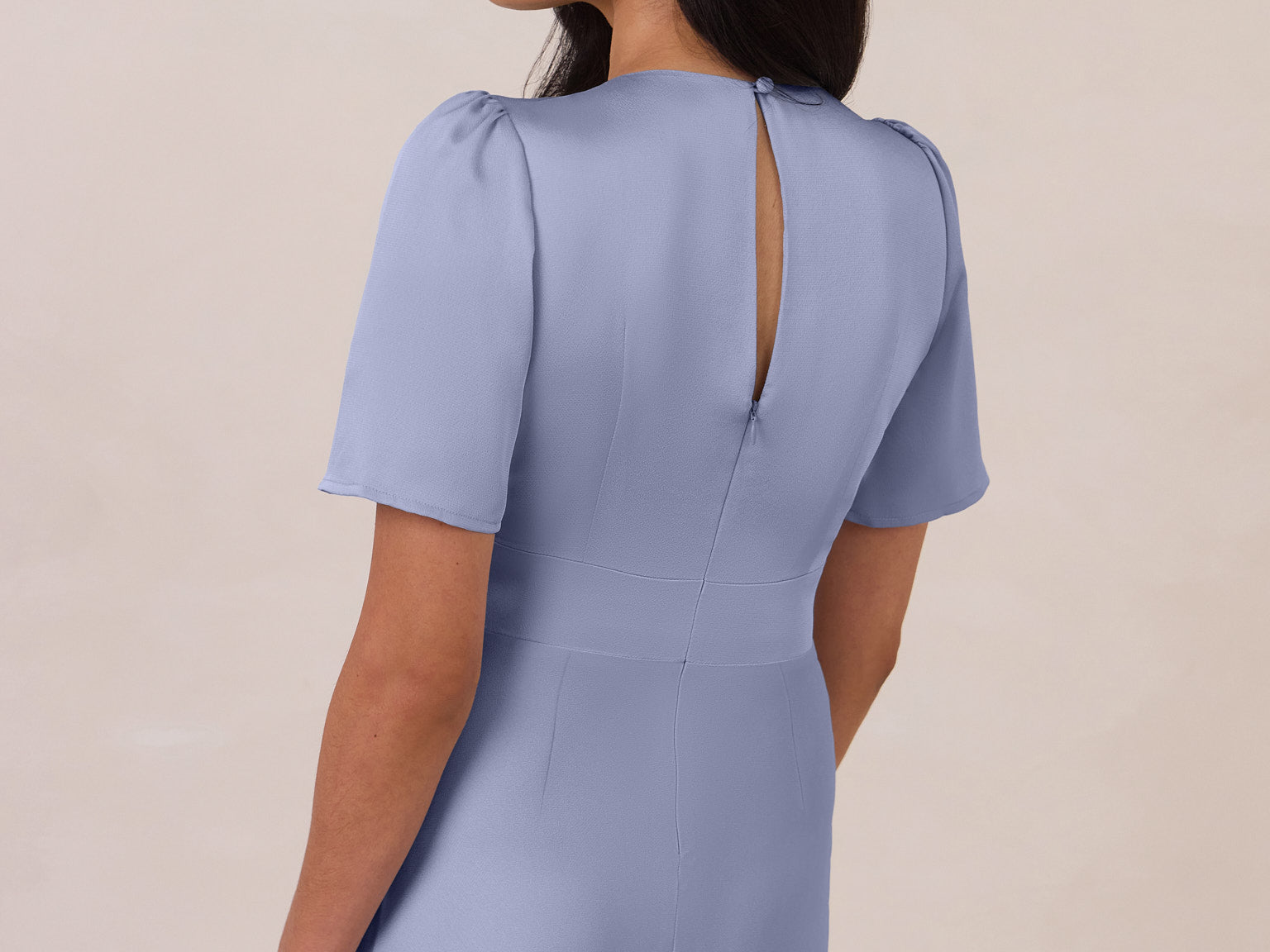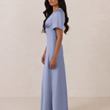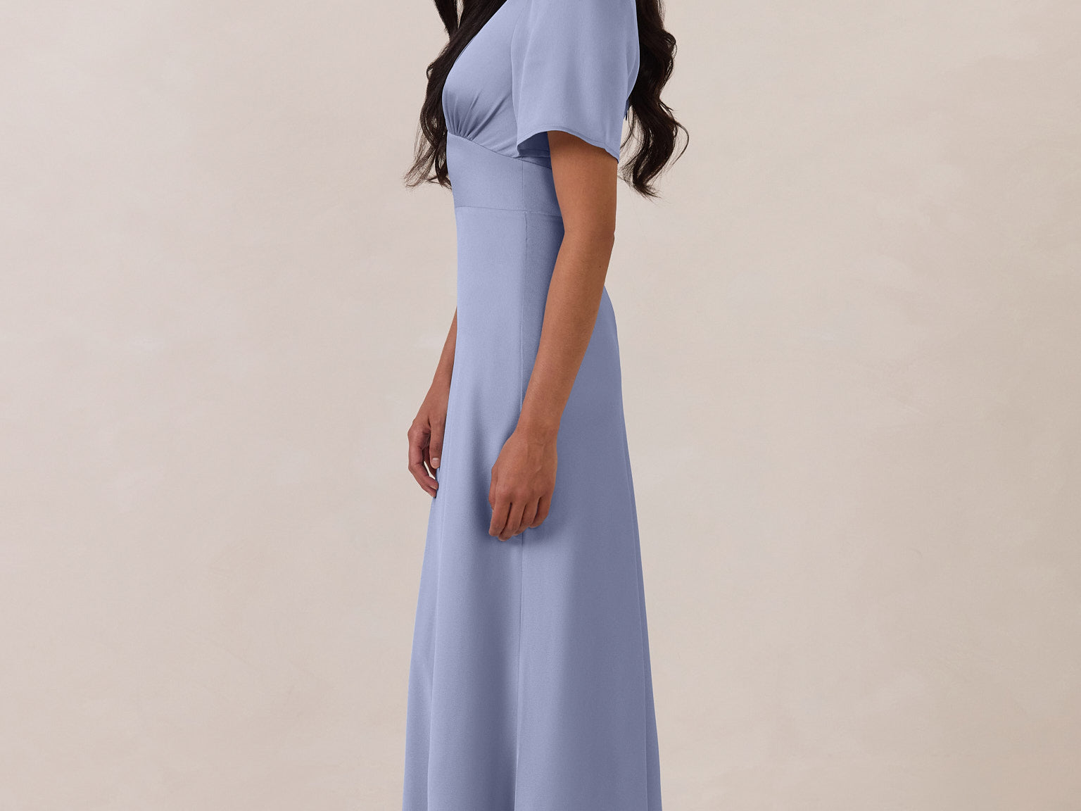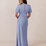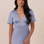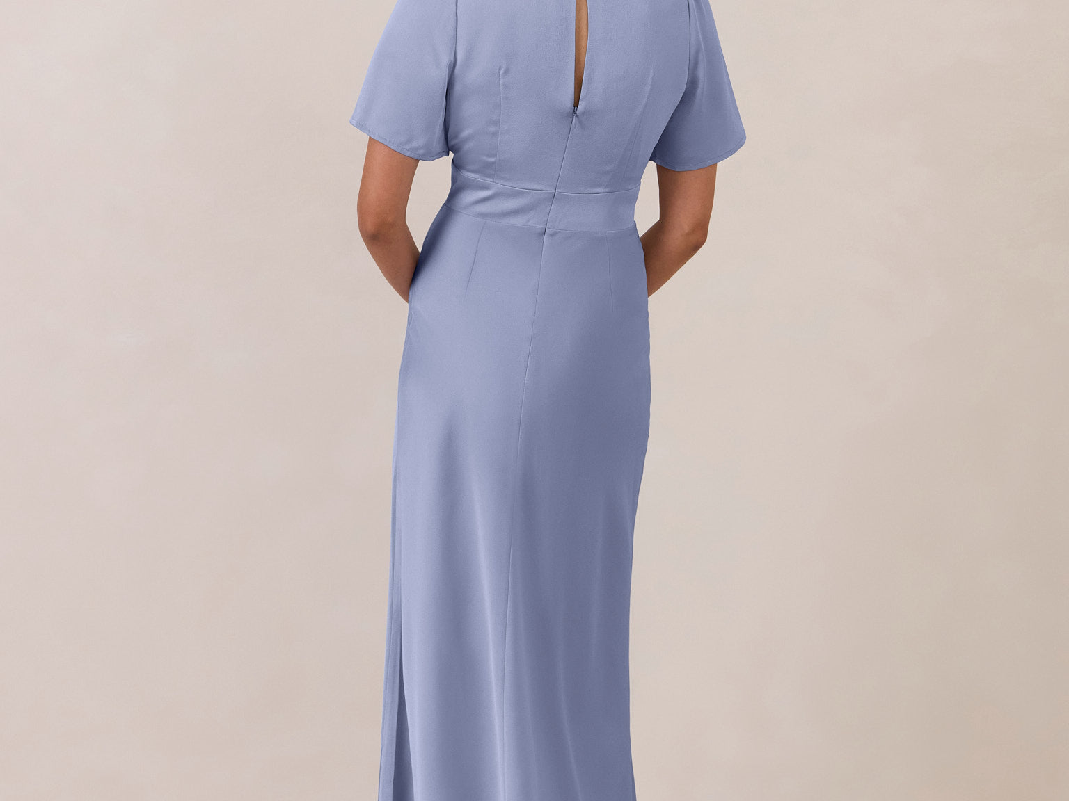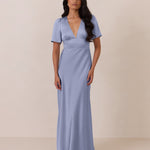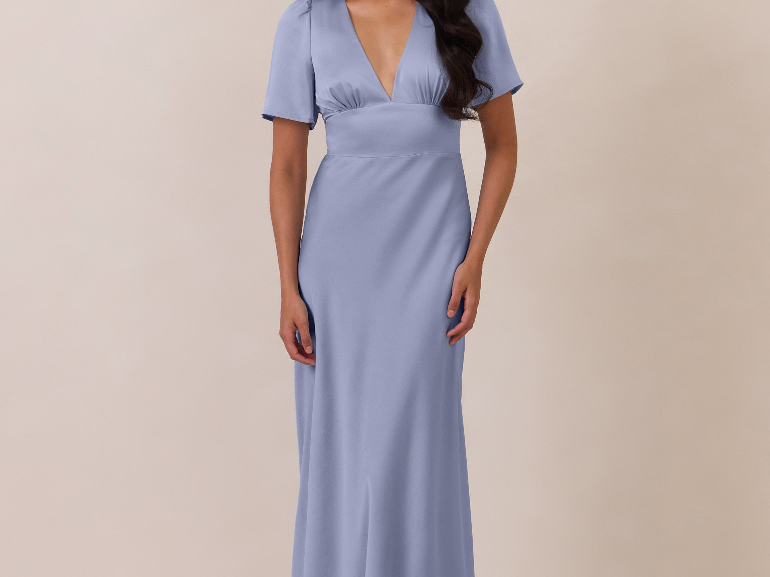This full-length satin dress features a romantic V neckline, short sleeves, and a bias-cut skirt for an effortlessly feminine silhouette. A subtle keyhole back and delicate button closure add unexpected detail. Finished in silky satin with a soft, light-catching sheen.