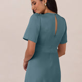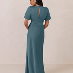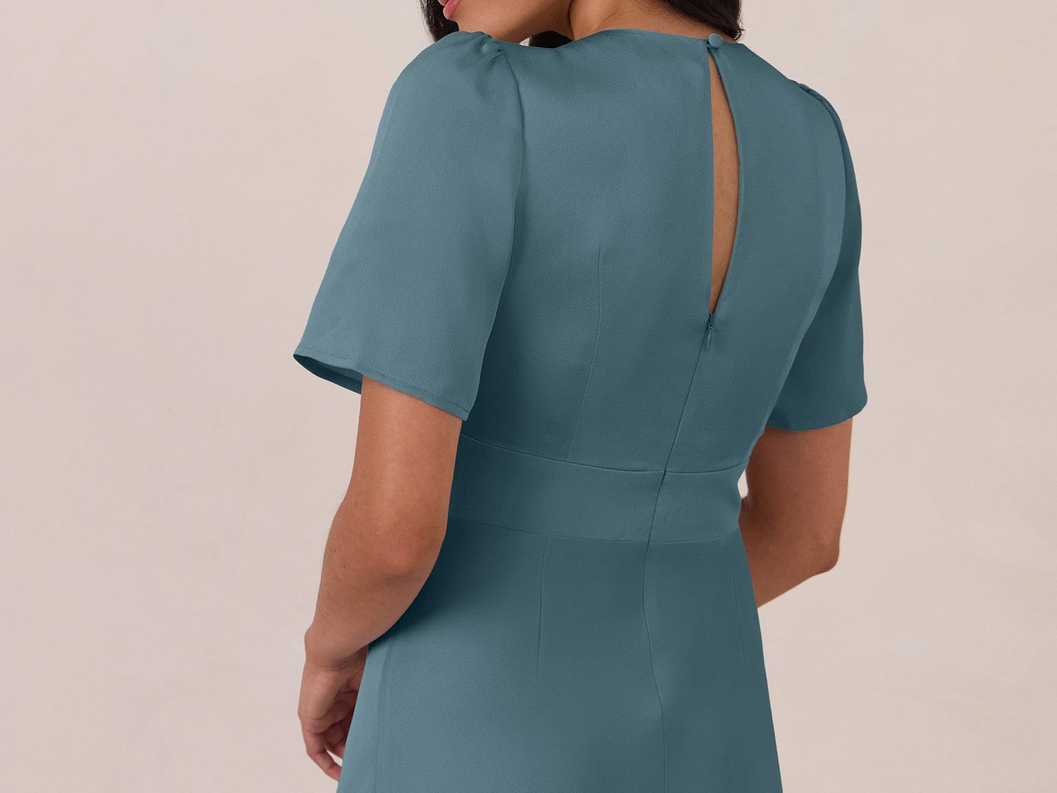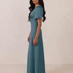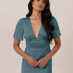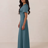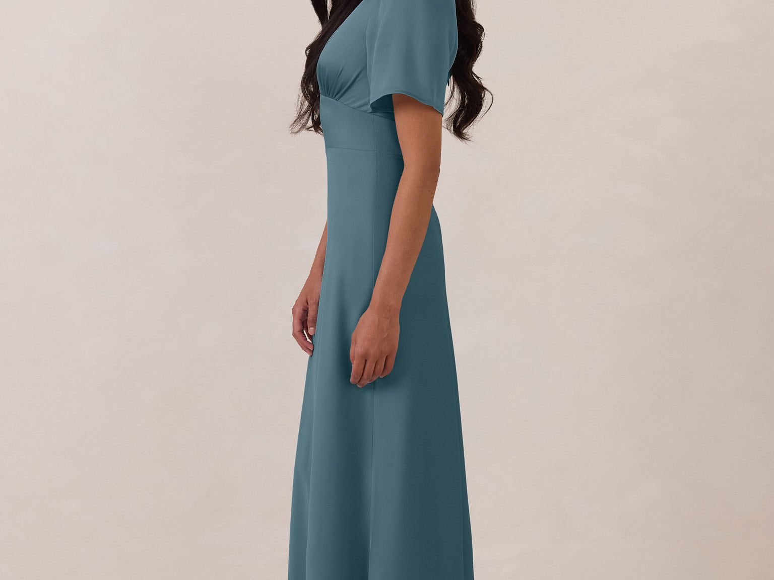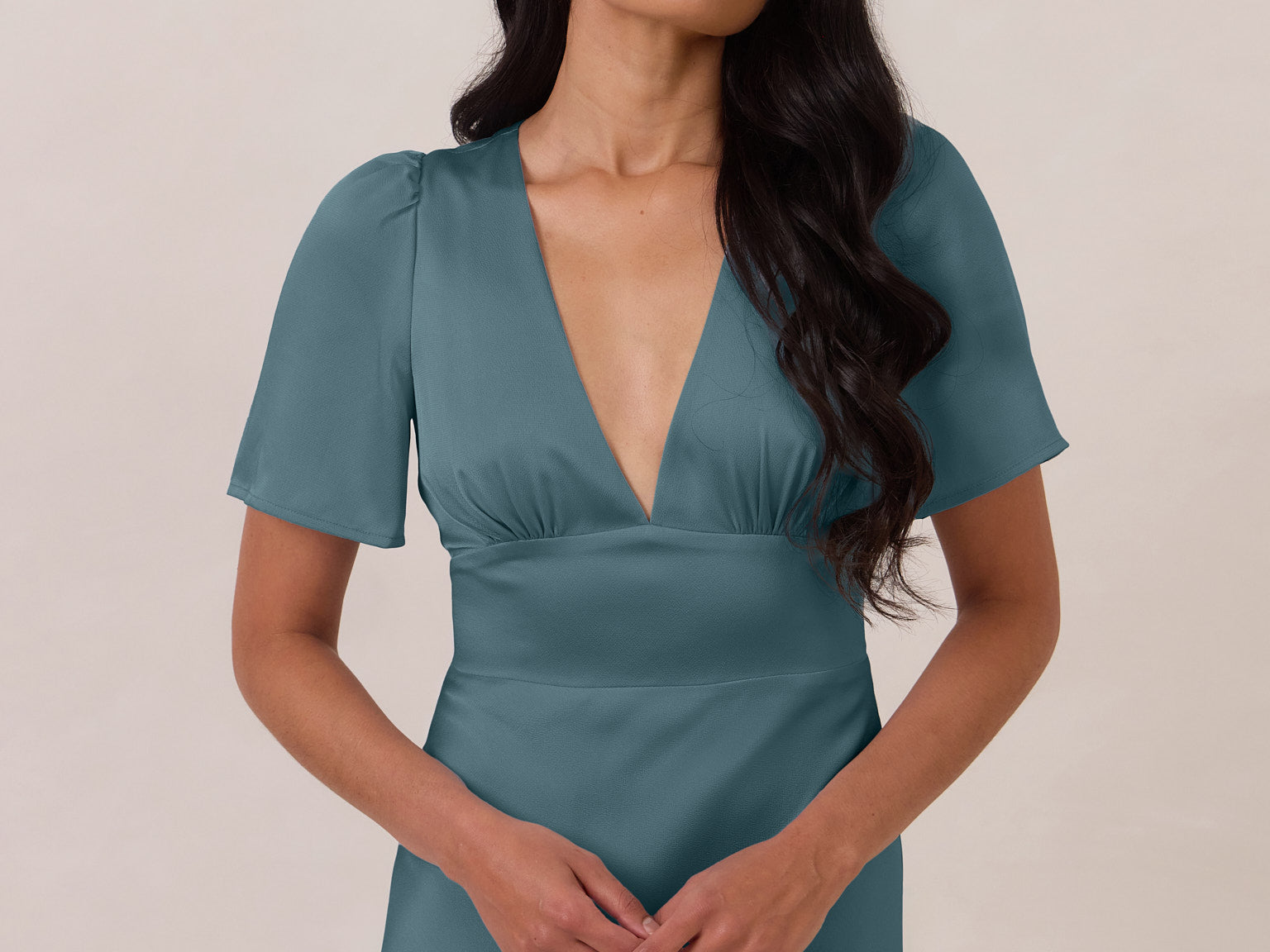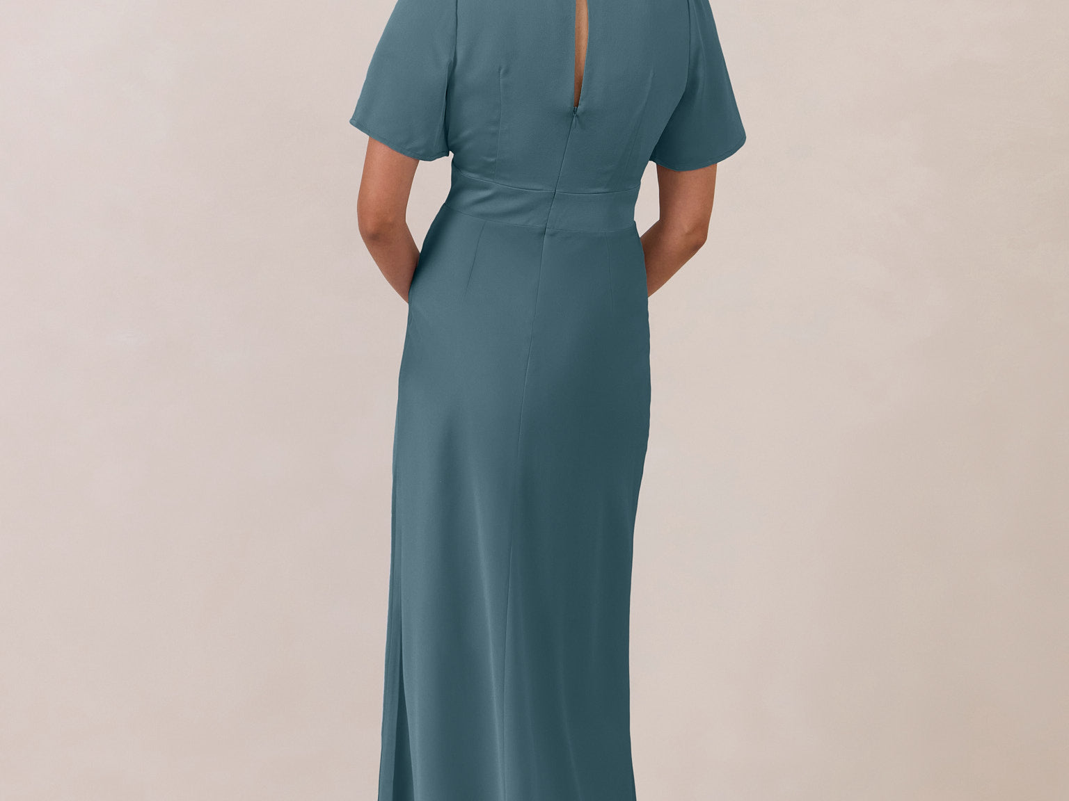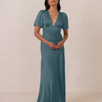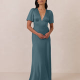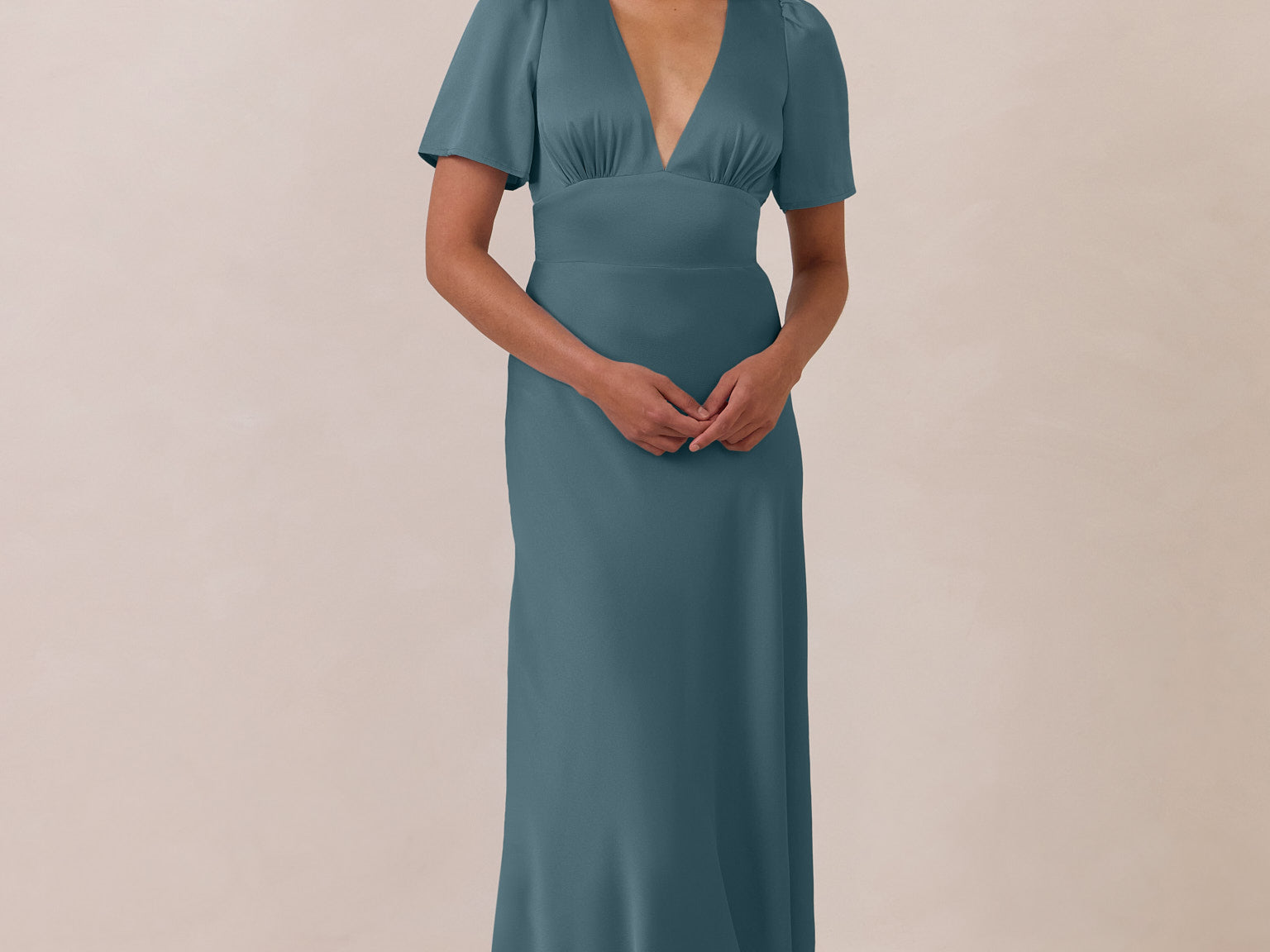 This full-length satin dress features a romantic V neckline, short sleeves, and a bias-cut skirt for an effortlessly feminine silhouette. A subtle keyhole back and delicate button closure add unexpected detail. Finished in silky satin with a soft, light-catching sheen.
