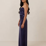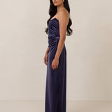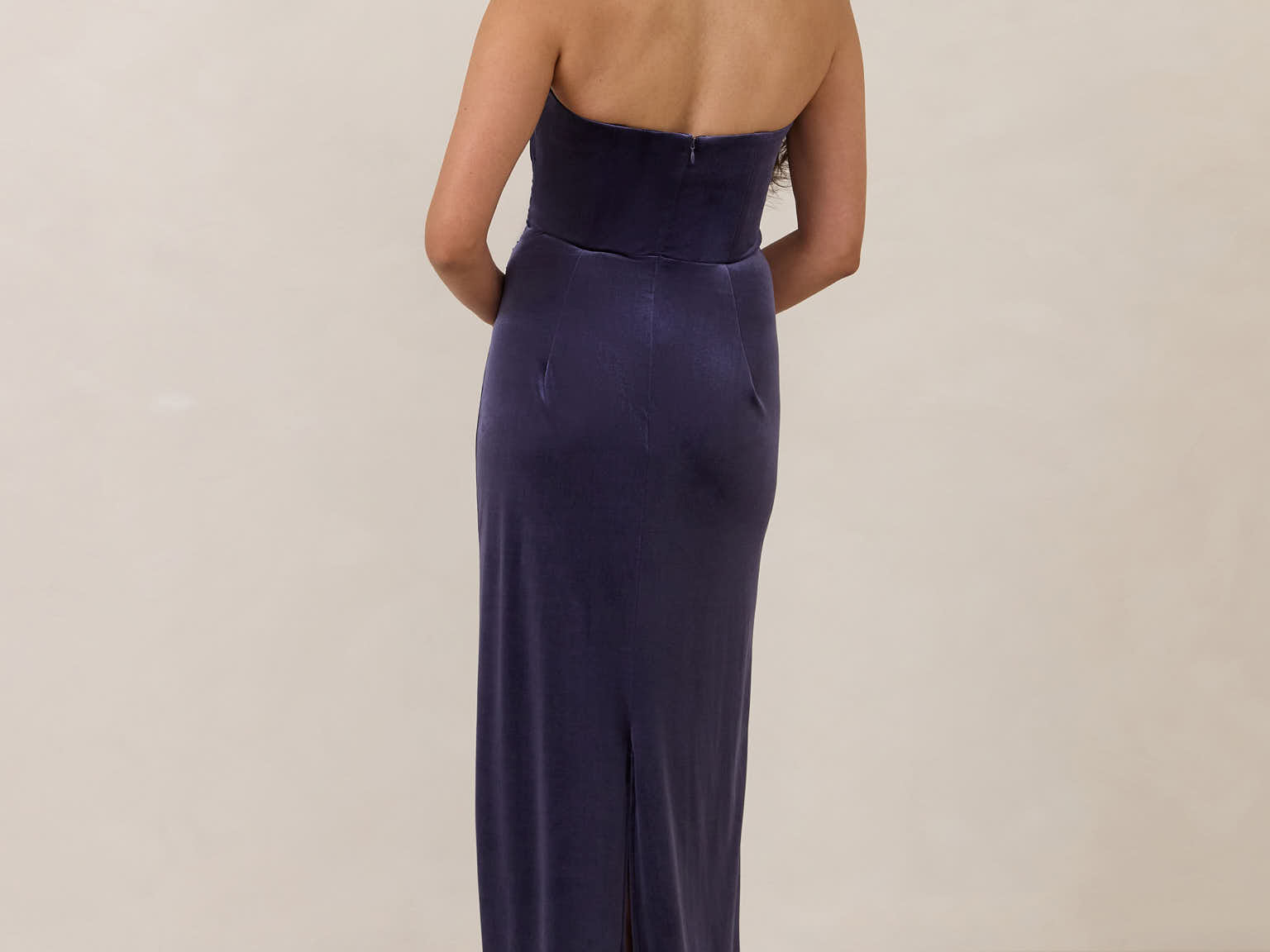 Designed from plush velvet for a touch of opulence, this strapless dress features a soft scoop neckline and a boned bodice for a structured, flattering fit. The bias-cut skirt skims the body, creating a smooth, elongating silhouette, while a subtle back slit adds ease of movement and a hint of allure.