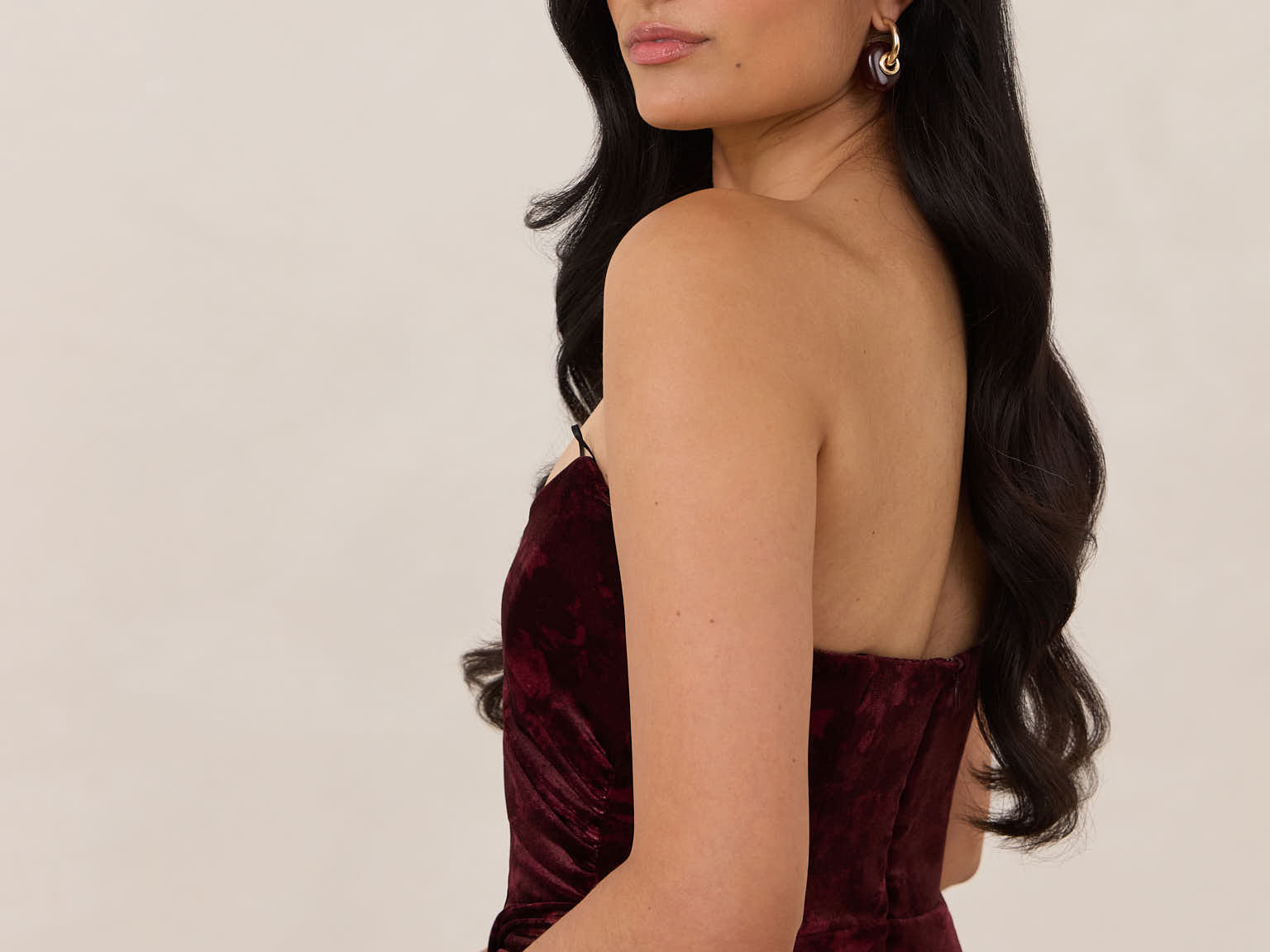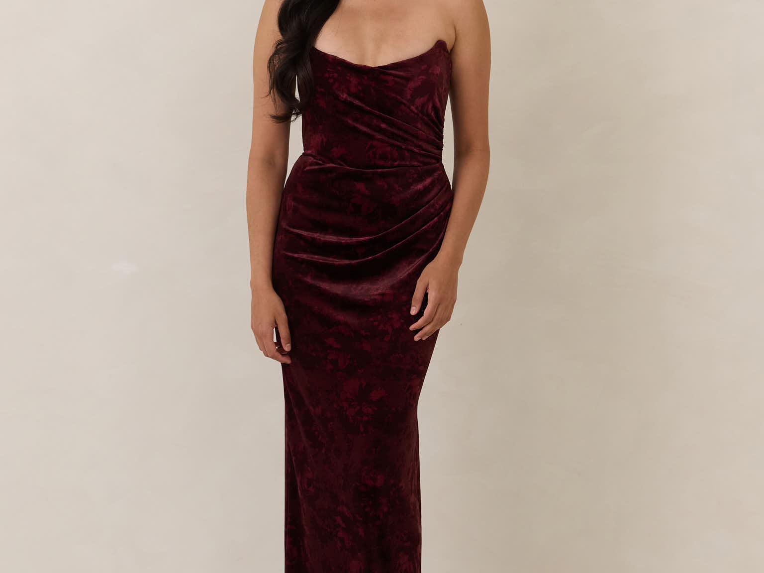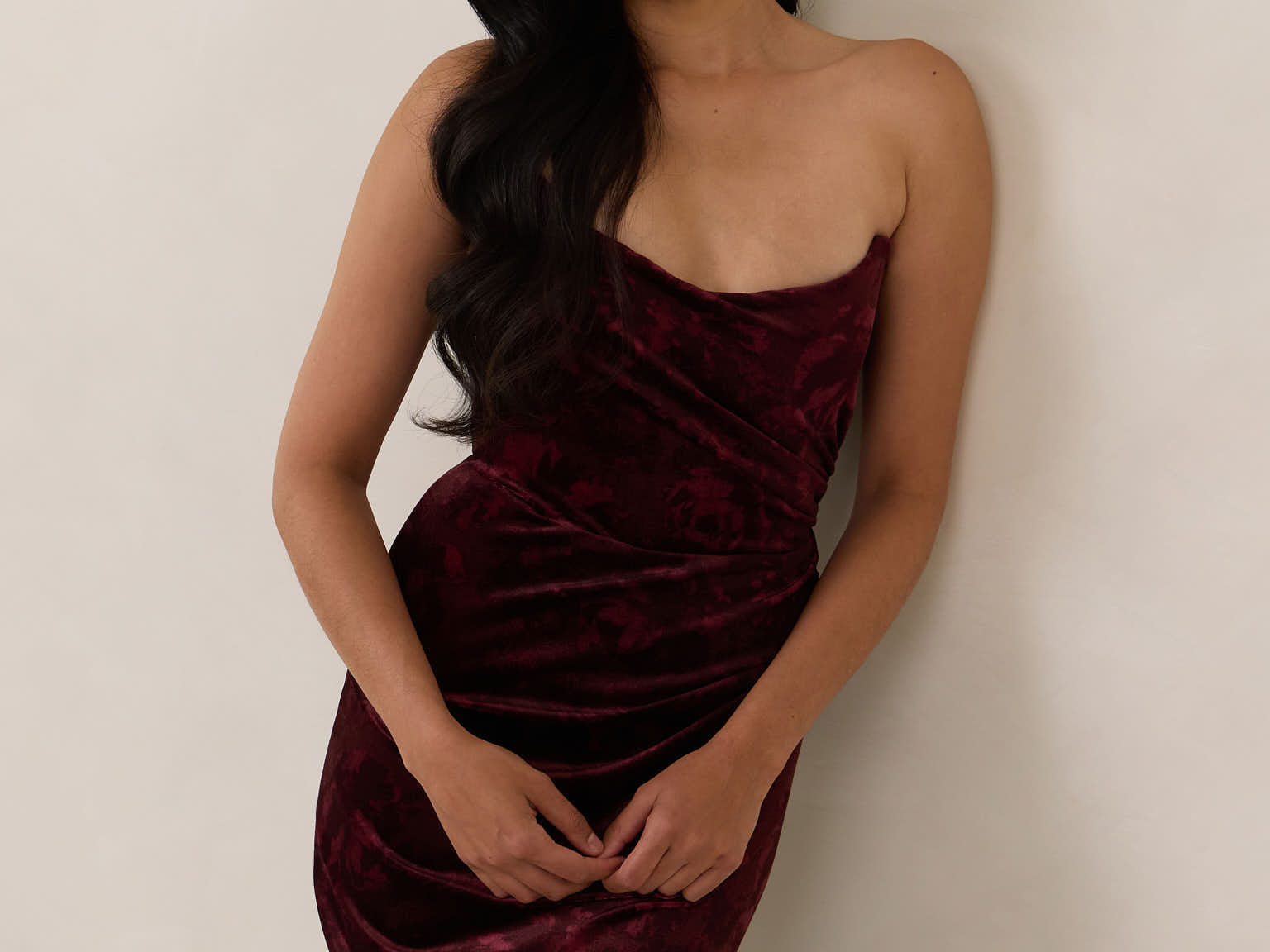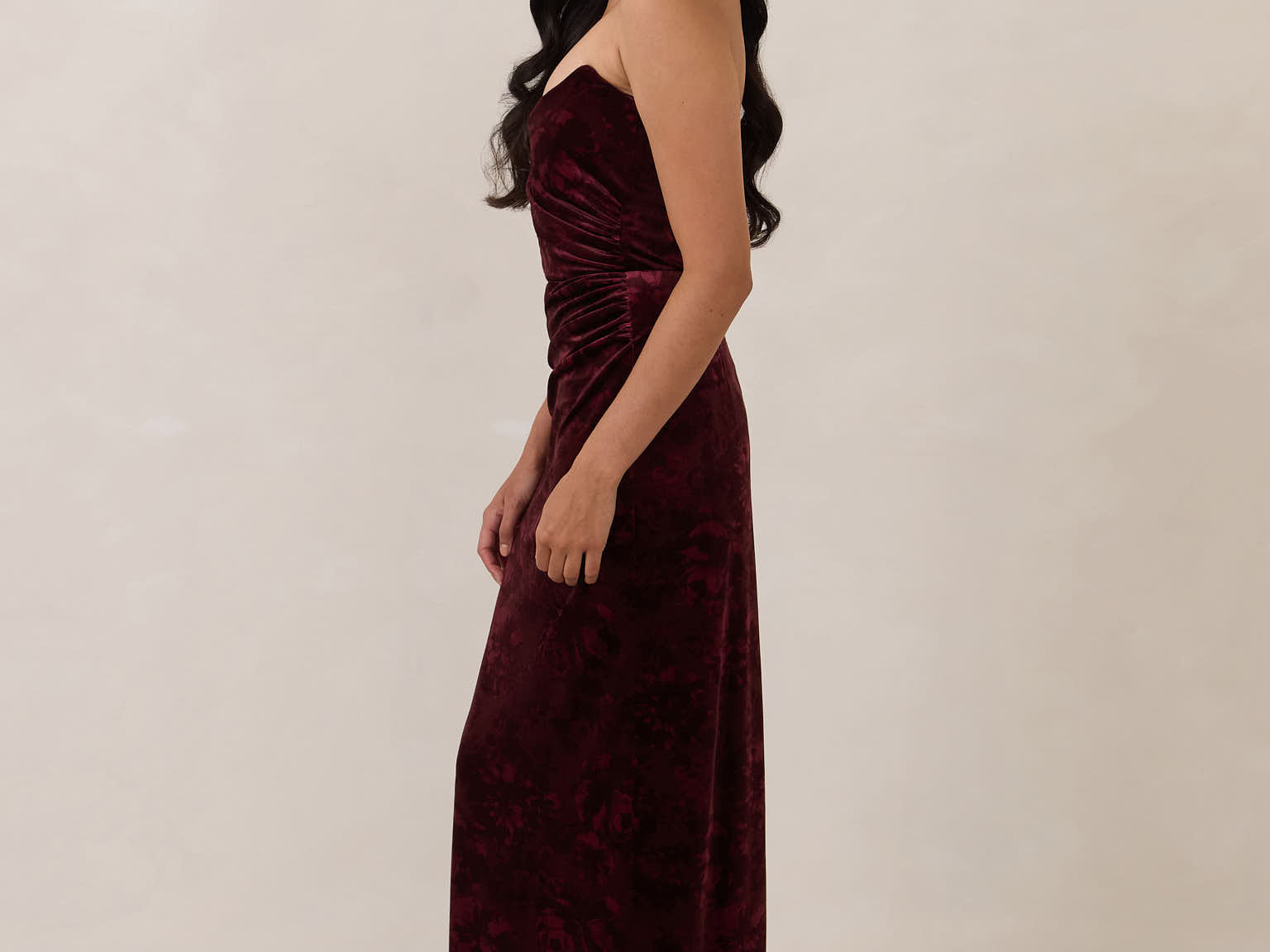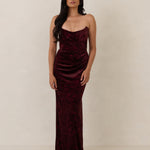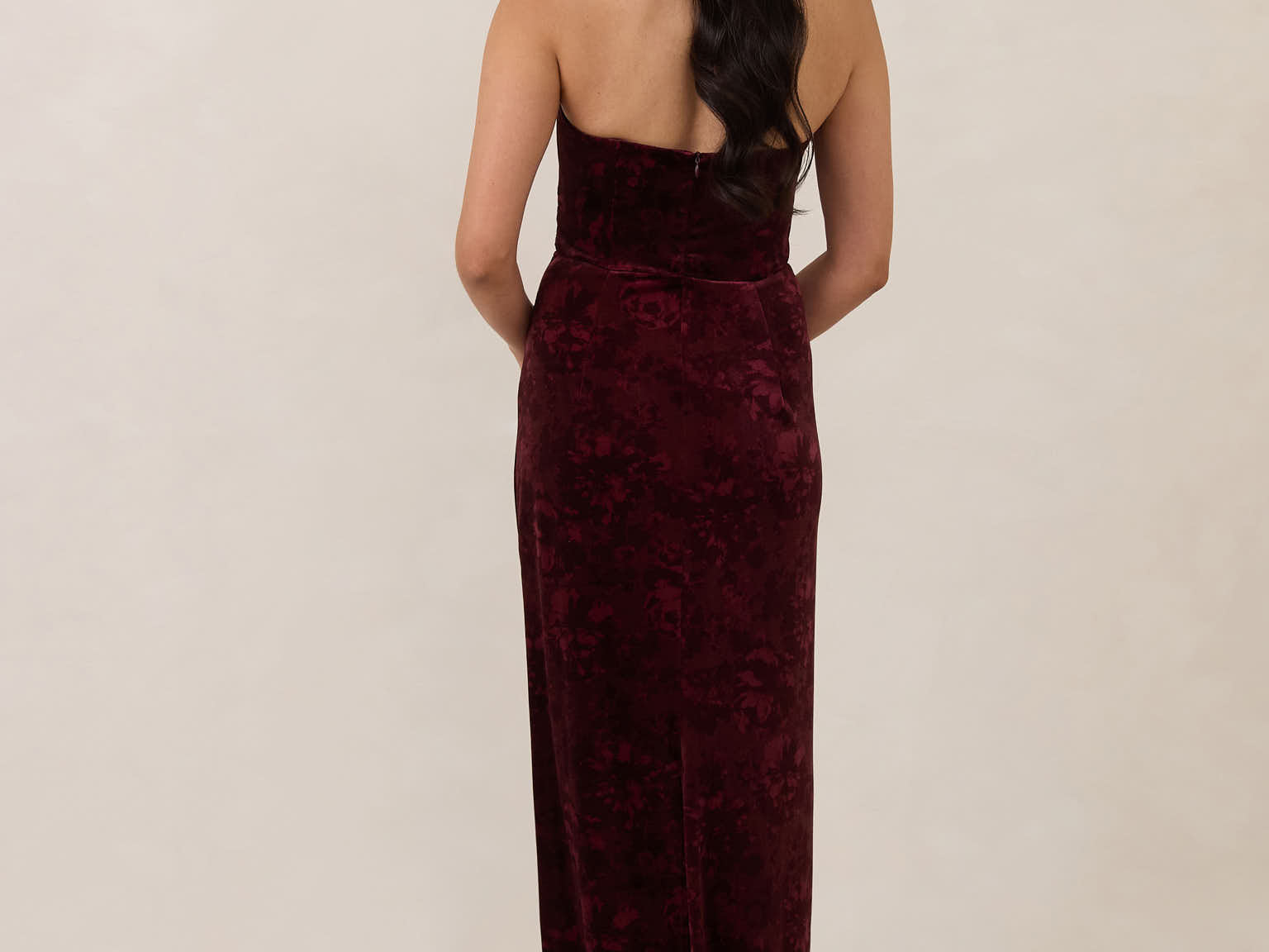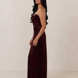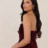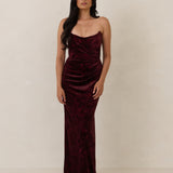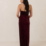 Designed from plush velvet for a touch of opulence, this strapless dress features a soft scoop neckline and a boned bodice for a structured, flattering fit. The bias-cut skirt skims the body, creating a smooth, elongating silhouette, while a subtle back slit adds ease of movement and a hint of allure.