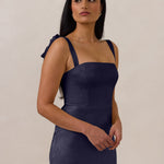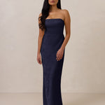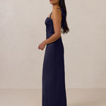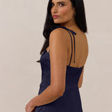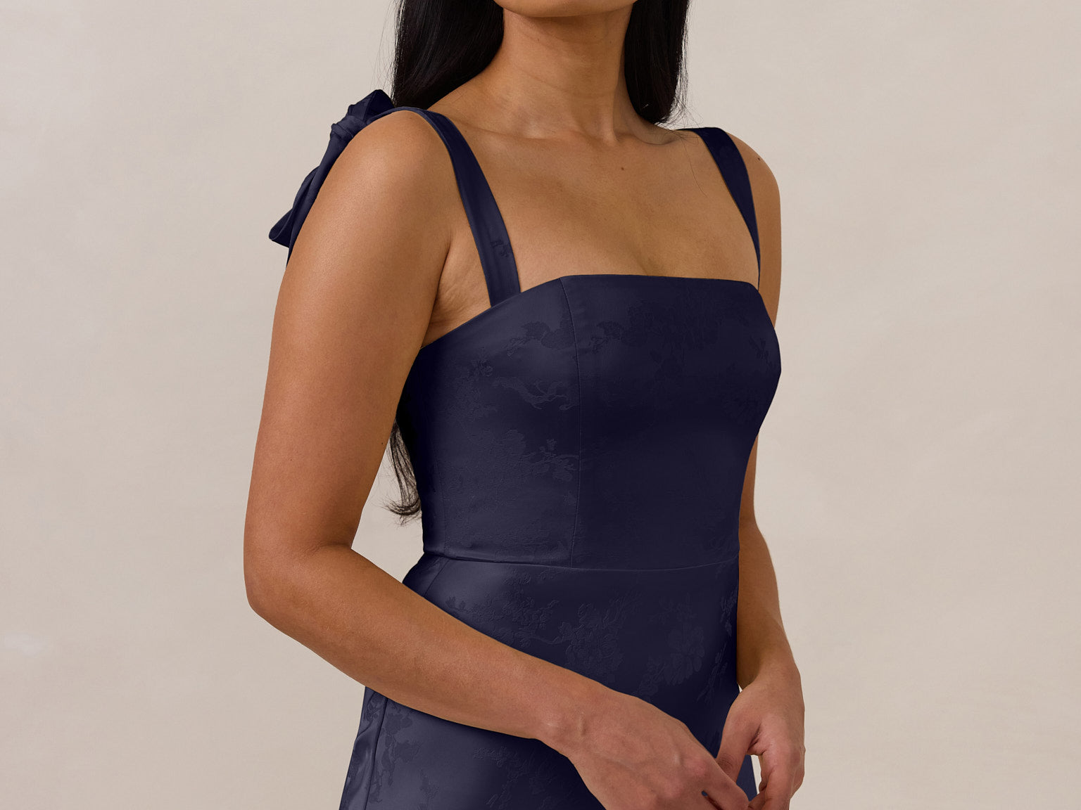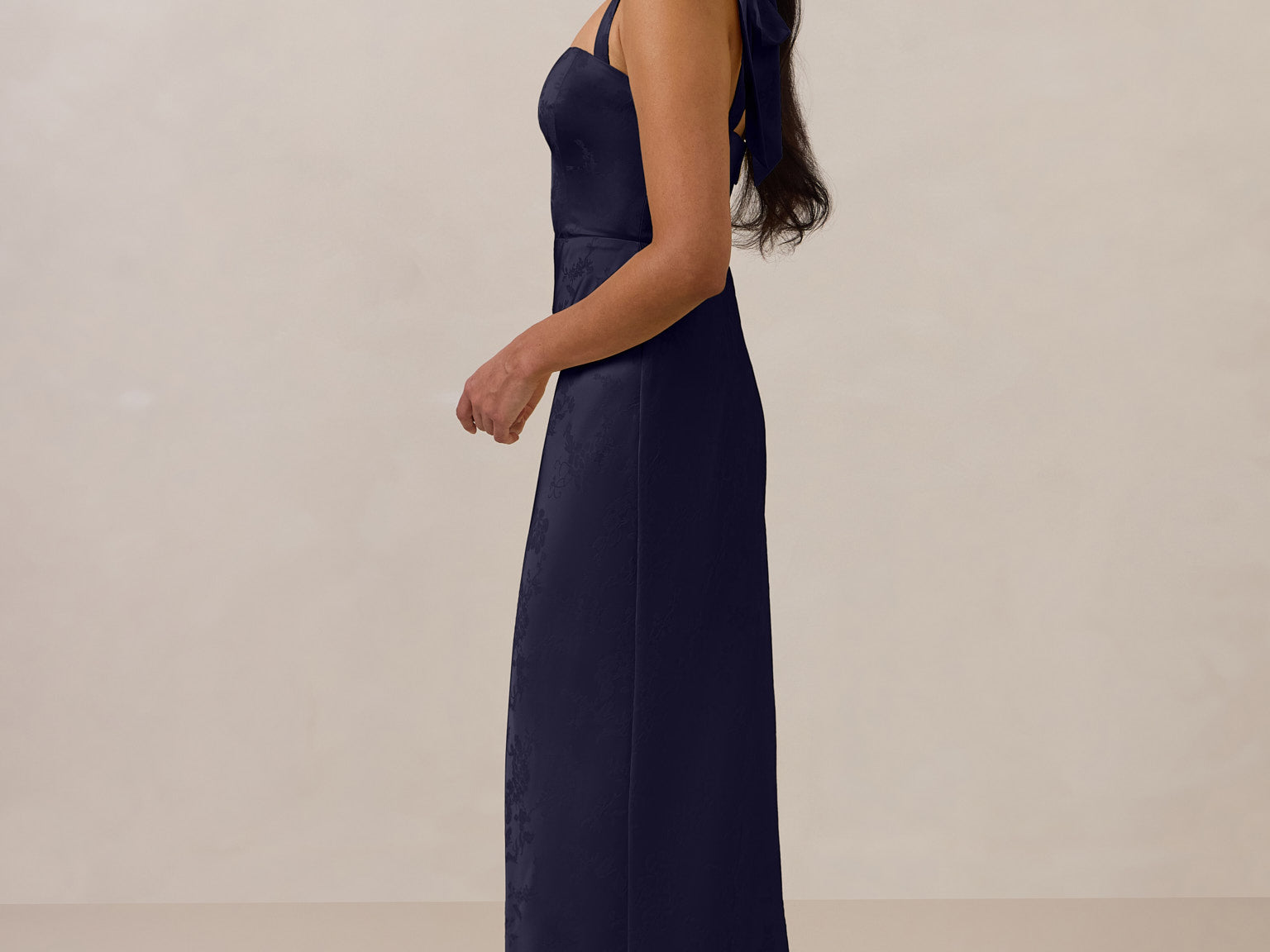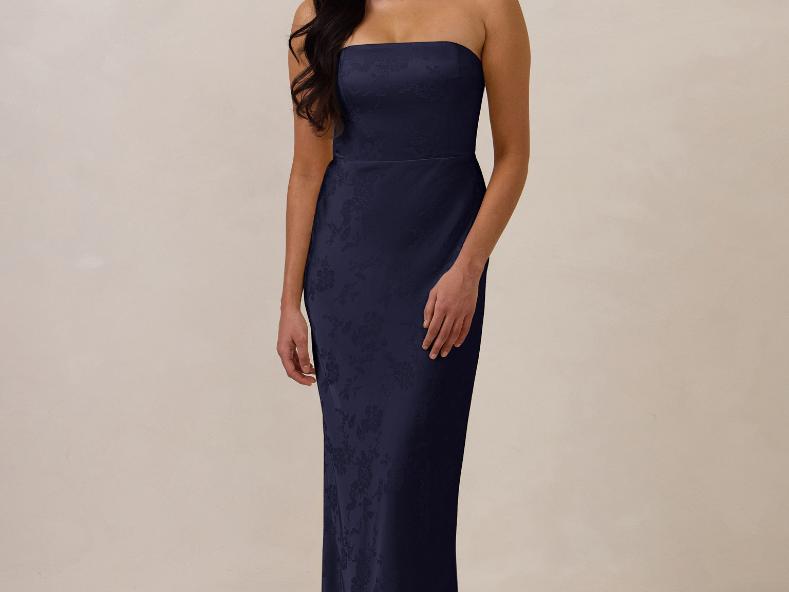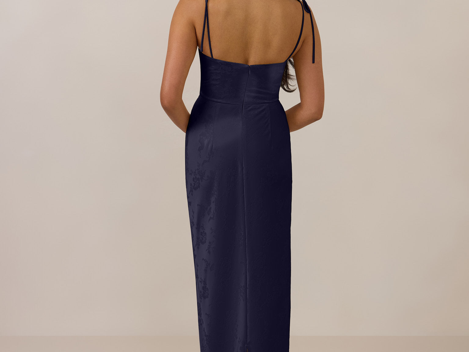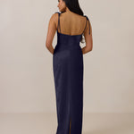 The convertible Meridian dress offers understated sophistication with a floor-grazing silhouette and a back slit for graceful movement. Featuring a structured bodice for a sculpted fit, the design includes interchangeable straps that can be styled thin, thick, or strapless. This versatile and elegant piece is designed to provide quiet confidence for any occasion.