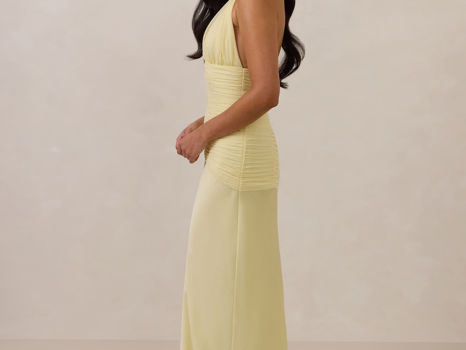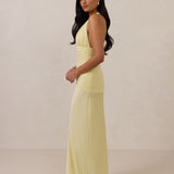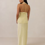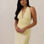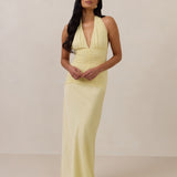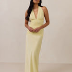 The Monroe is a modern halter dress cut in stretch chiffon and bubble satin for a balance of texture and structure. The bodice features a gathered chiffon overlay that contours the waist, while a bias-cut satin skirt drapes effortlessly for a smooth, flattering fit. Finished with a halter neckline secured by two buttons at the back and a discreet center-back zipper, this piece is designed for ease and movement while maintaining a polished silhouette.