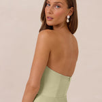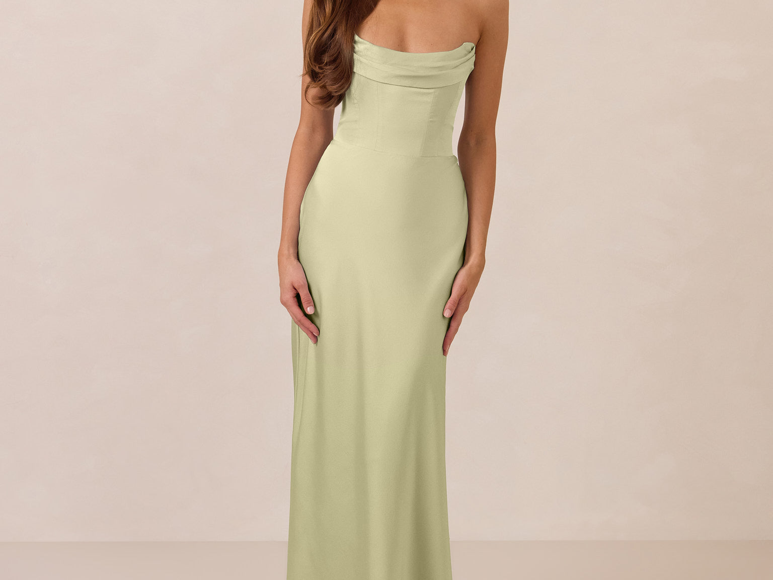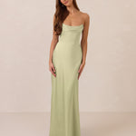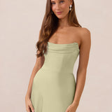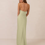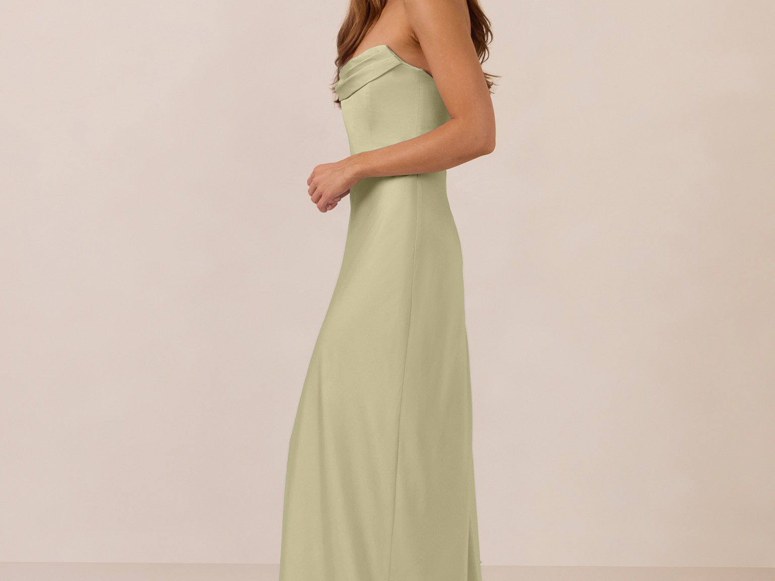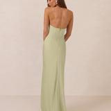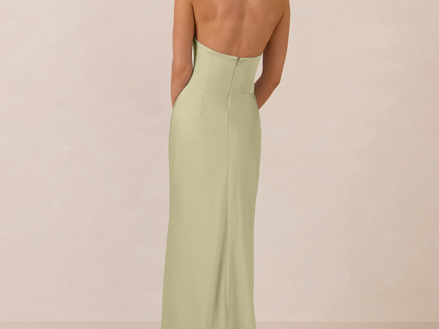 An elegant strapless design with a modern edge, this dress features an exaggerated pointed neckline and a boned bodice for a structured, flattering fit. The bias-cut skirt creates a smooth, elongating silhouette, while the full-length design makes it perfect for galas and formal occasions.