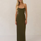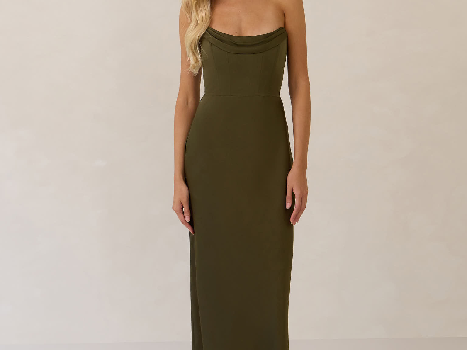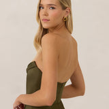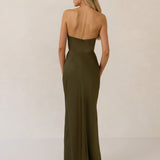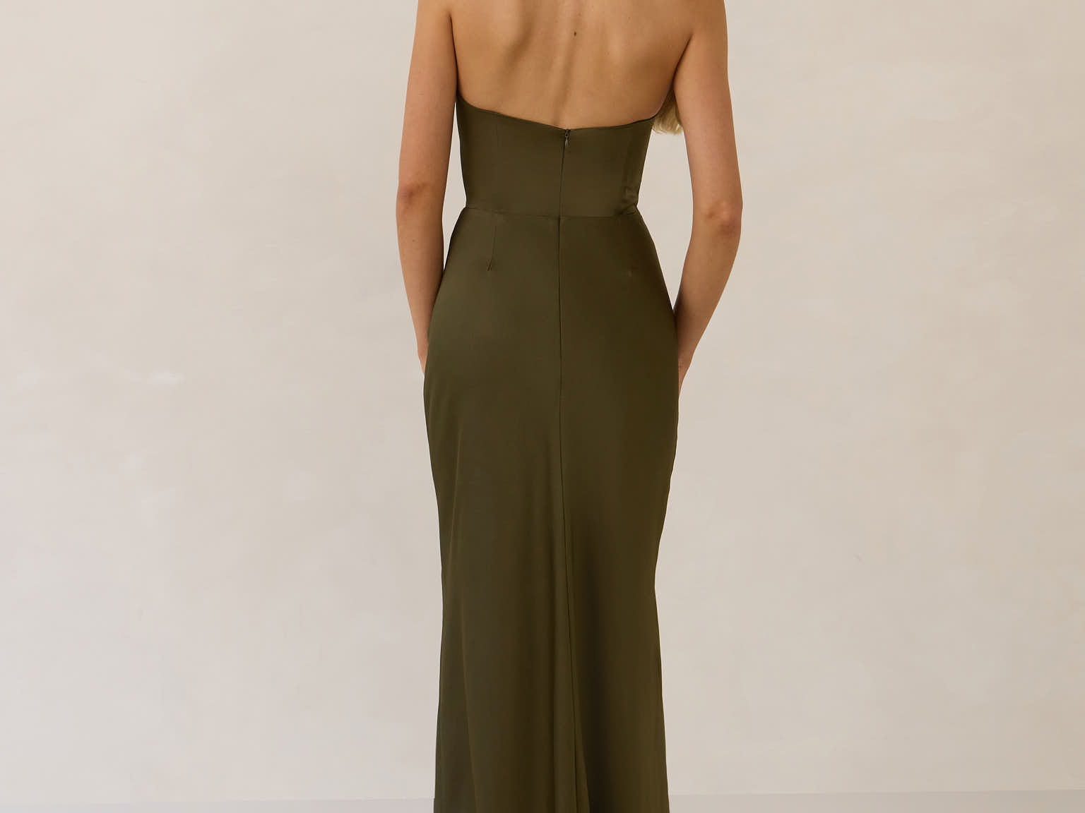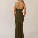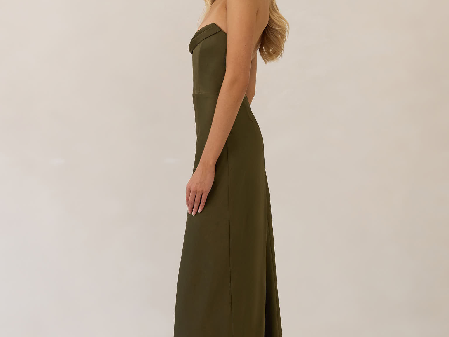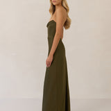 An elegant strapless design with a modern edge, this dress features an exaggerated pointed neckline and a boned bodice for a structured, flattering fit. The bias-cut skirt creates a smooth, elongating silhouette, while the full-length design makes it perfect for galas and formal occasions.