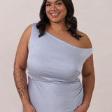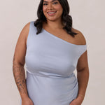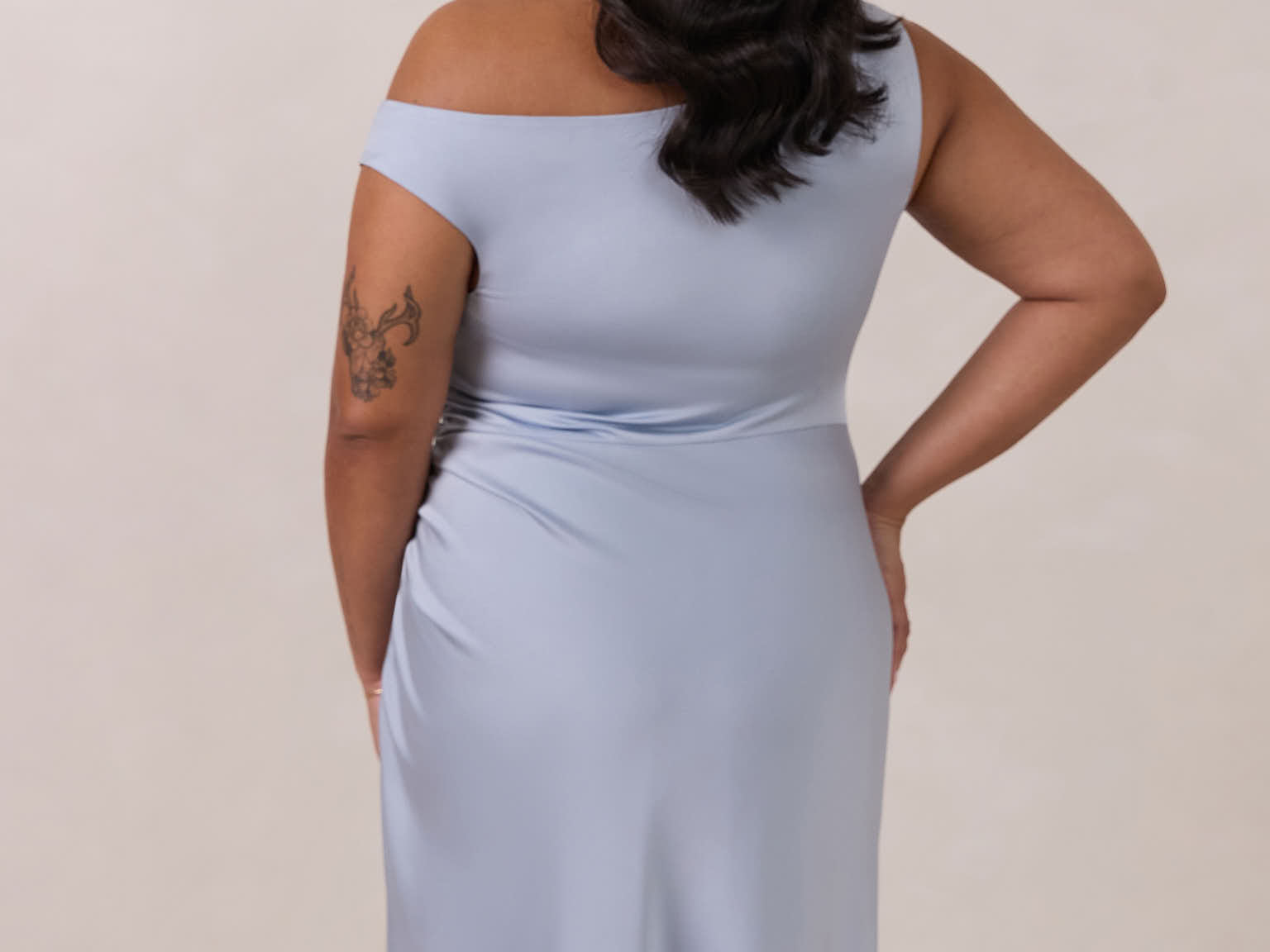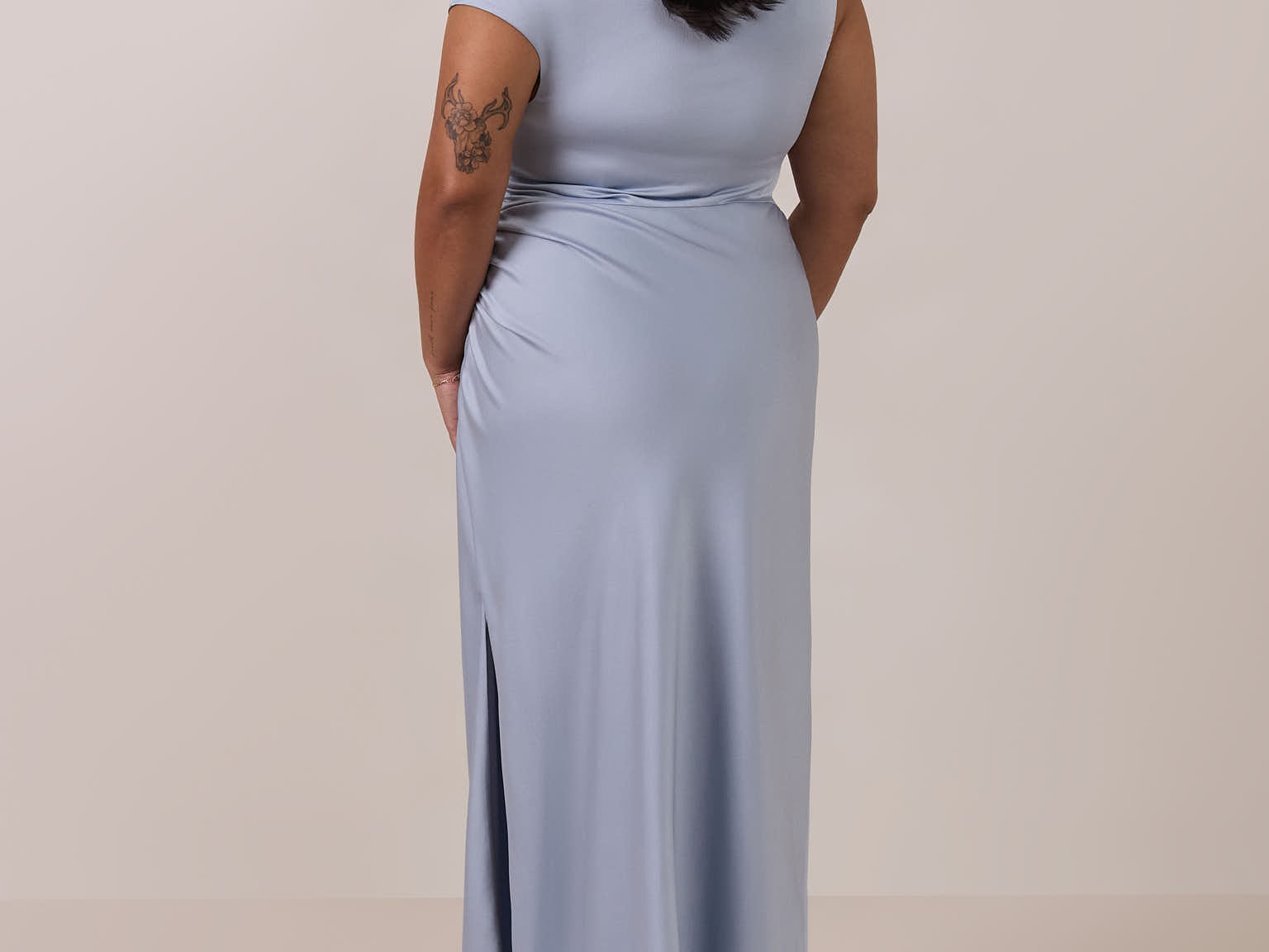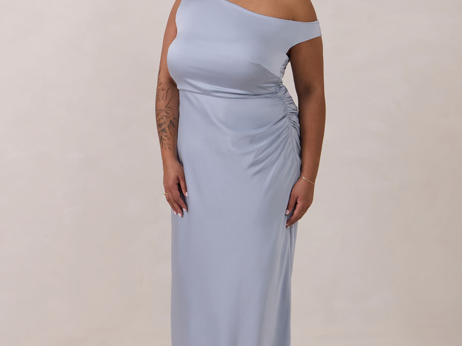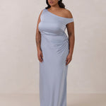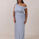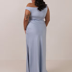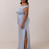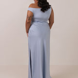We love an asymmetrical neckline. This full-length dress strikes the perfect balance between modern sophistication and a flattering fit with its elegant silhouette, slightly gathered bodice, and a stylish side slit for a touch of effortless elegance.